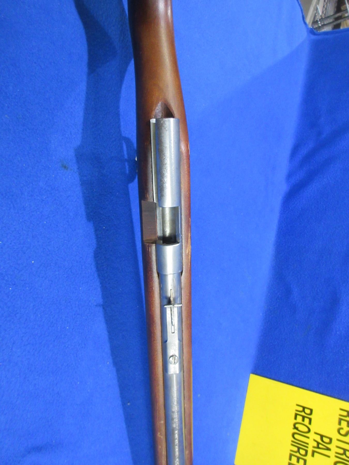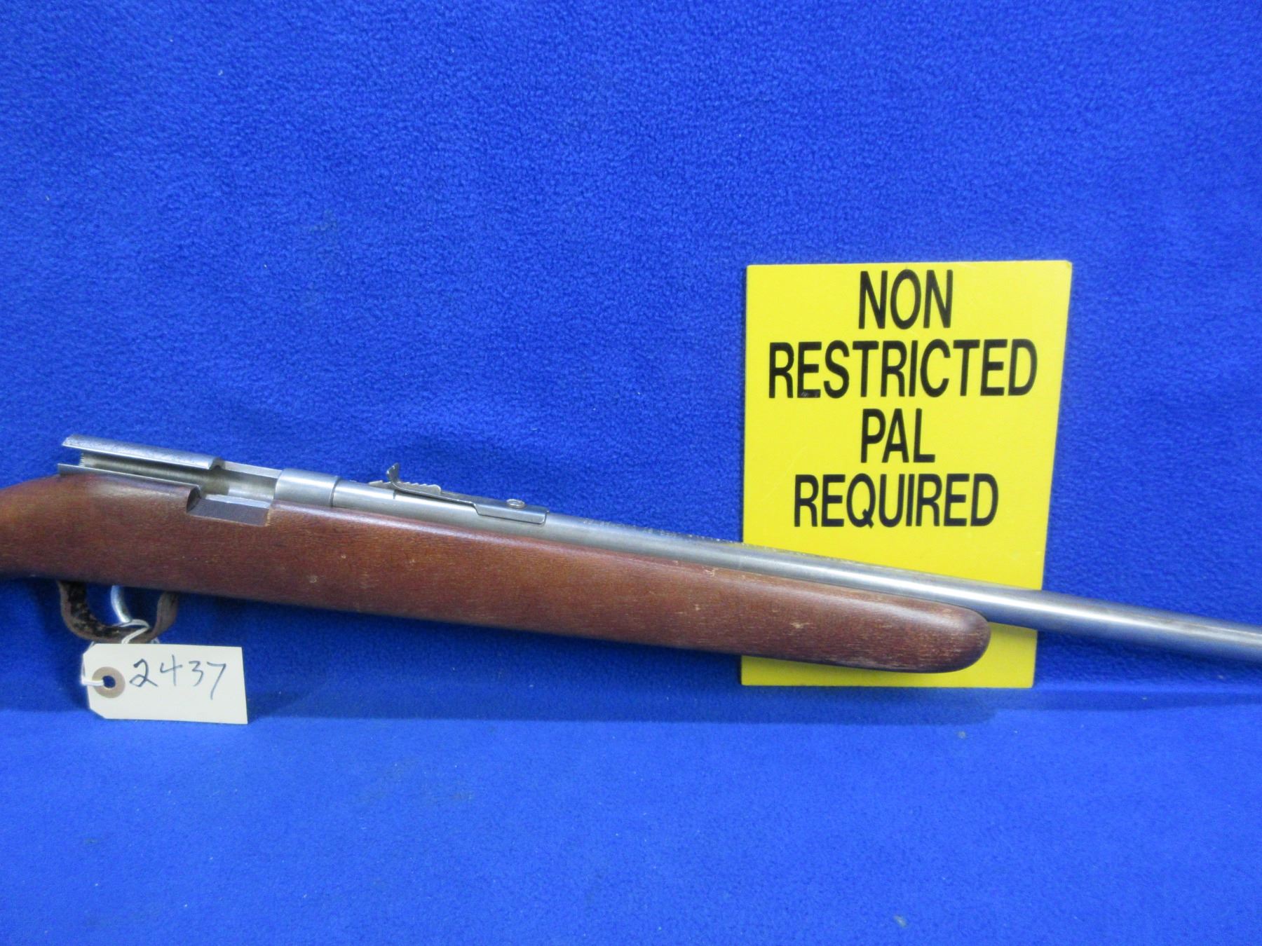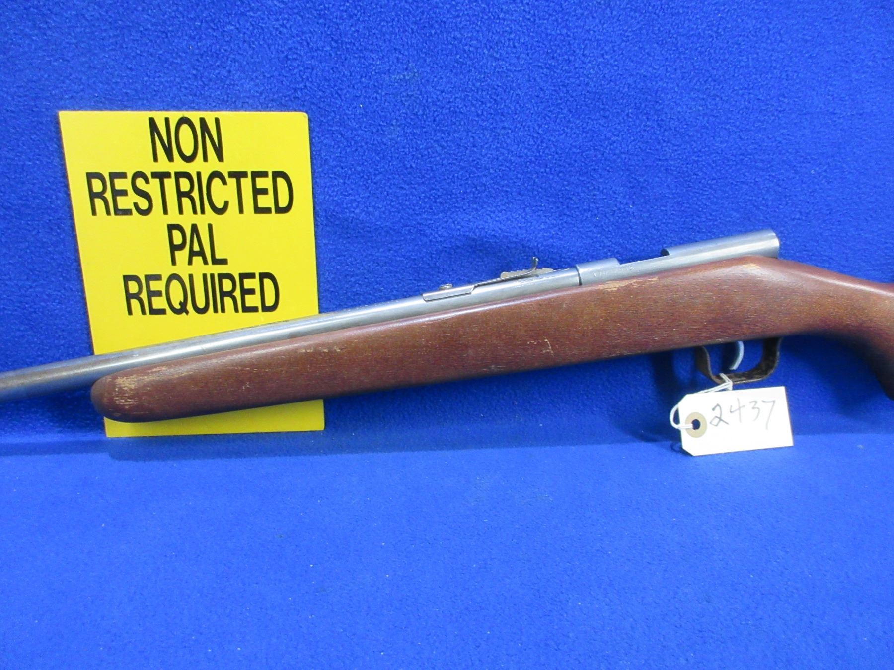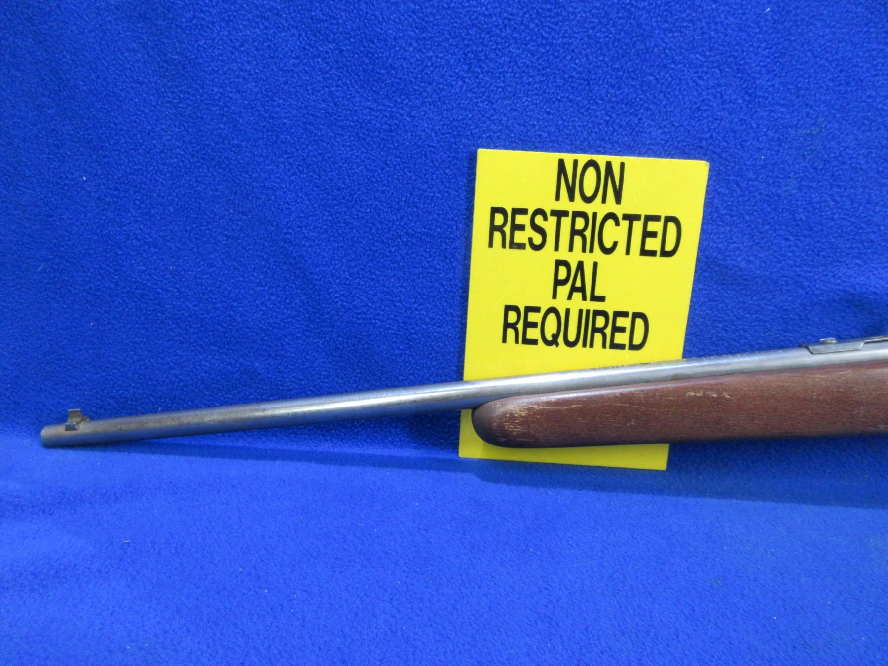 Non-Restricted - Cooey Model 39 in 22 LR - This is a single shot bolt action rifle, action appears to be in working order but bolt is missing. Barrel is 22", rifling is fair as barrel is ringed, bluing is gone, has both sights, stock is good to very good with finish flaking, length of pull is 12 1/2", butt plate good. Ser # None