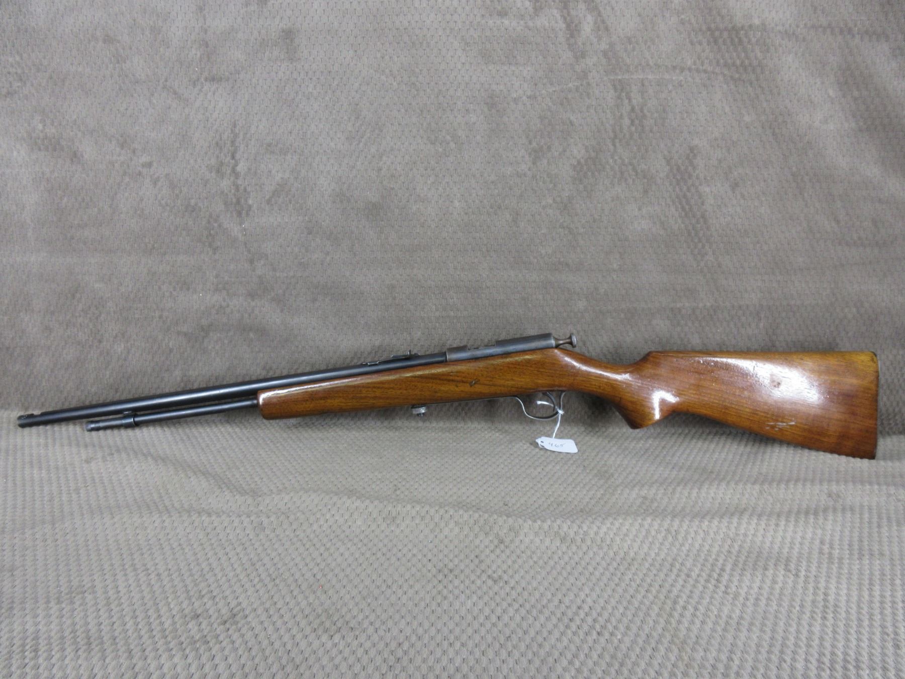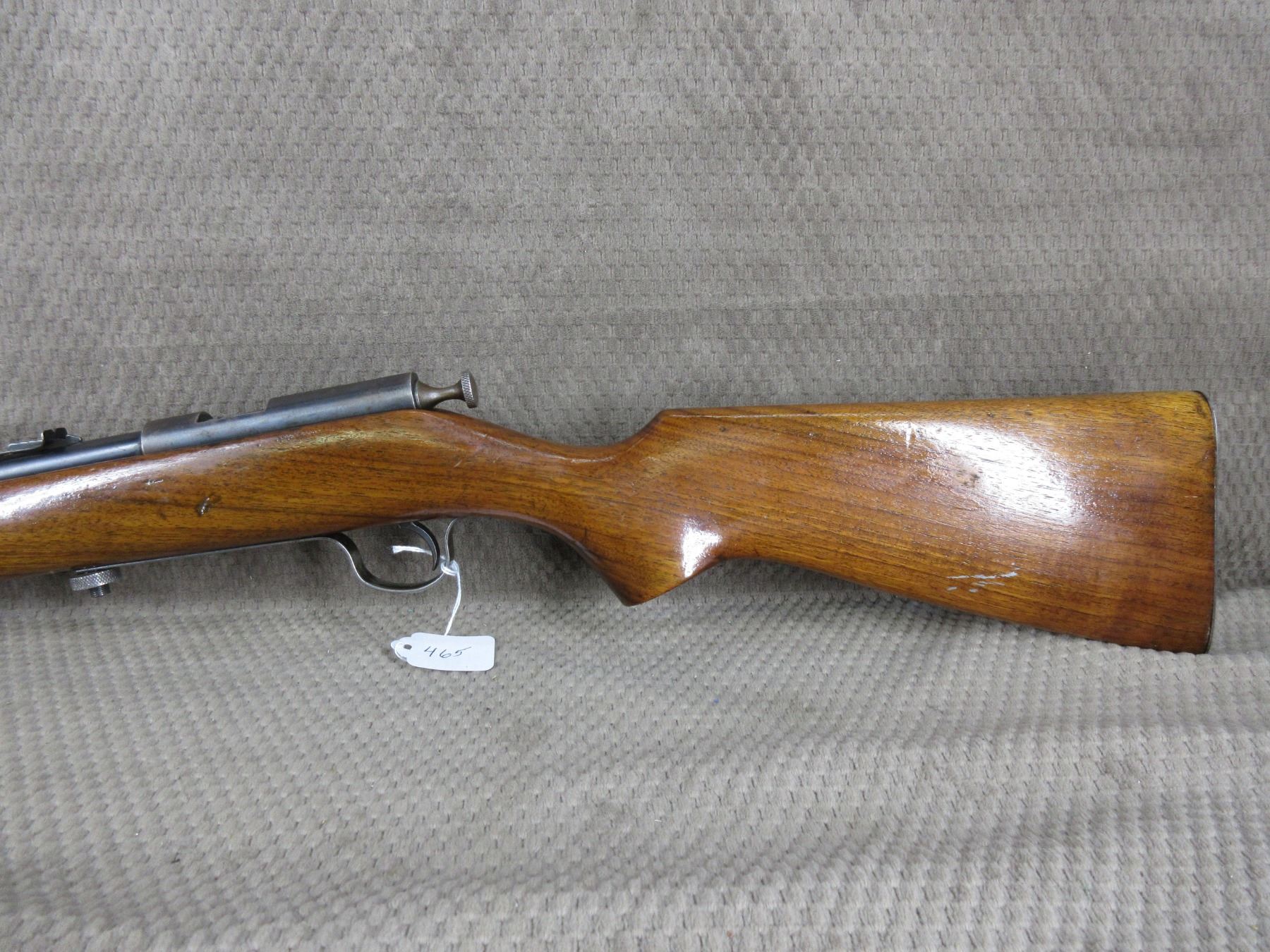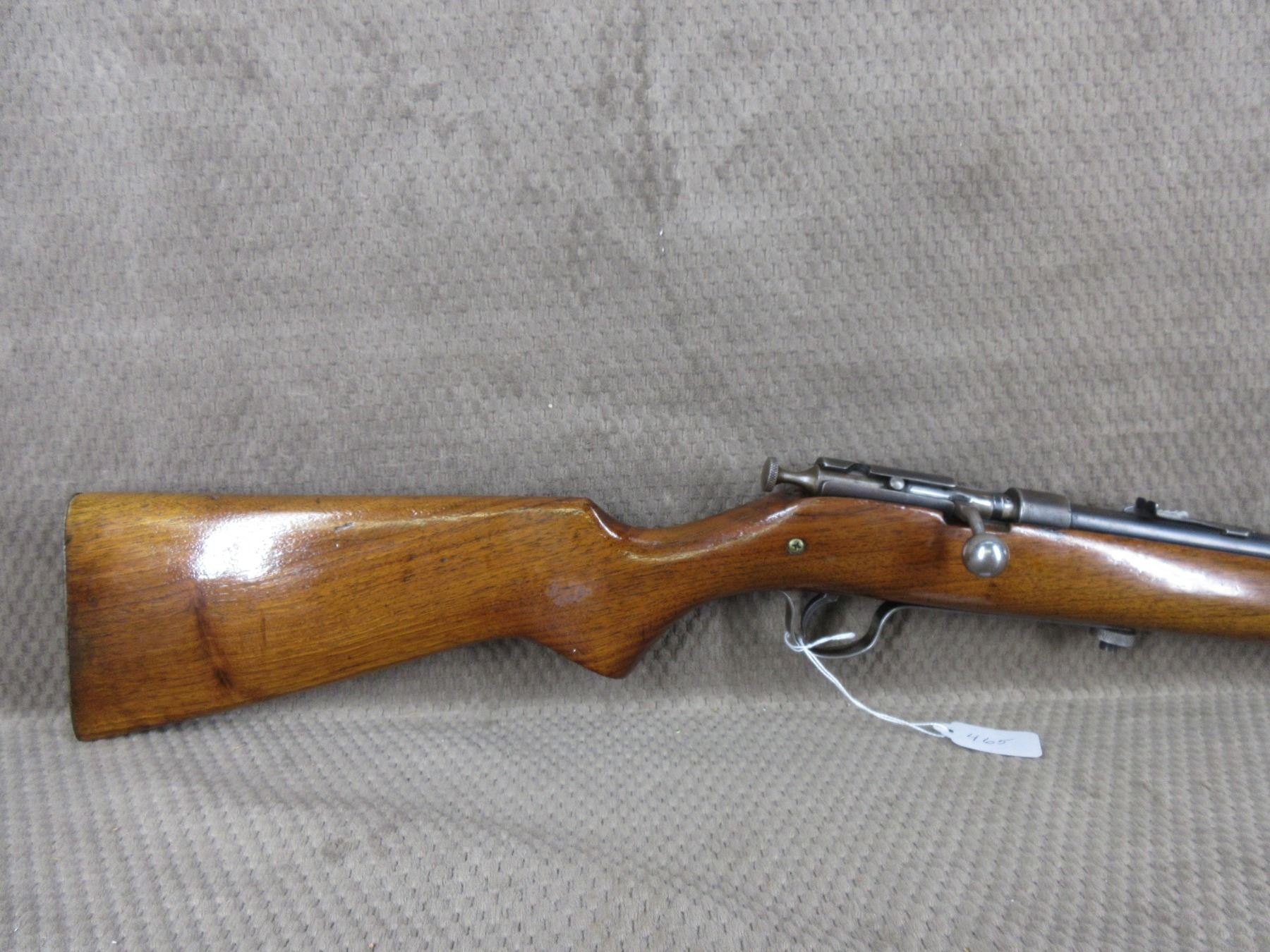 Non-Restricted - Cooey Model 60 in 22 Cal. No Markings on Barrel or Action to Identify - This bolt action tube magazine rifle appears to be in good working order. Barrel is 20", rifling is very good, bluing is good, missing front sight has rear sight, stock has wrist repair and appears refinished, metal butt plate. Barrel may have been replaced.