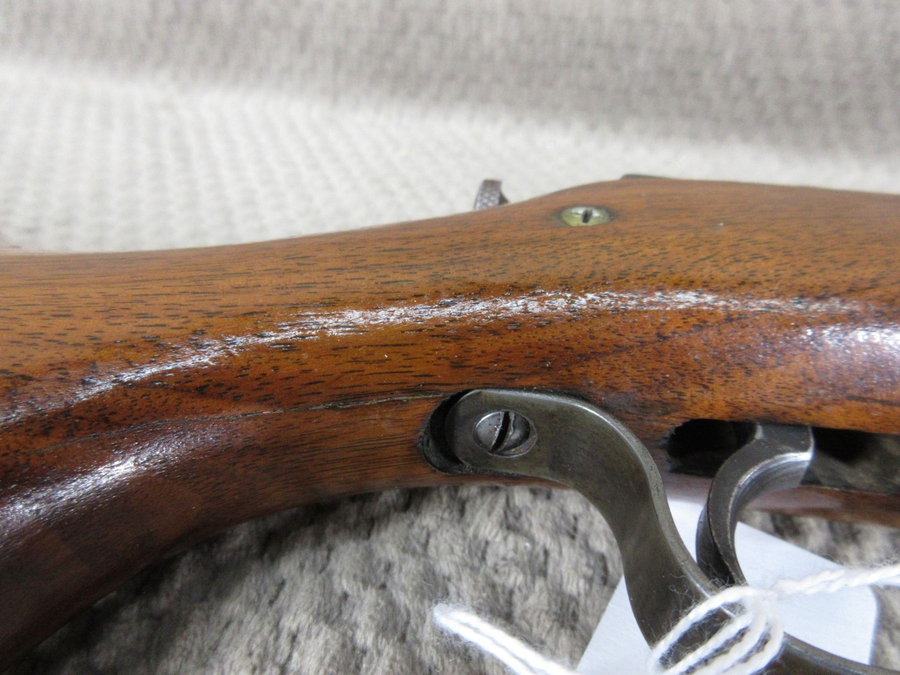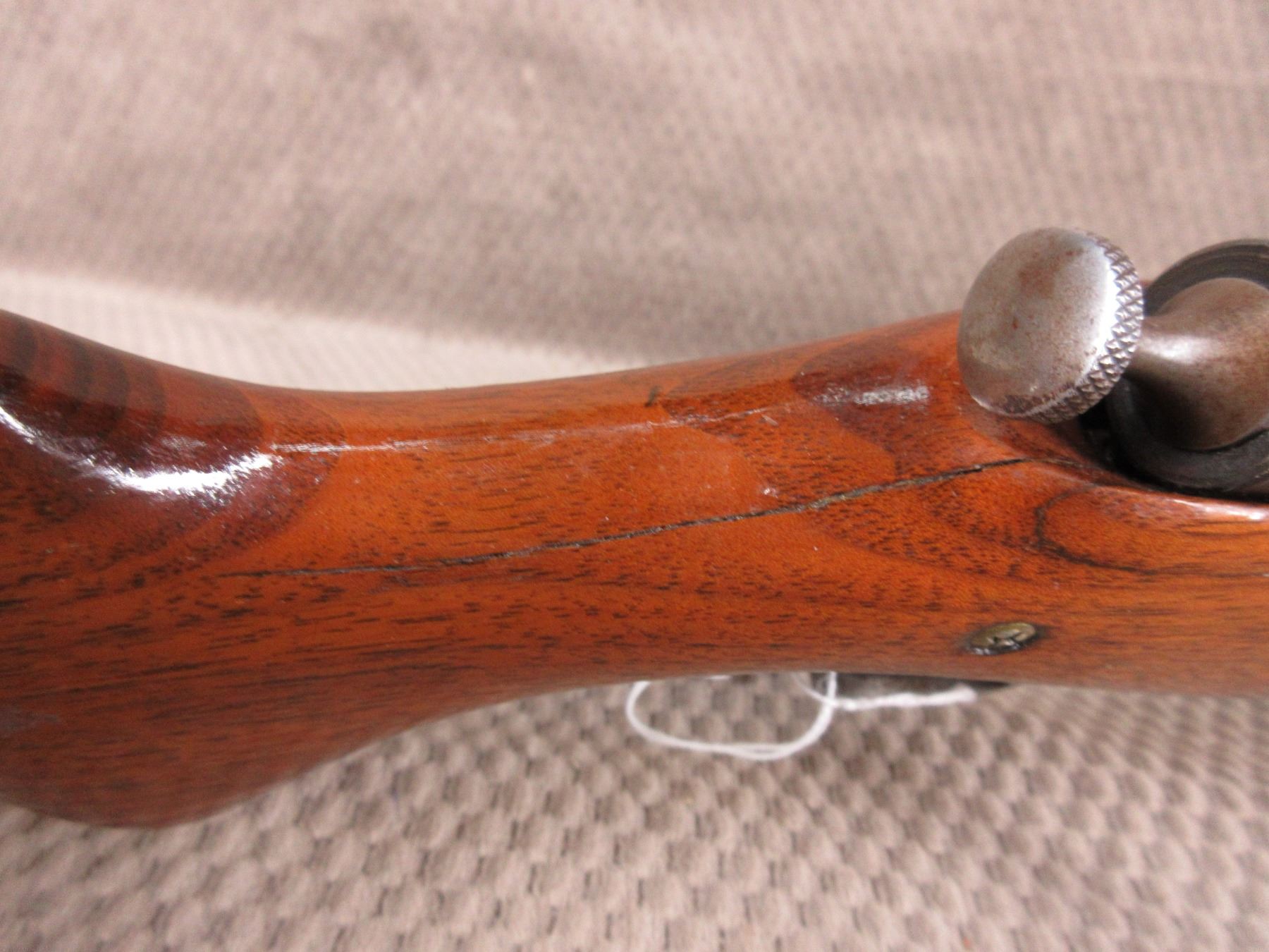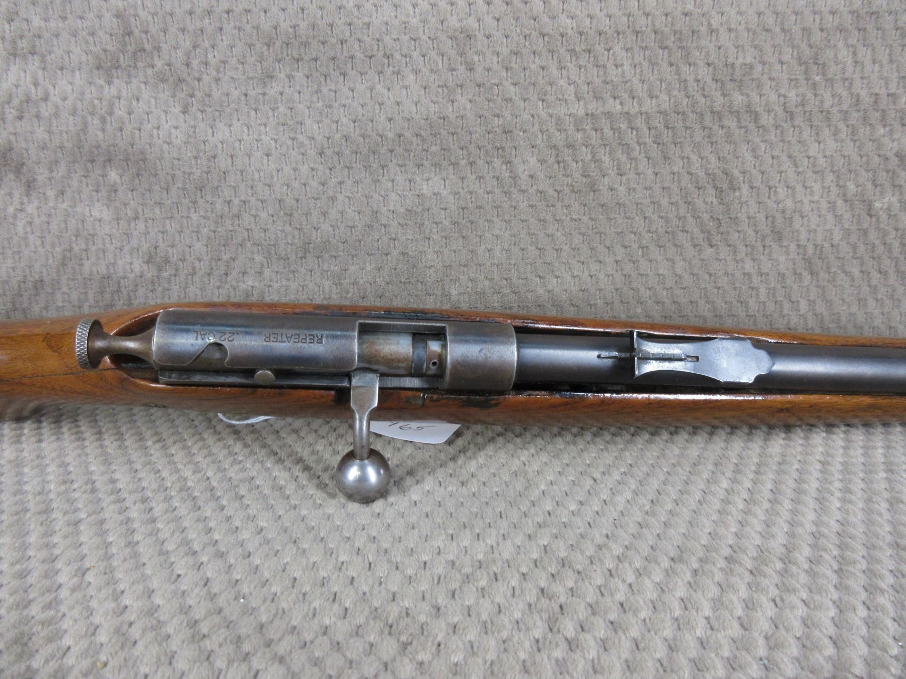 Non-Restricted - Cooey Model 60 in 22 Cal. No Markings on Barrel or Action to Identify - This bolt action tube magazine rifle appears to be in good working order. Barrel is 20", rifling is very good, bluing is good, missing front sight has rear sight, stock has wrist repair and appears refinished, metal butt plate. Barrel may have been replaced.