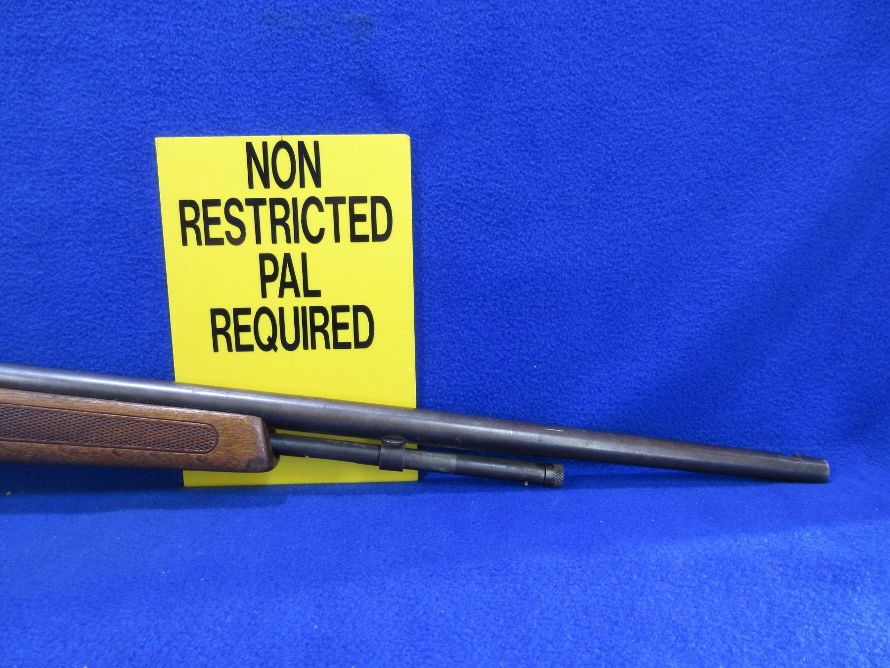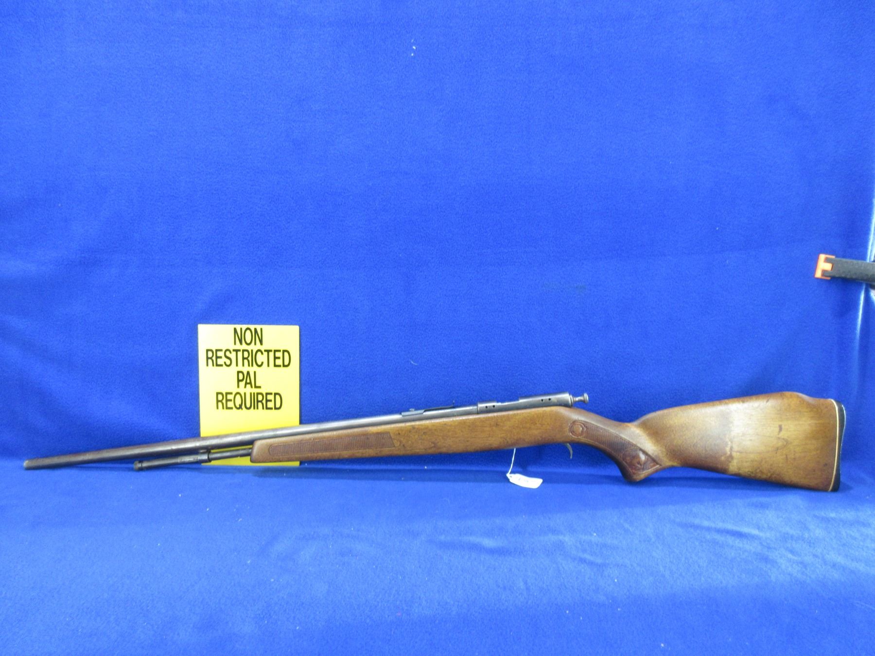 Non-Restricted - Cooey Model 600 in 22 LR - This bolt action rifle with tube magazine appears to be in good working order but the trigger guard is missing. Barrel is 24", rifling is good to very good, bluing is mostly gone and turning brown, missing front sight, has rear sight but is missing the ramp, stock fair to good as it has a crack on top of wrist area, butt plate good. Ser # None