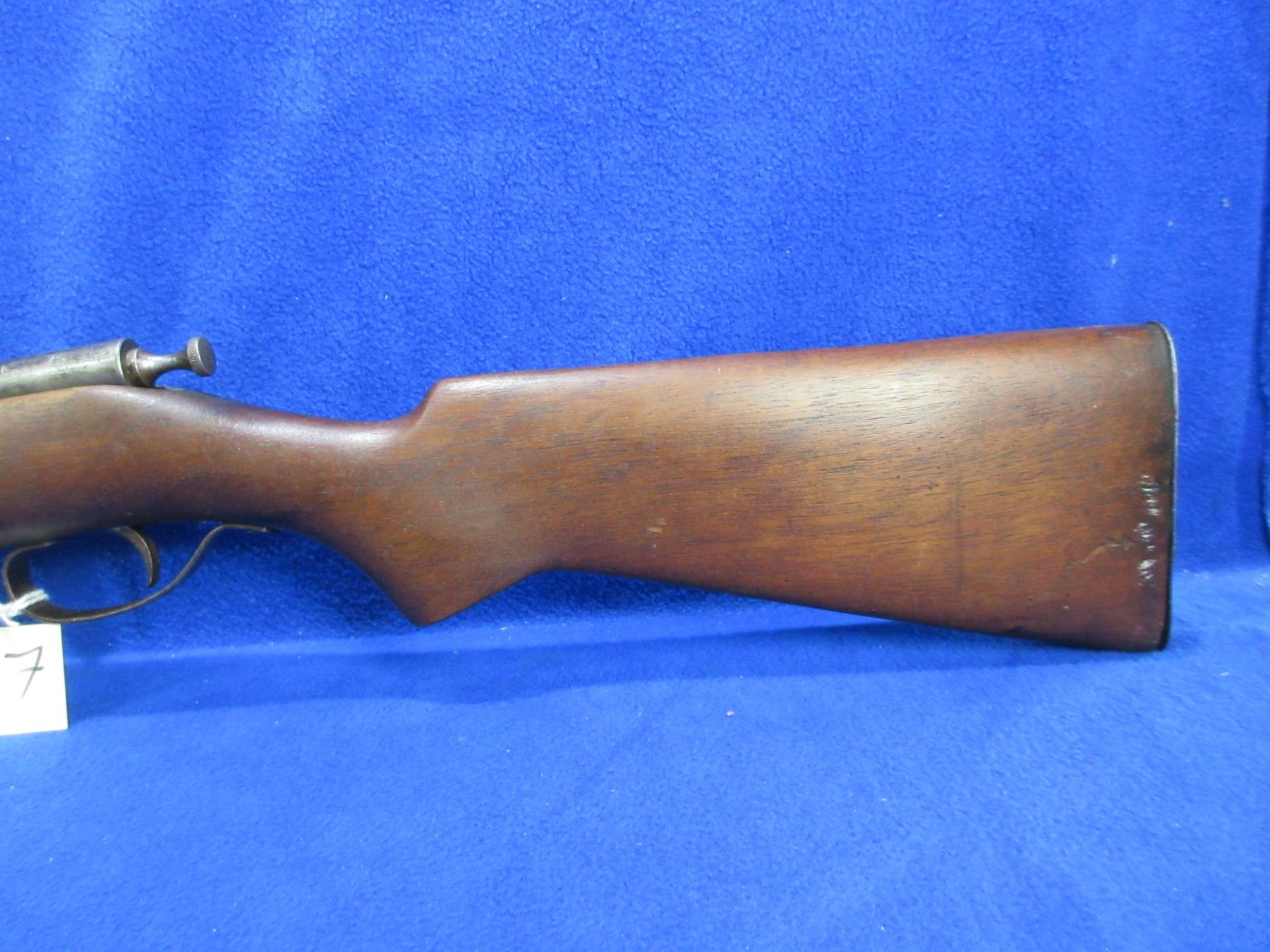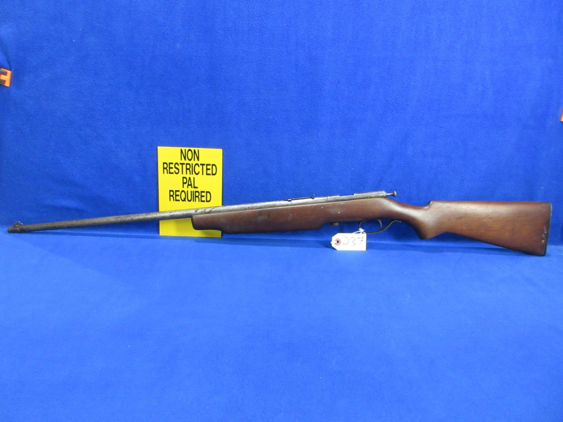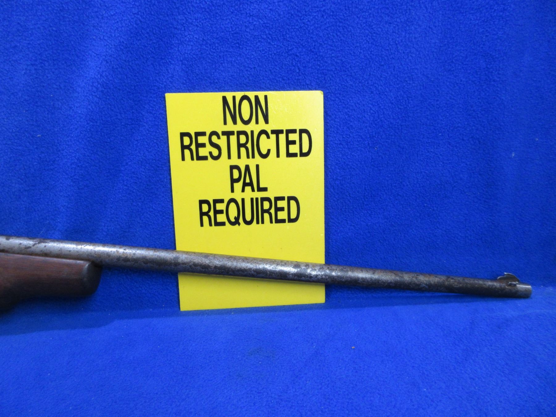 Non-Restricted - Cooey Model 75 in 22 Cal - This single shot bolt action rifle appears to be in working order. Barrel is 27", rifling is good to very good, bluing is gone with rust and pitting, has both sights but the rear ramp is missing, stock is good with usage marks and a name scratched into it, metal butt plate, trigger and trigger guard are rusty. Ser # none