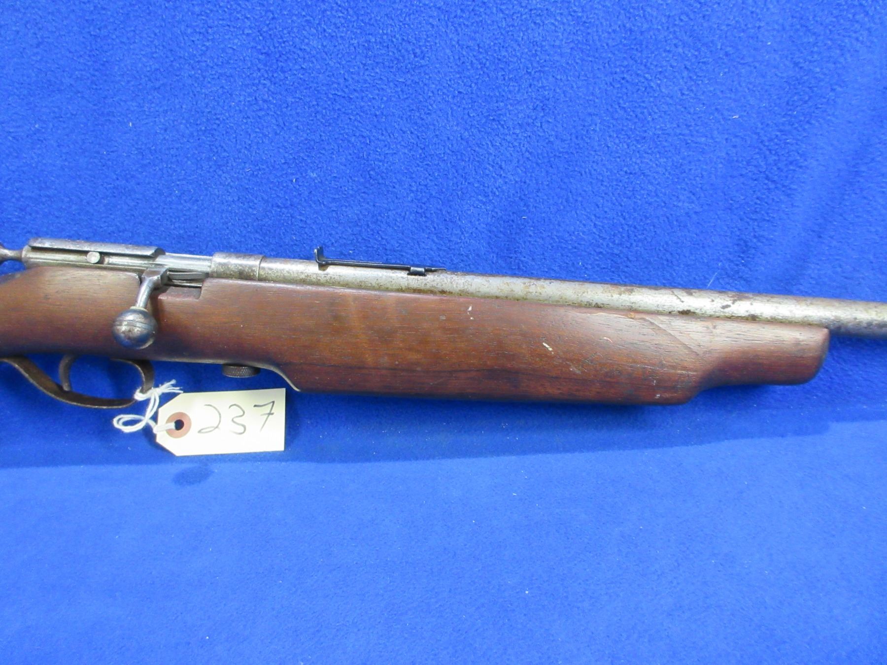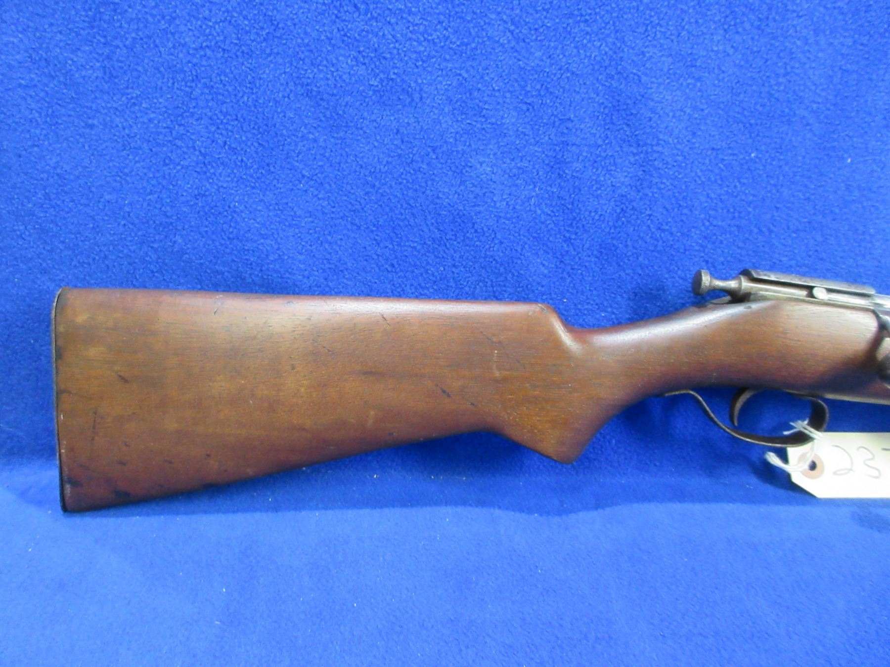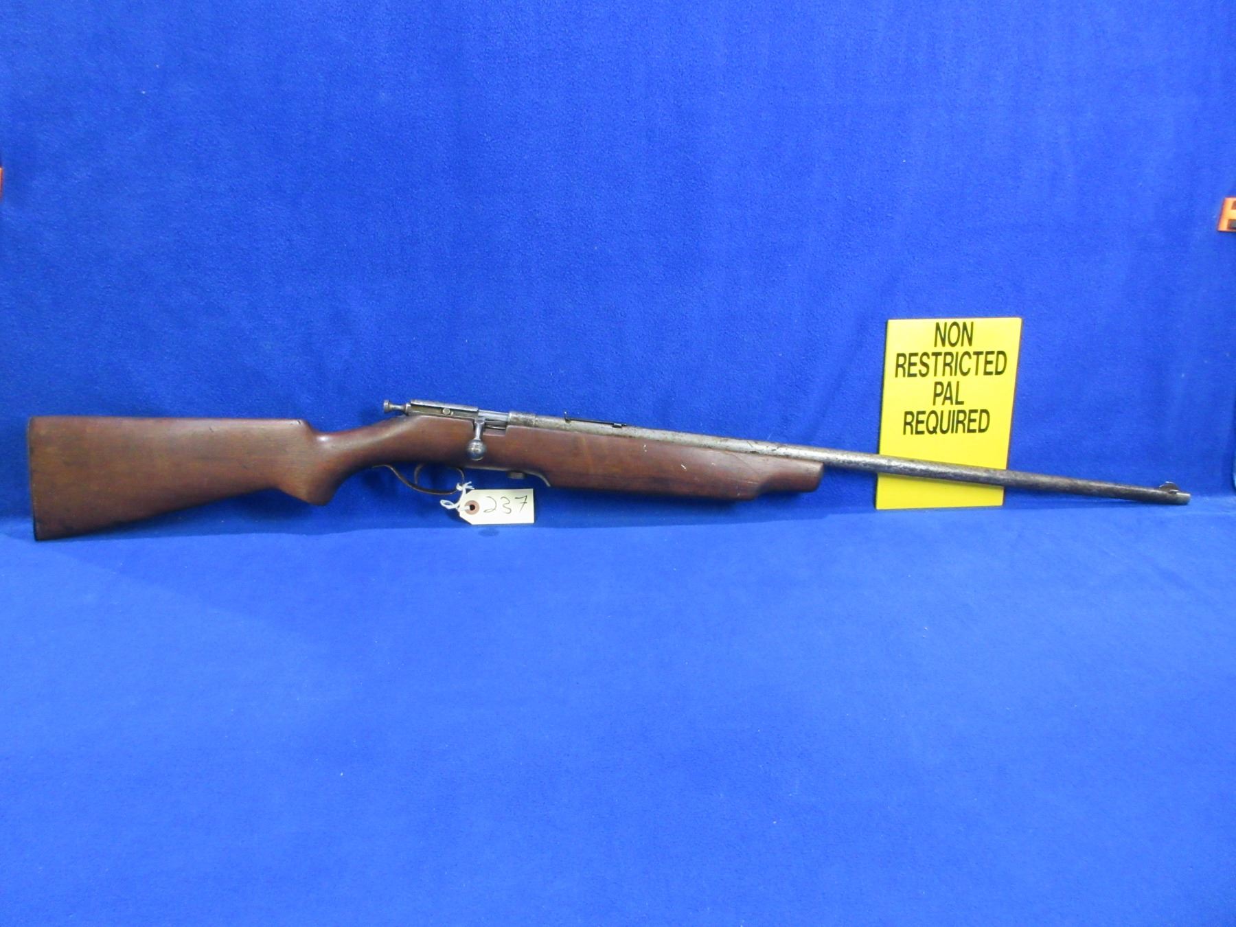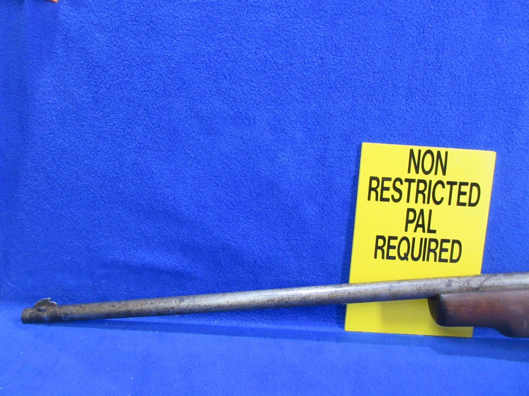 Non-Restricted - Cooey Model 75 in 22 Cal - This single shot bolt action rifle appears to be in working order. Barrel is 27", rifling is good to very good, bluing is gone with rust and pitting, has both sights but the rear ramp is missing, stock is good with usage marks and a name scratched into it, metal butt plate, trigger and trigger guard are rusty. Ser # none