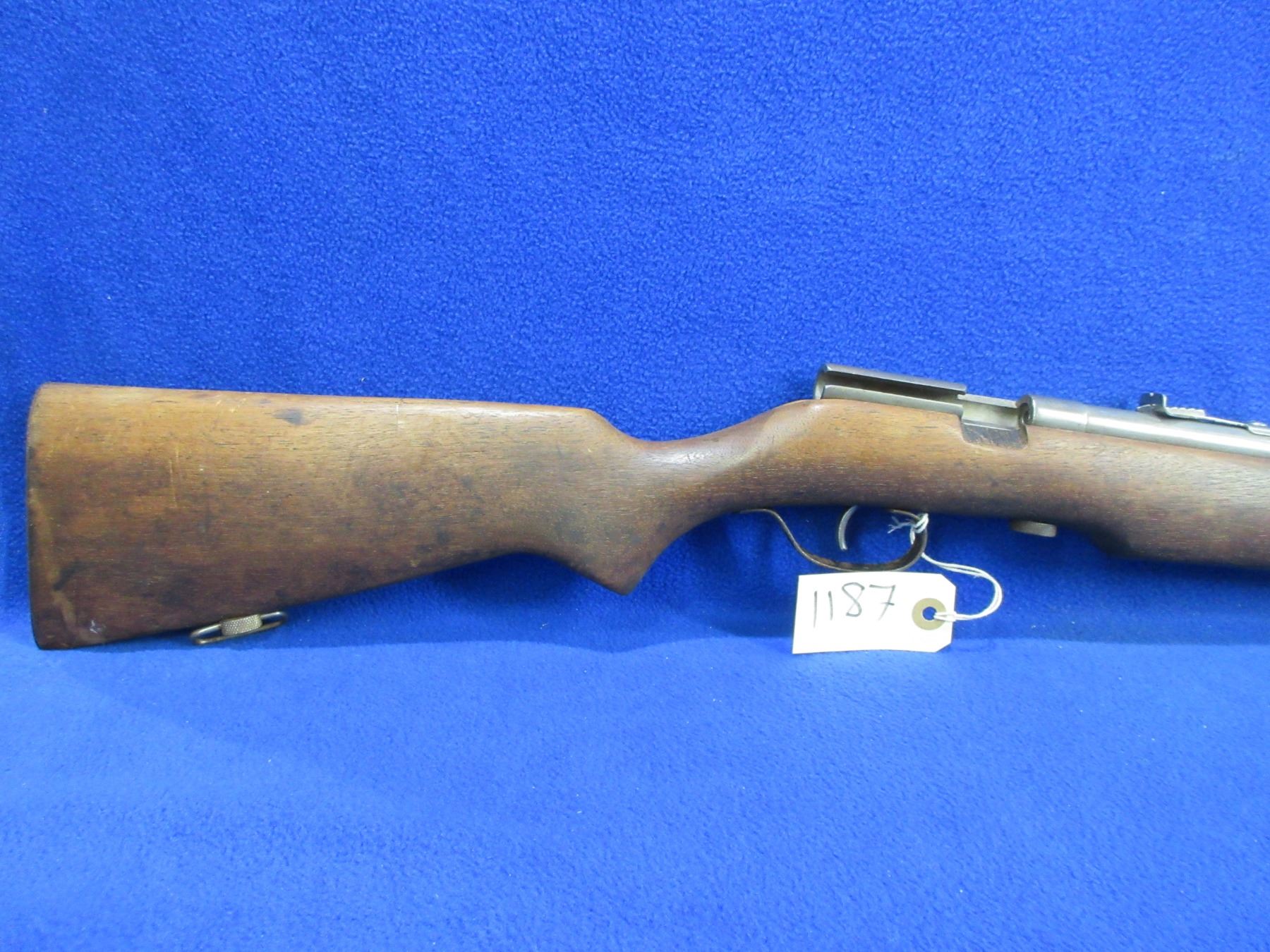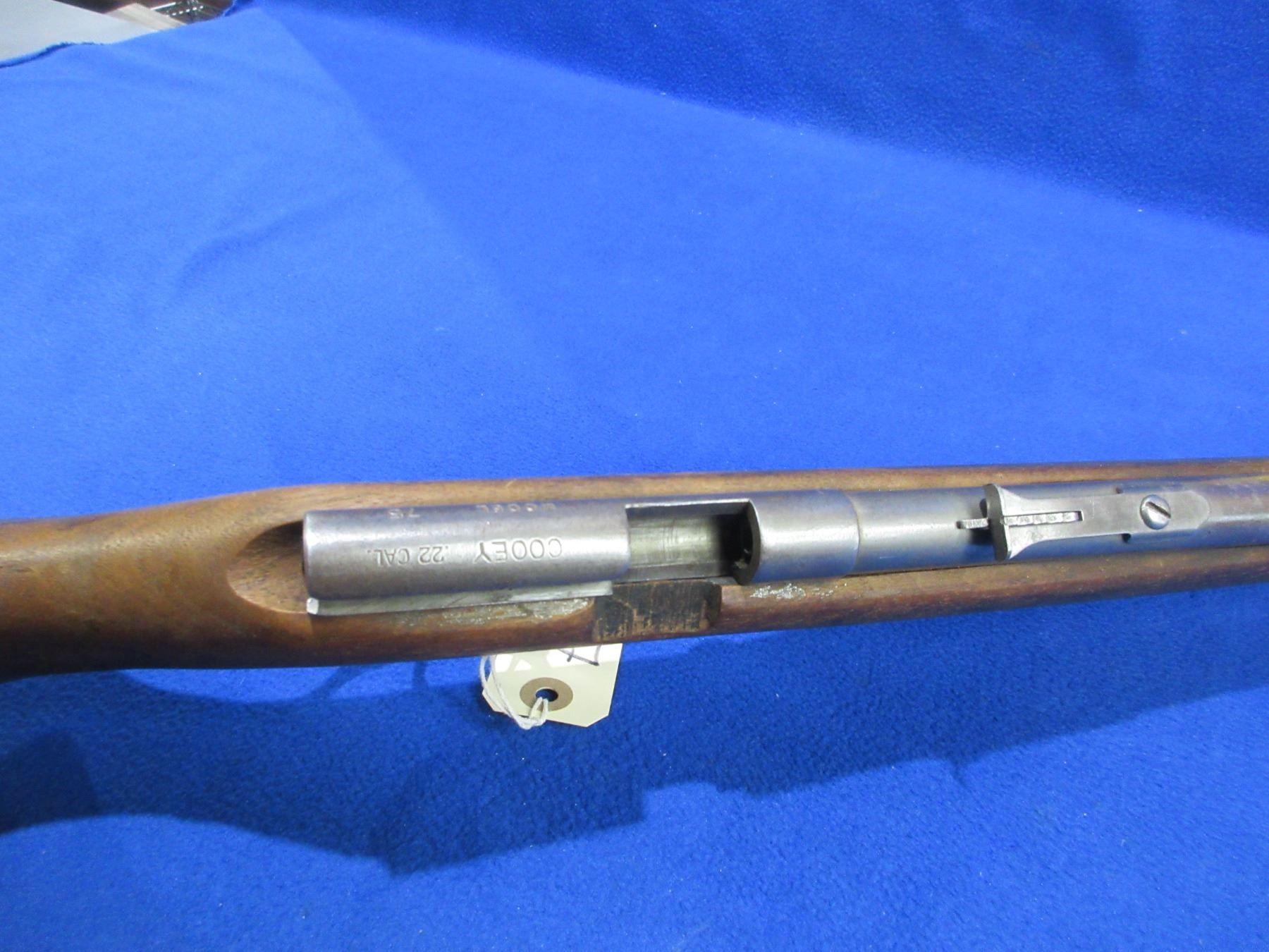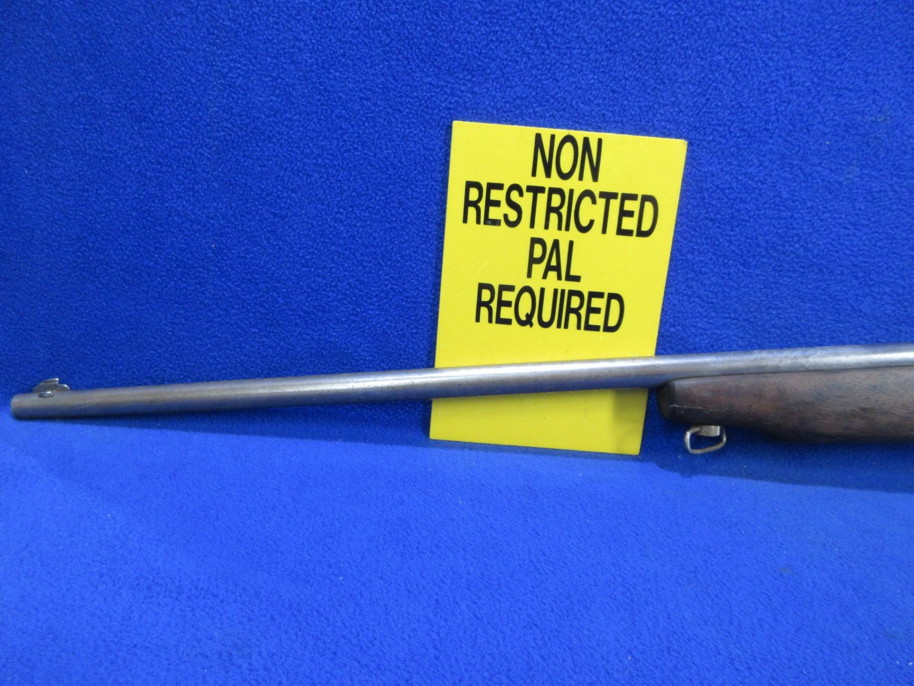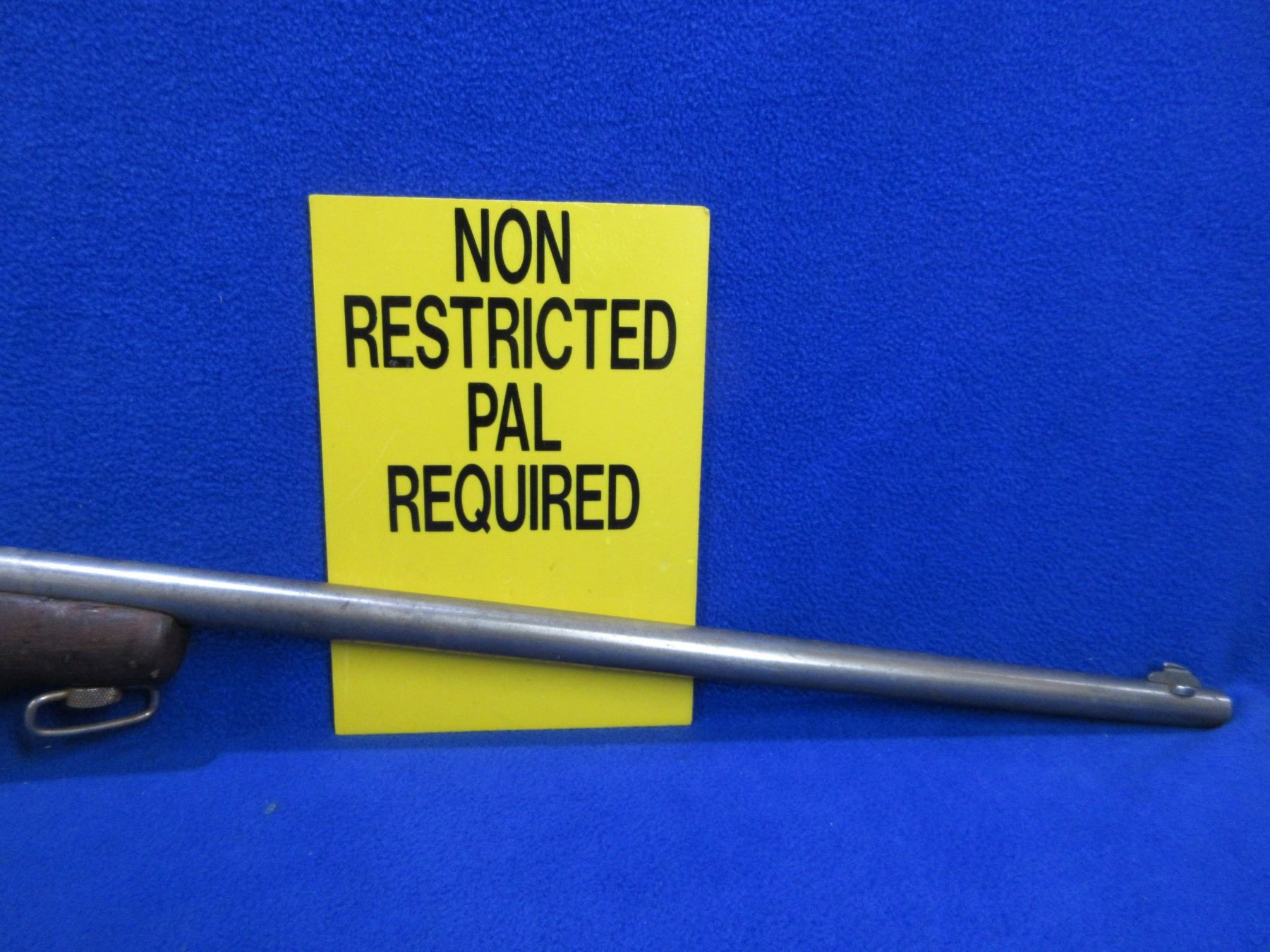 Non-Restricted - Cooey Model 75 in 22 Cal. - This is a single shot bolt action rifle (bolt missing), action is in non working order as bolt is missing. Barrel is 27", rifling is good, bluing is gone, has both sights, stock has a crack repair at the front of the forearm, length of pull is 13 1/4", metal butt plate, comes with swivels. Ser # None
