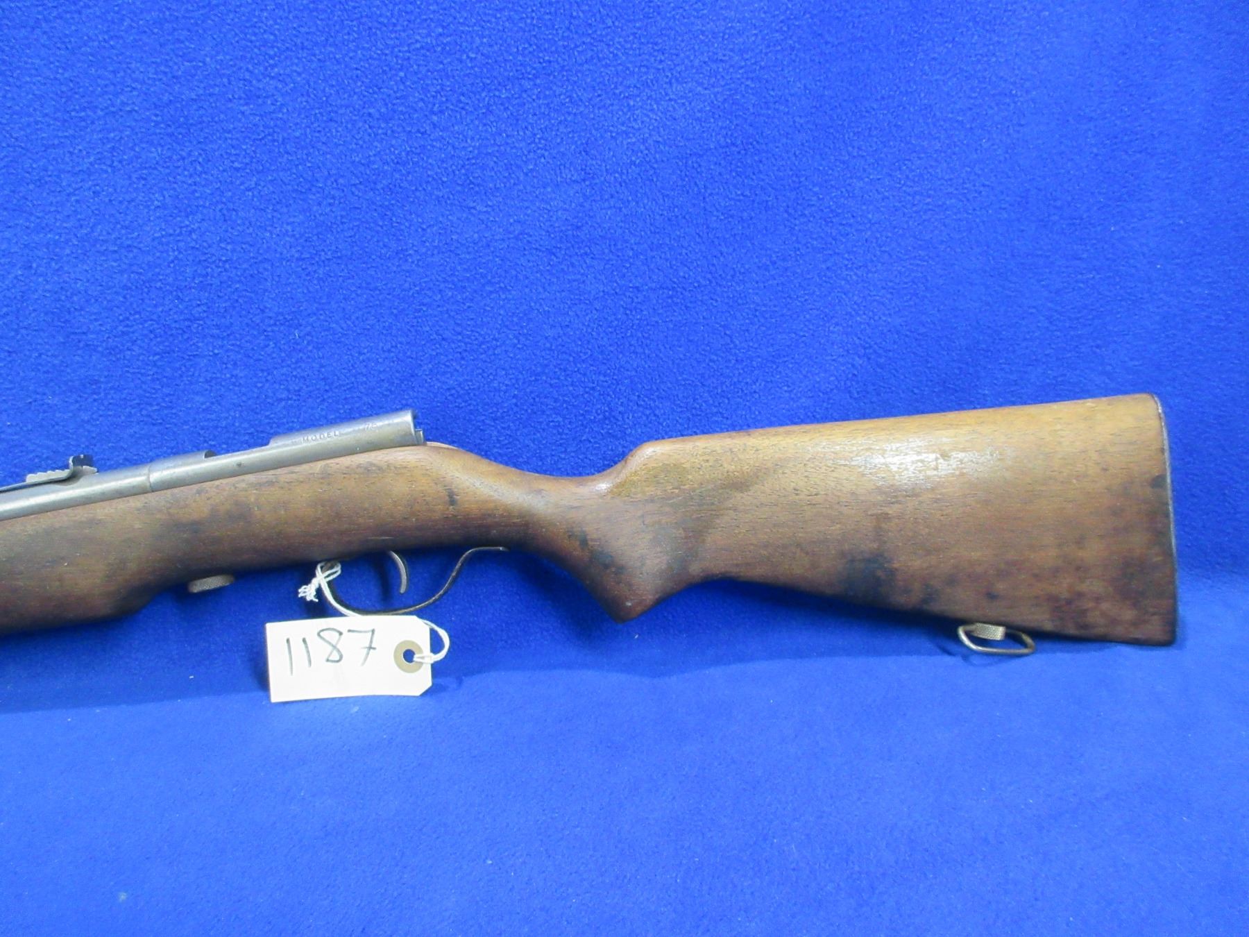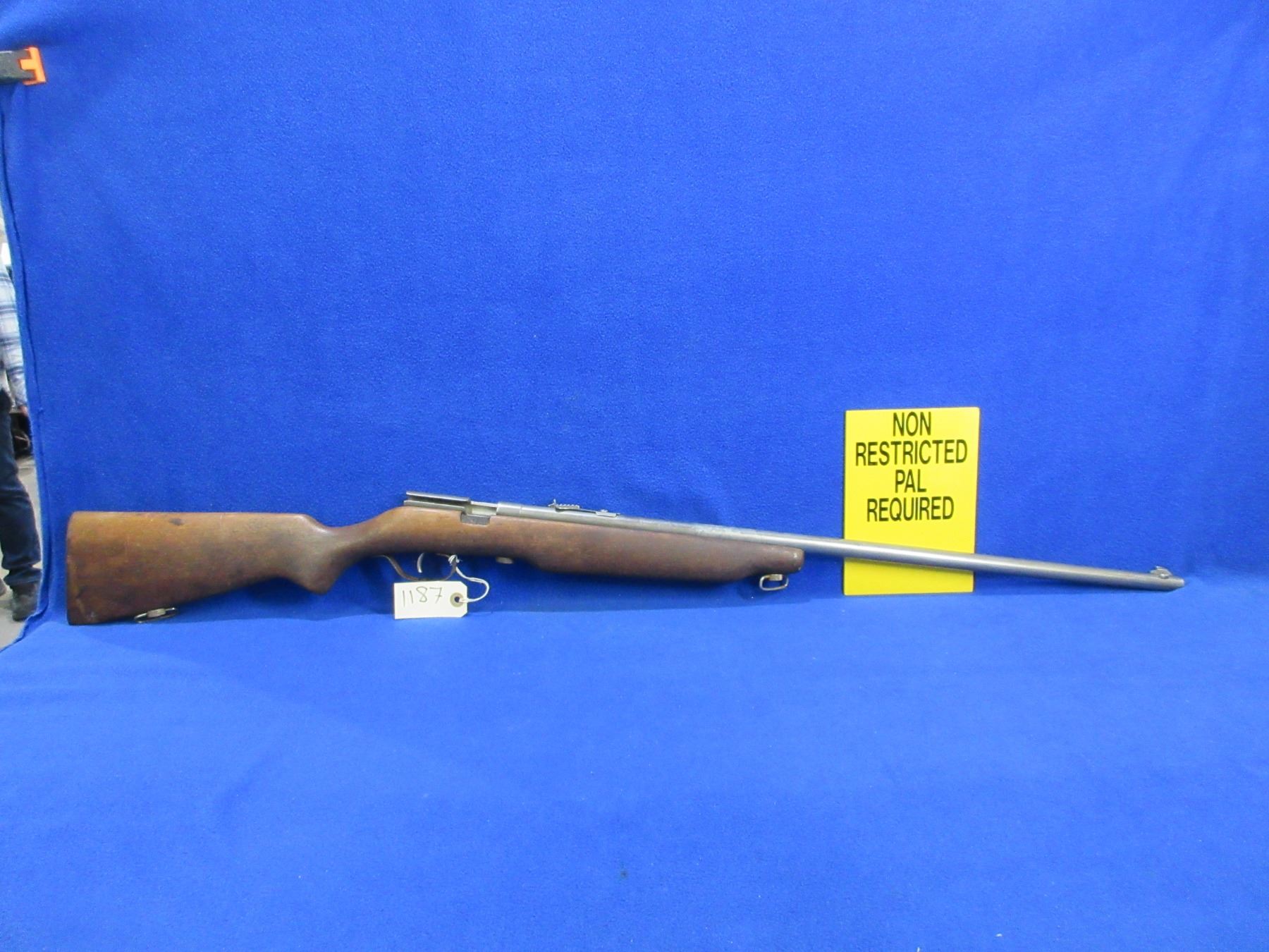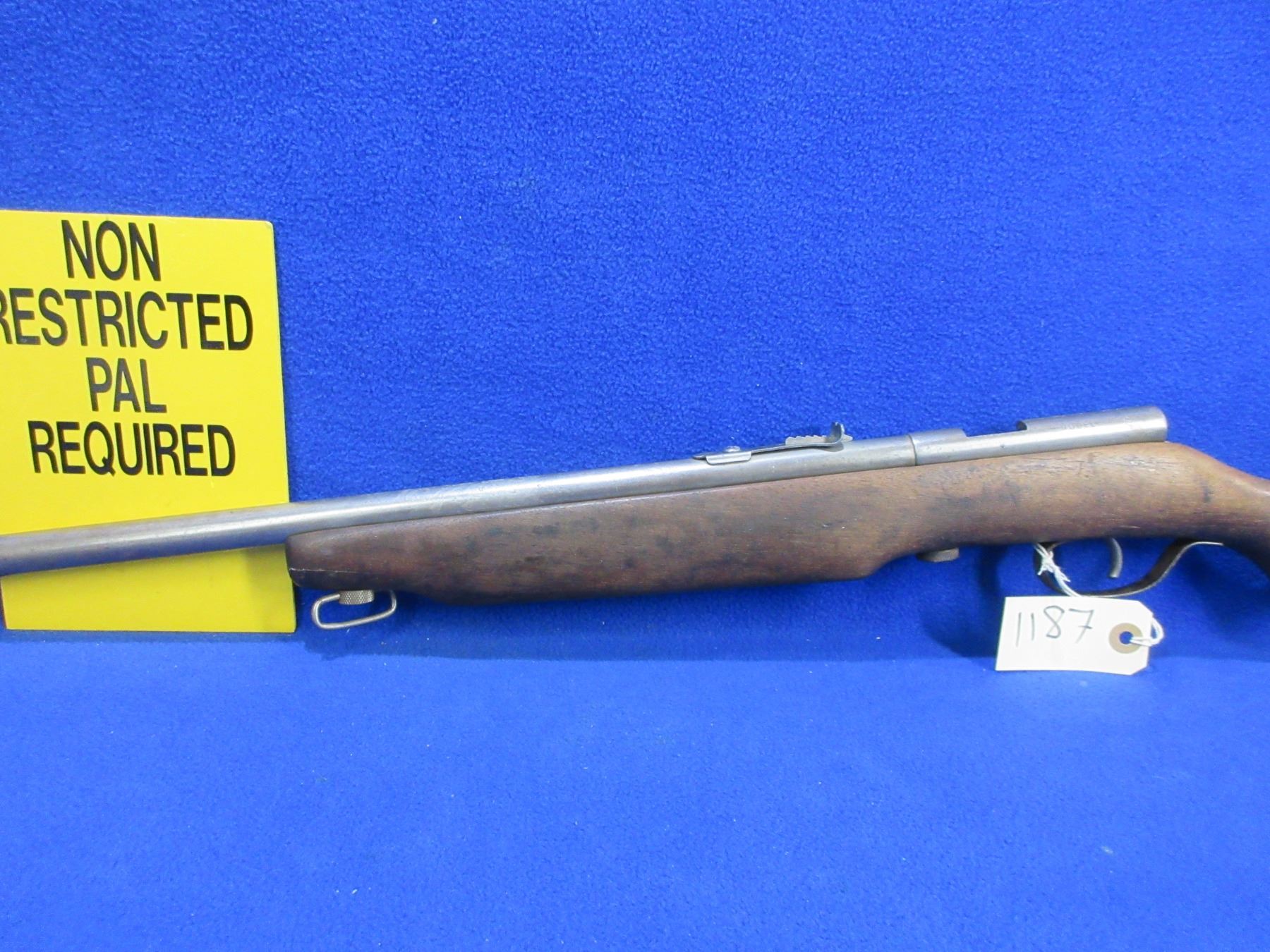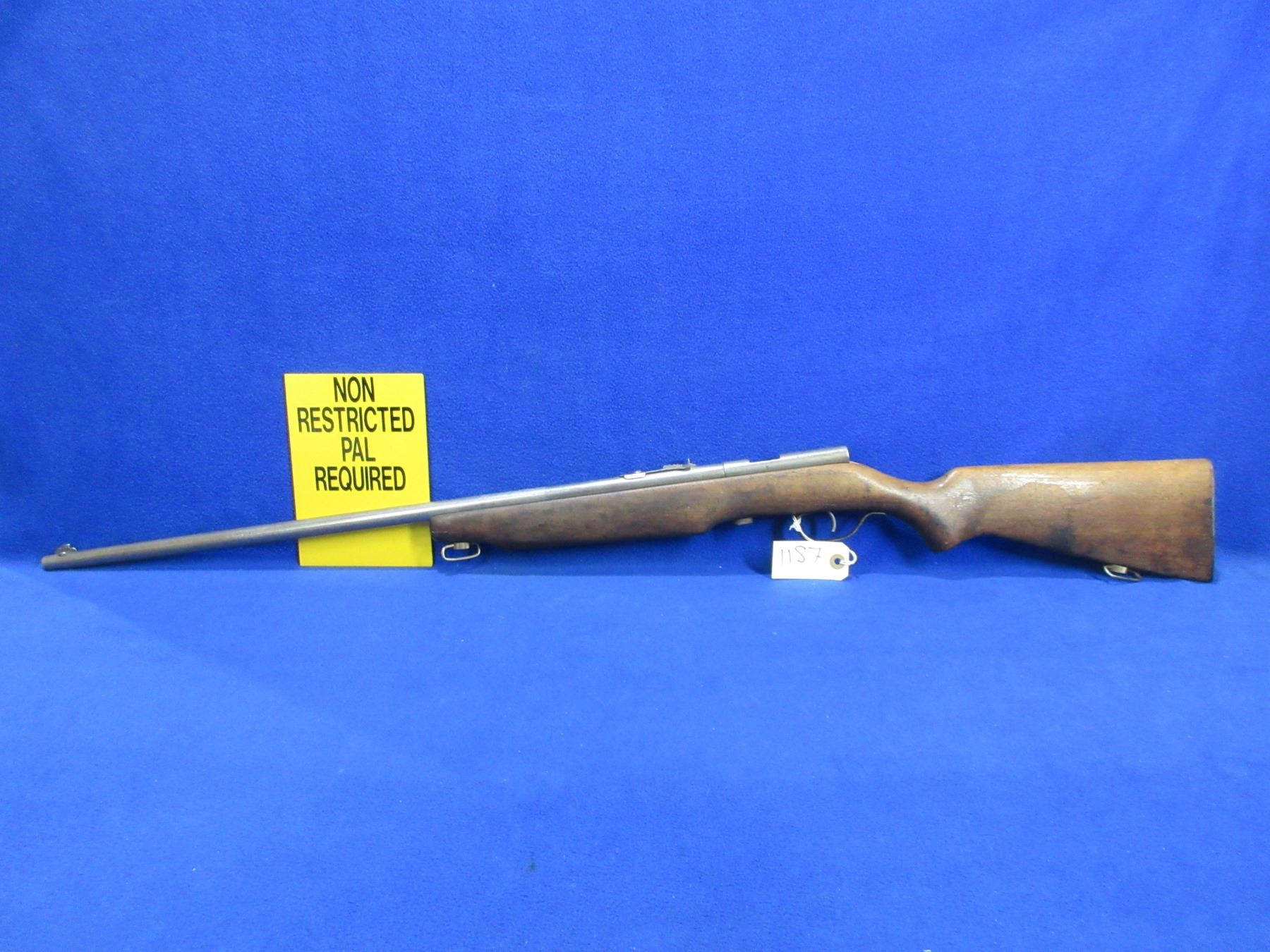 Non-Restricted - Cooey Model 75 in 22 Cal. - This is a single shot bolt action rifle (bolt missing), action is in non working order as bolt is missing. Barrel is 27", rifling is good, bluing is gone, has both sights, stock has a crack repair at the front of the forearm, length of pull is 13 1/4", metal butt plate, comes with swivels. Ser # None