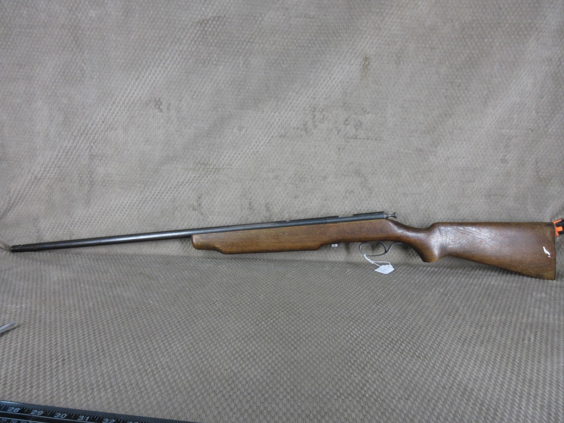 Non-Restricted - Cooey Model 75 in 22 Long Rifle - This single shot bolt action rifle appears to be in good working order but bolt handle is missing the ball. Barrel is 27", bluing is grey with some pitting, rifling is good to very good, has no sights, stock is good overall but has chip by bolt handle, metal butt plate.