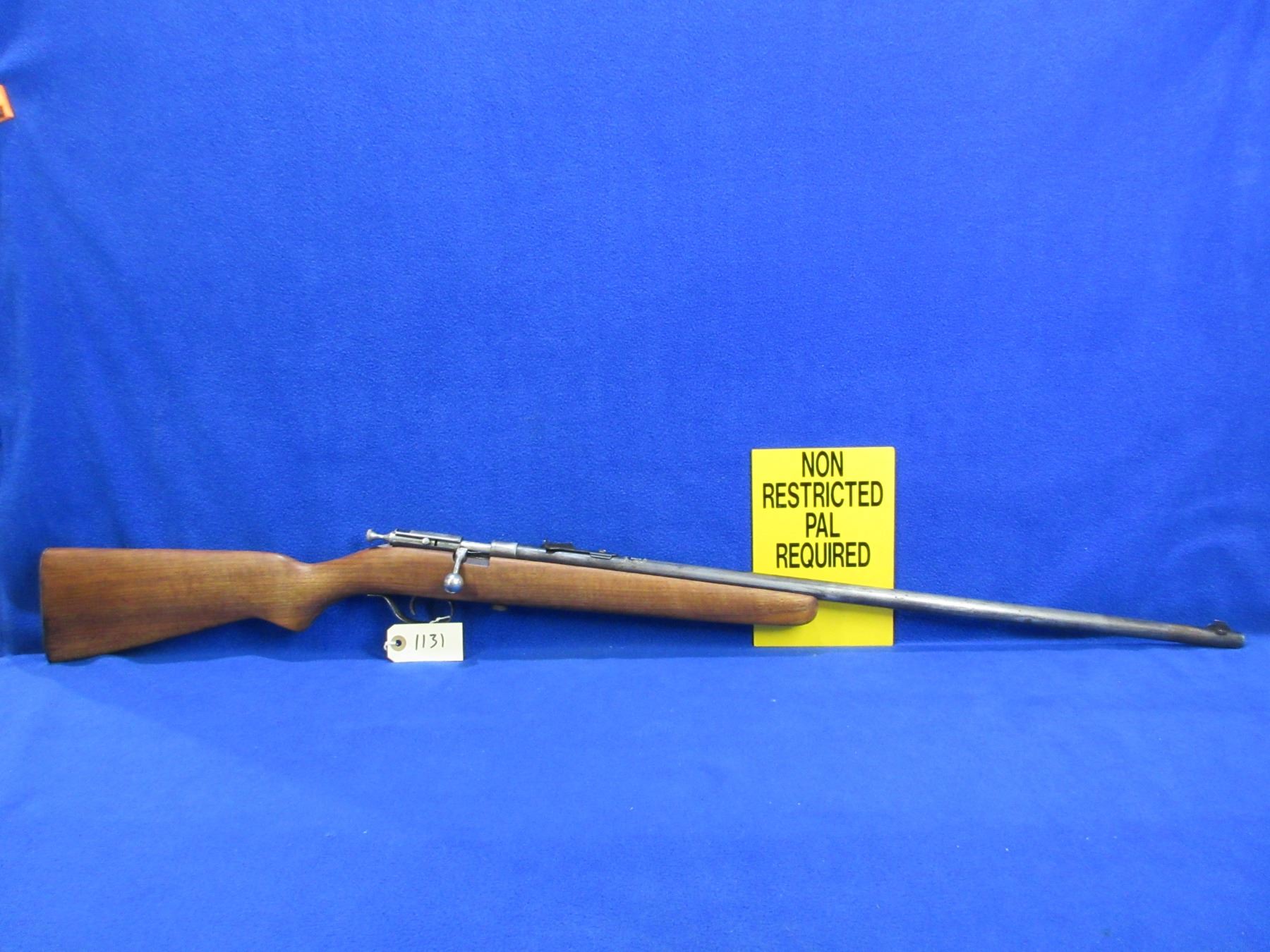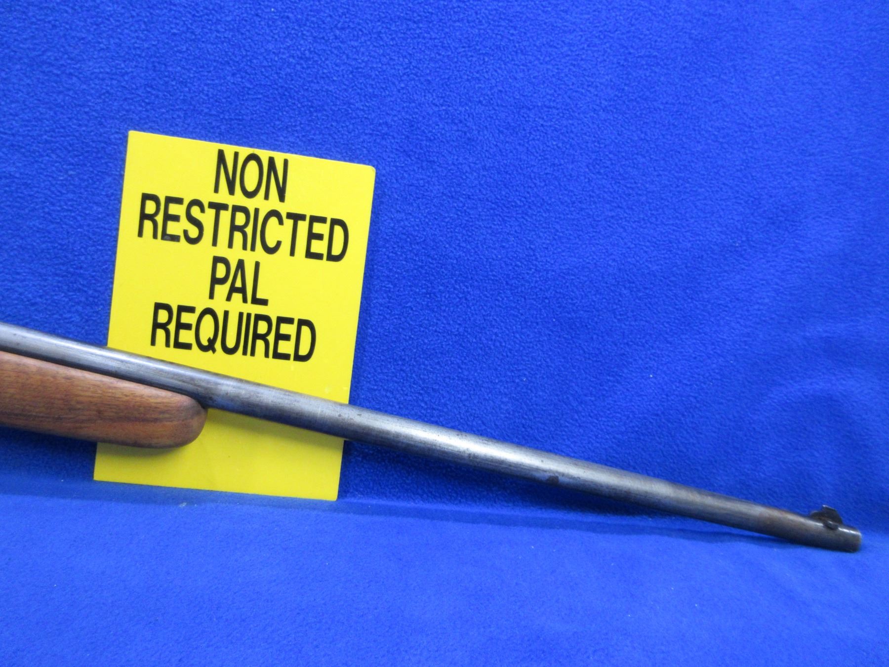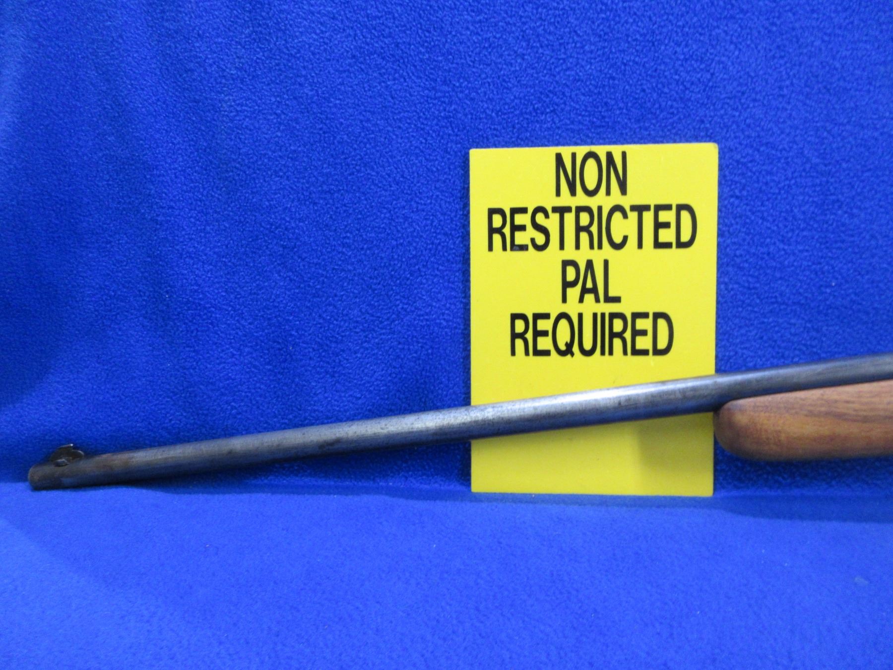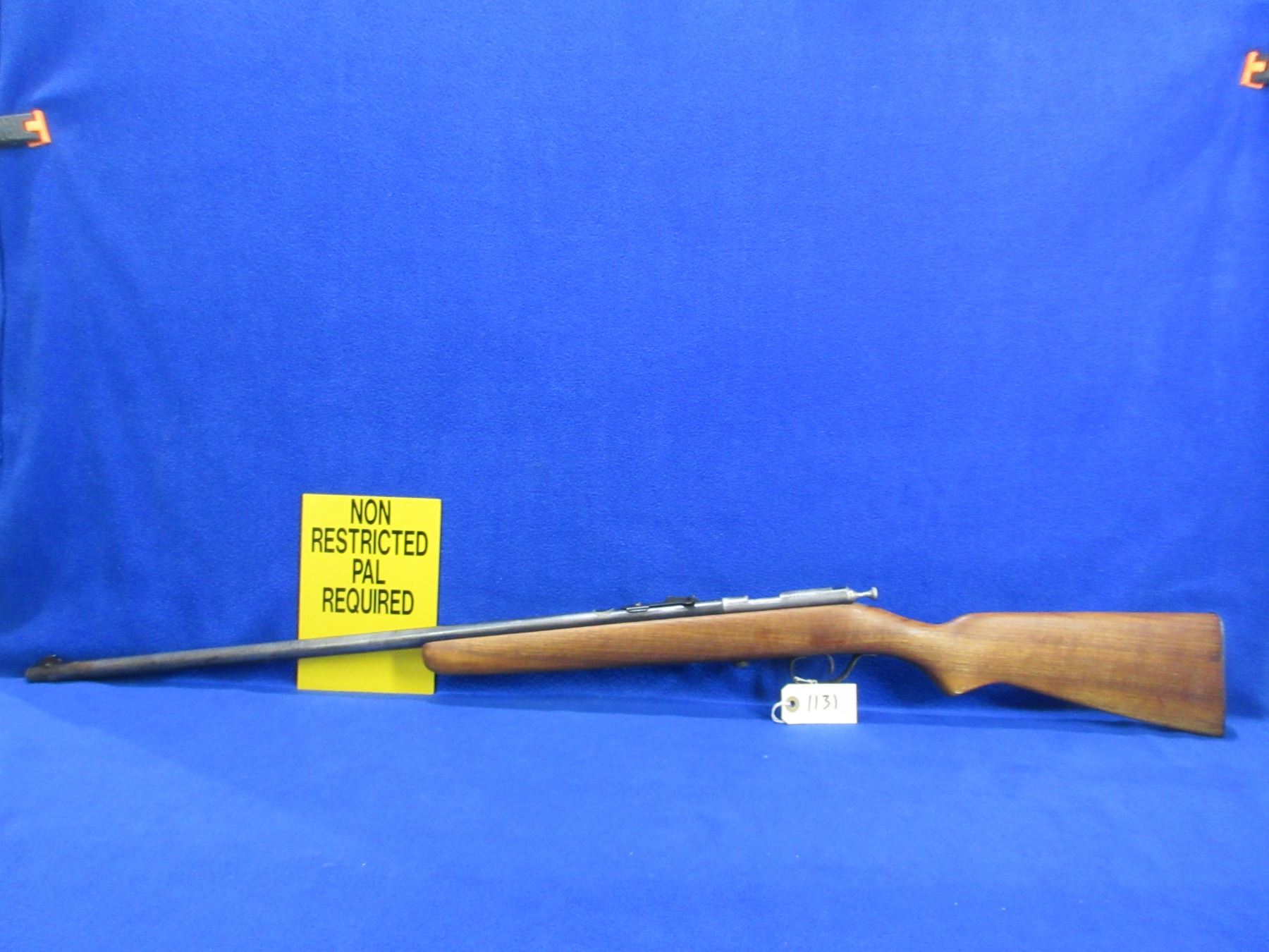 Non-Restricted - Cooey Model 78 Single Shot in 22 Cal. - This is a single shot bolt action rifle, action appears to be in good to very good working order. Barrel is 27", rifling is good to very good, bluing is gone, has both sights, stock has been refinished and is good to very good, length of pull is 13 1/2", metal butt plate good. Ser # 4317648 on Sticker