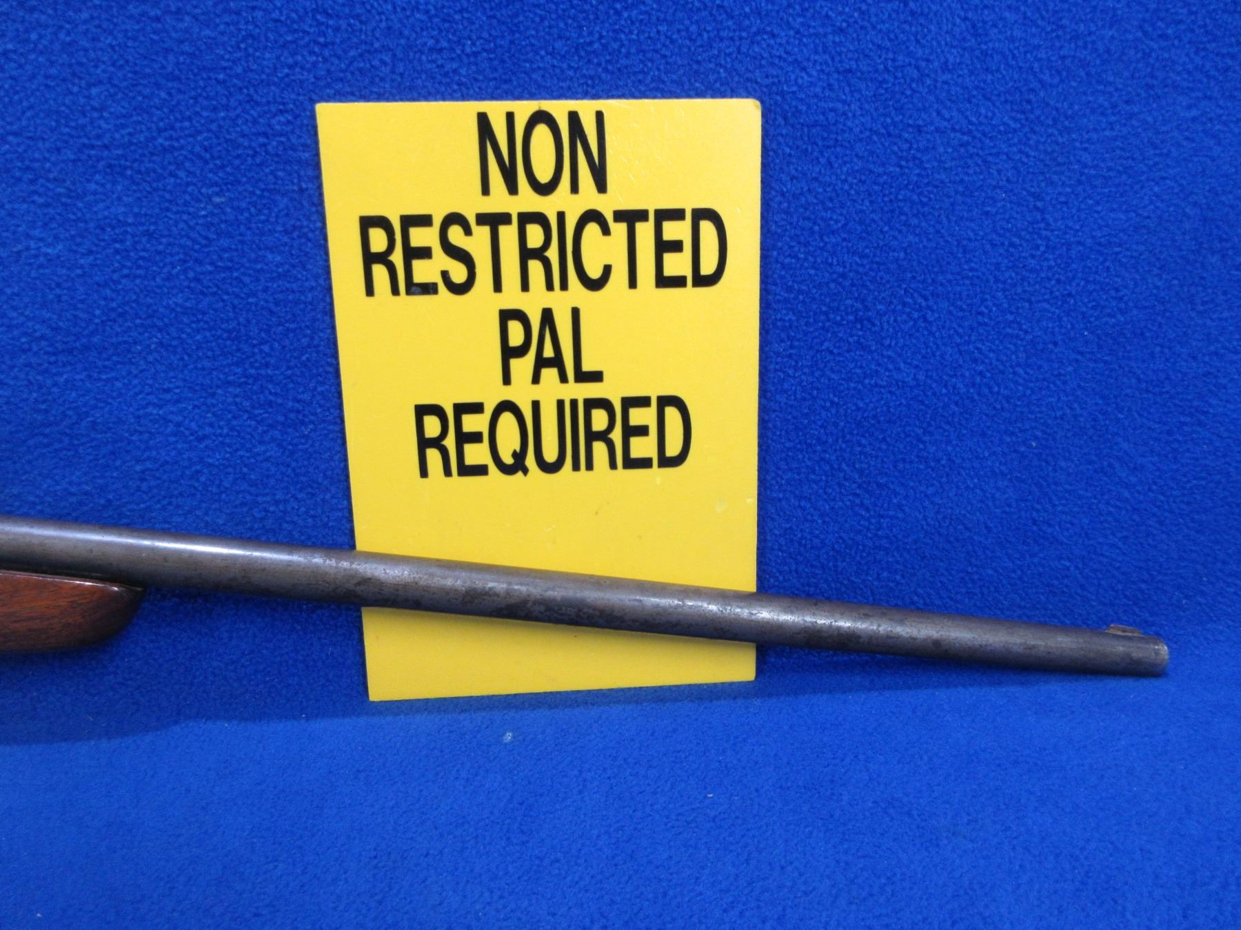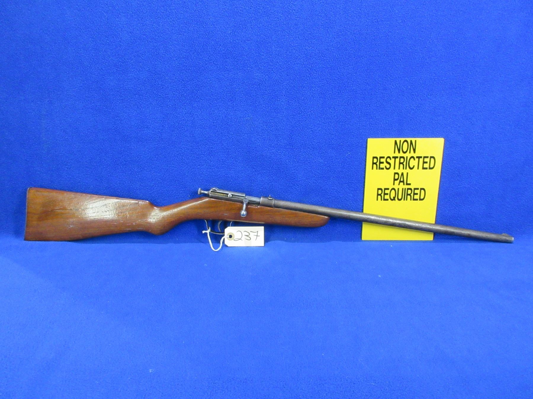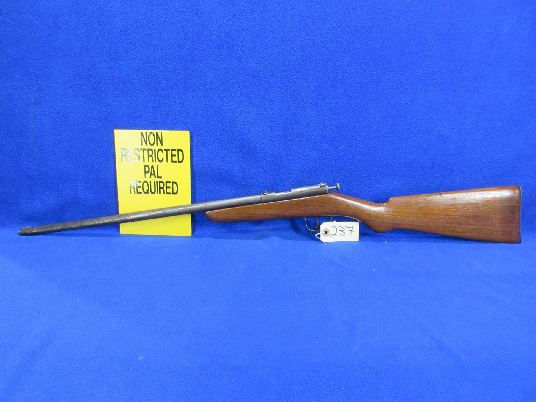 Non-Restricted - Cooey Ranger in 22 LR - This is a single shot bolt action rifle, action appears to be in good working order. Barrel is 18", rifling is good to very good, bluing is gone and has pitting, has both sights and rear flip up peep sight, stock is good with usage marks, length of pull is 13", metal butt plate good. Ser # None