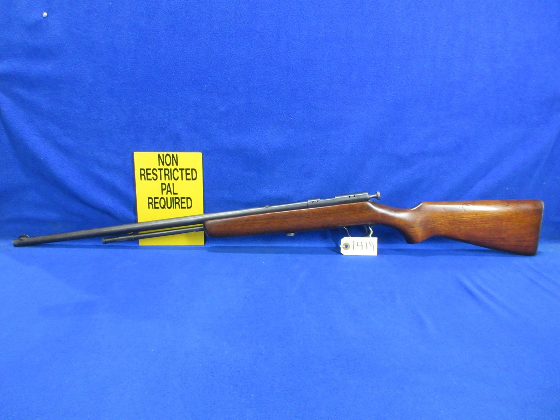 Non-Restricted - Cooey Repeater Model 60 in 22 Cal - This bolt action rifle with tube magazine appears to be in good to very good working order. Barrel is 24", rifling is good to very good, bluing is turning grey and has light scratches, has front sight, missing rear sight but is drilled and tapped for side mount scope base, stock is good with usage marks, metal butt plate good. Ser #None