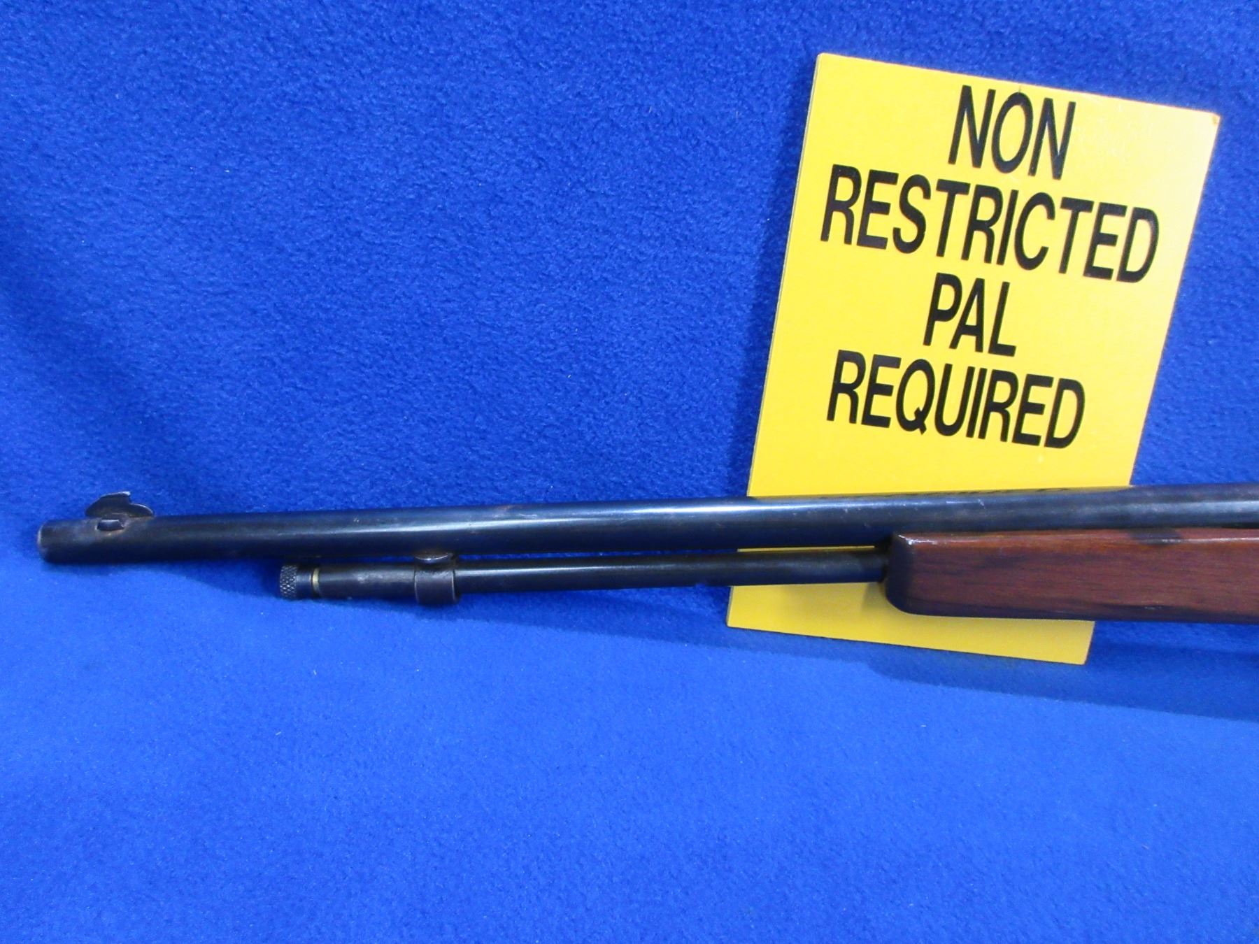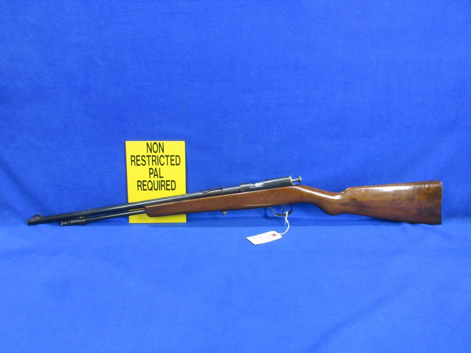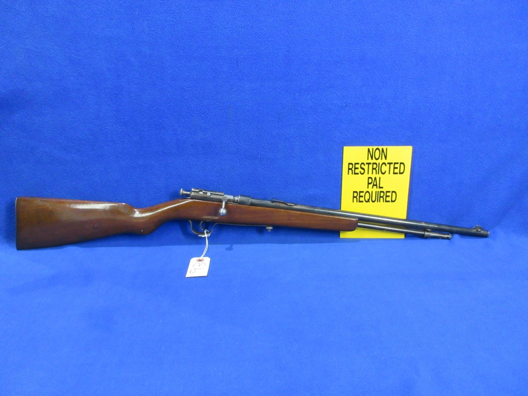 Non-Restricted - Cooey Repeater in 22 LR - This bolt action rifle with tube magazine appears to be in working order. Barrel is 19 3/4"", rifling is good to very good, bluing is fair to good, has both sights but rear sight is missing the ramp, stock has a major crack in the forearm area and appears to be refinished, metal butt plate good. Ser # None