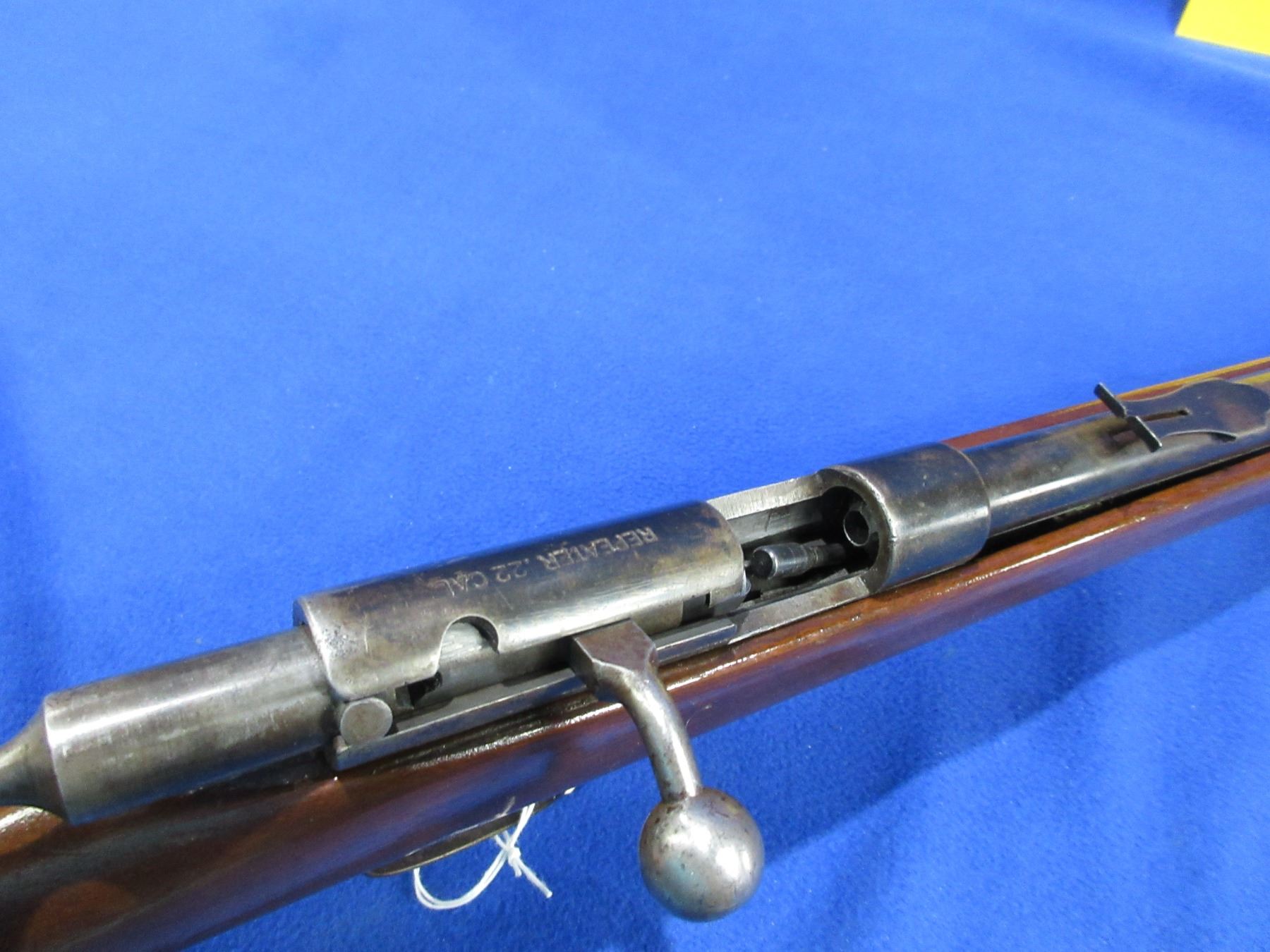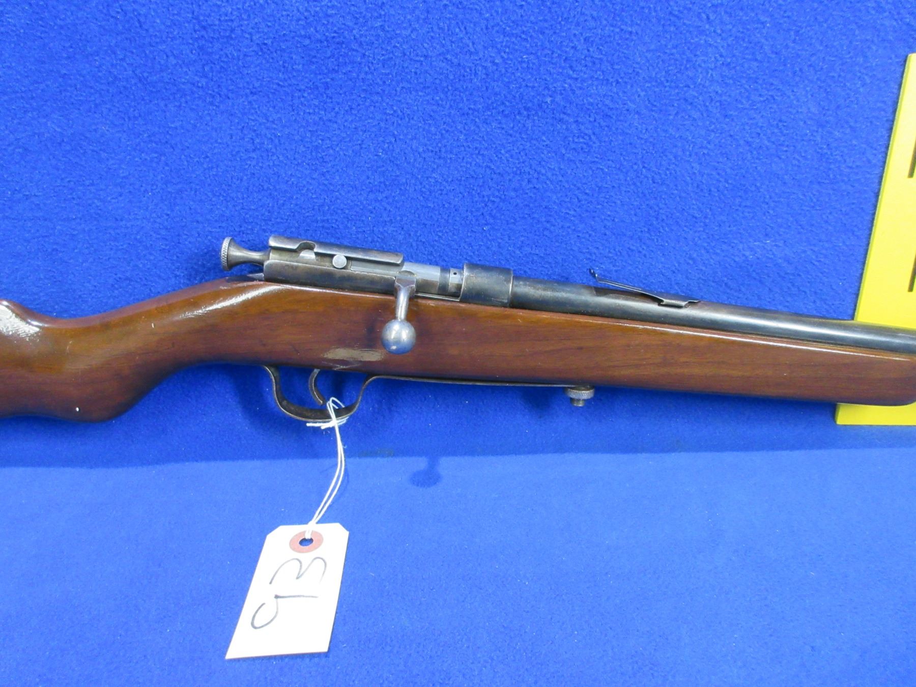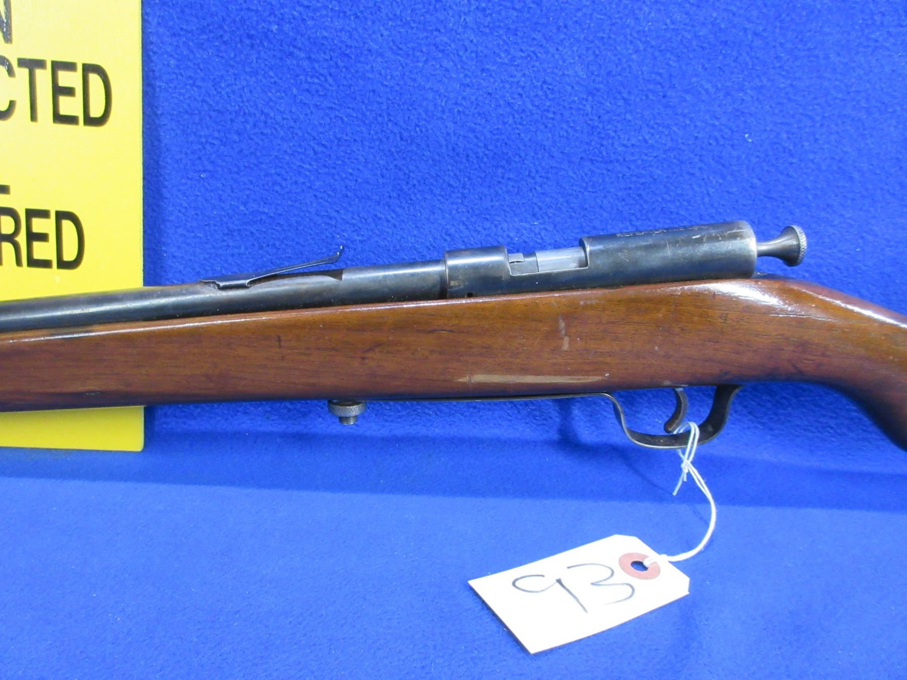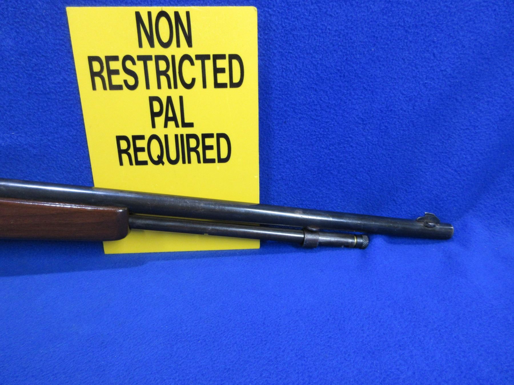Non-Restricted - Cooey Repeater in 22 LR - This bolt action rifle with tube magazine appears to be in working order. Barrel is 19 3/4"", rifling is good to very good, bluing is fair to good, has both sights but rear sight is missing the ramp, stock has a major crack in the forearm area and appears to be refinished, metal butt plate good. Ser # None