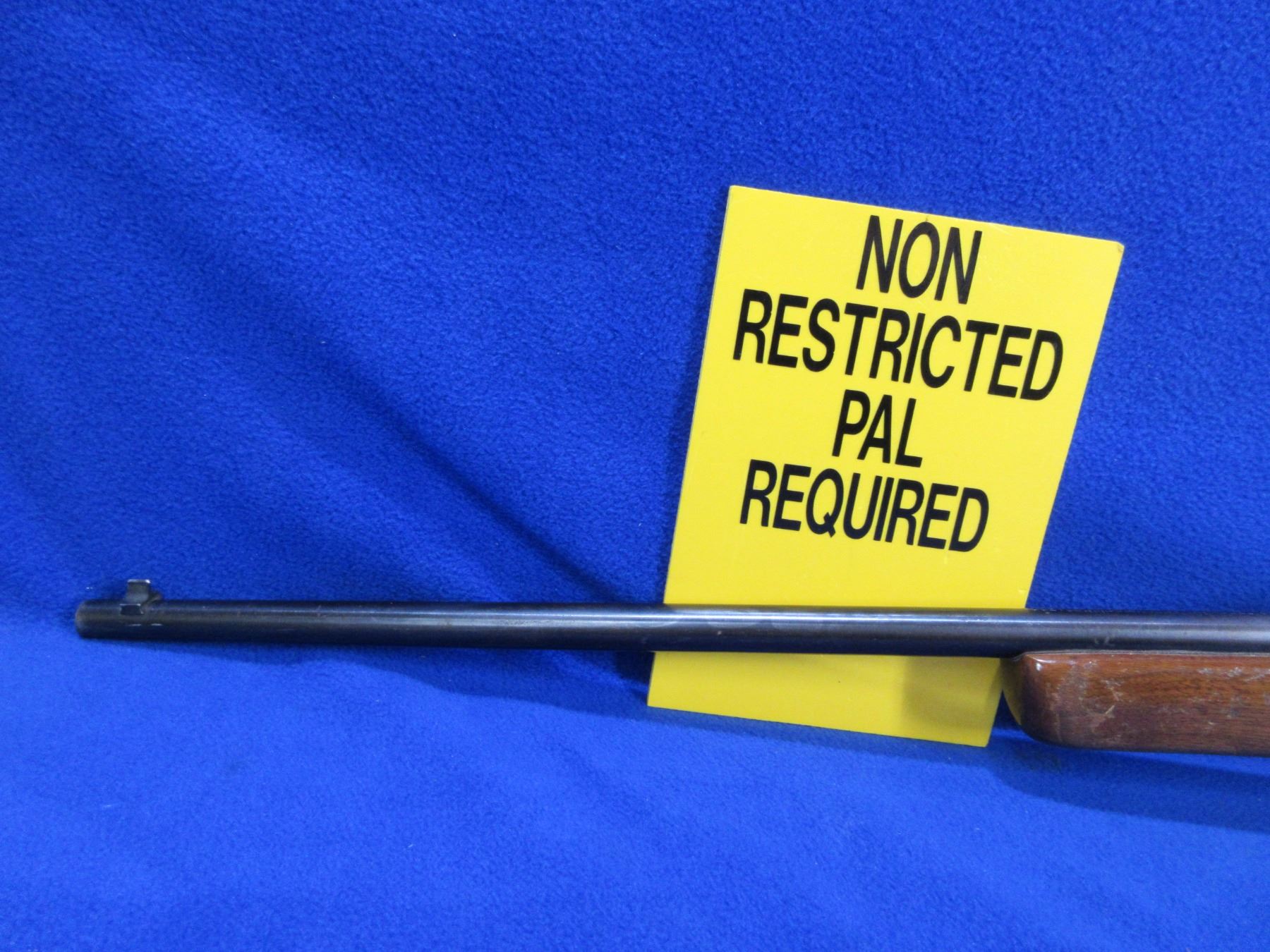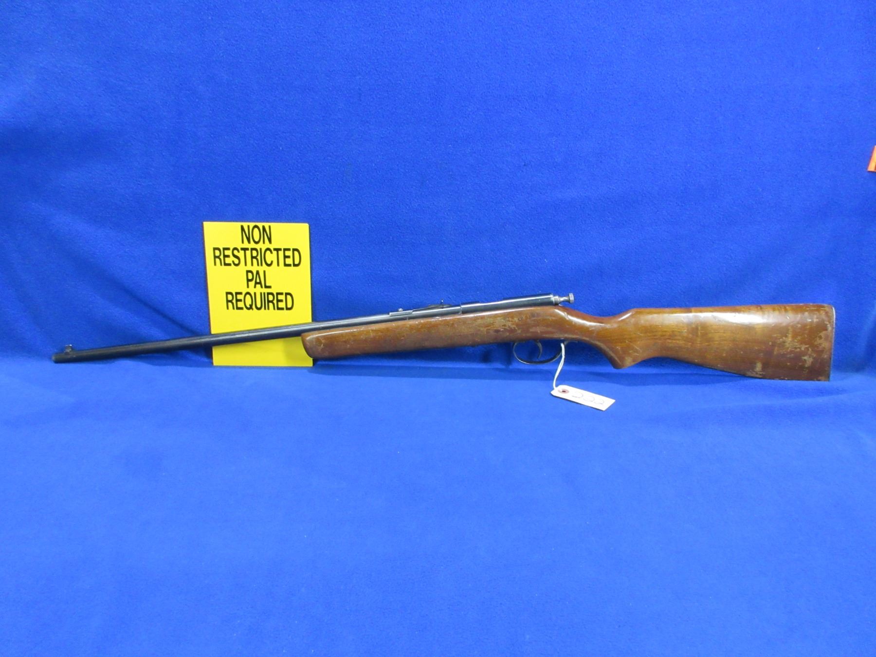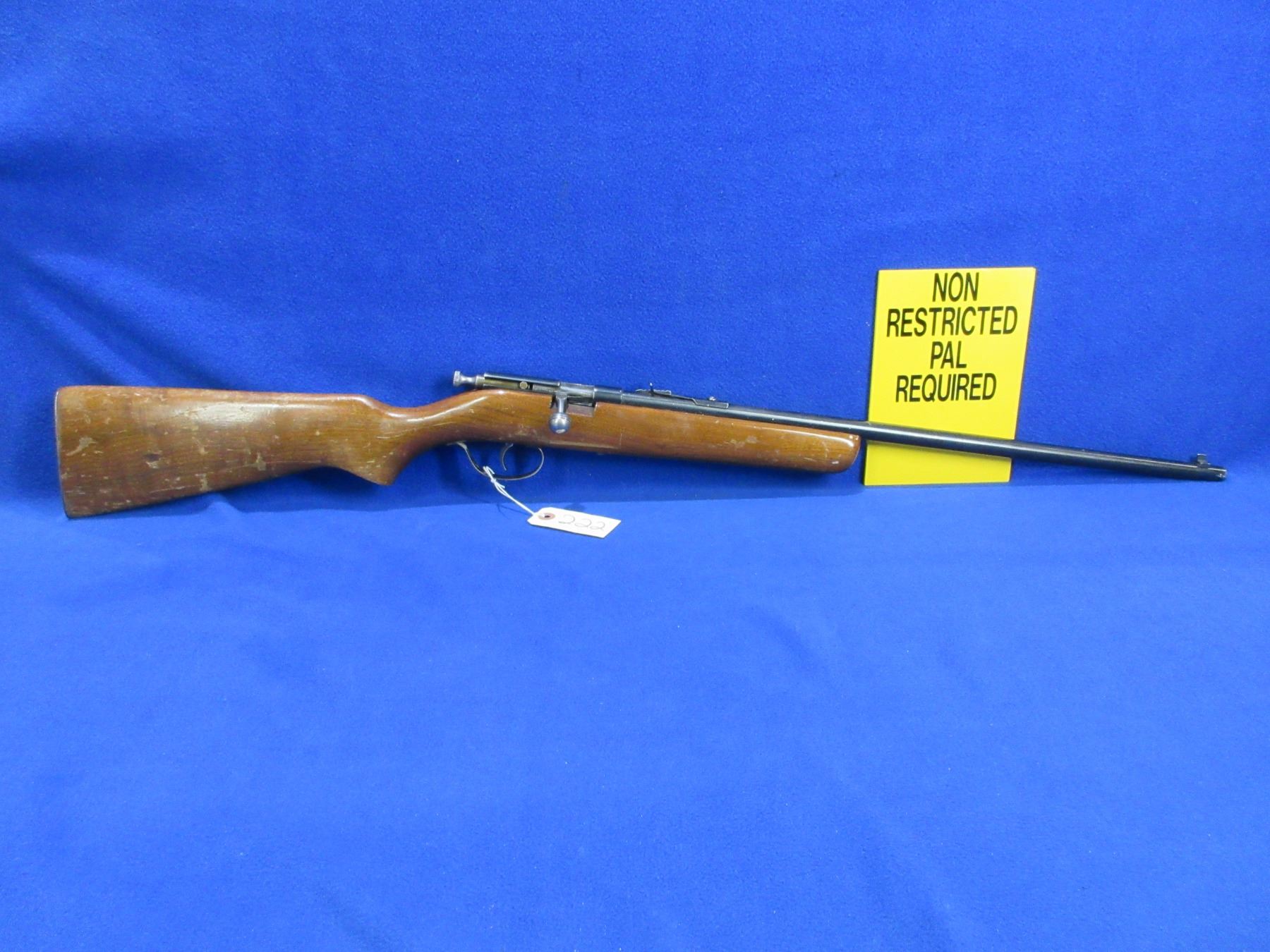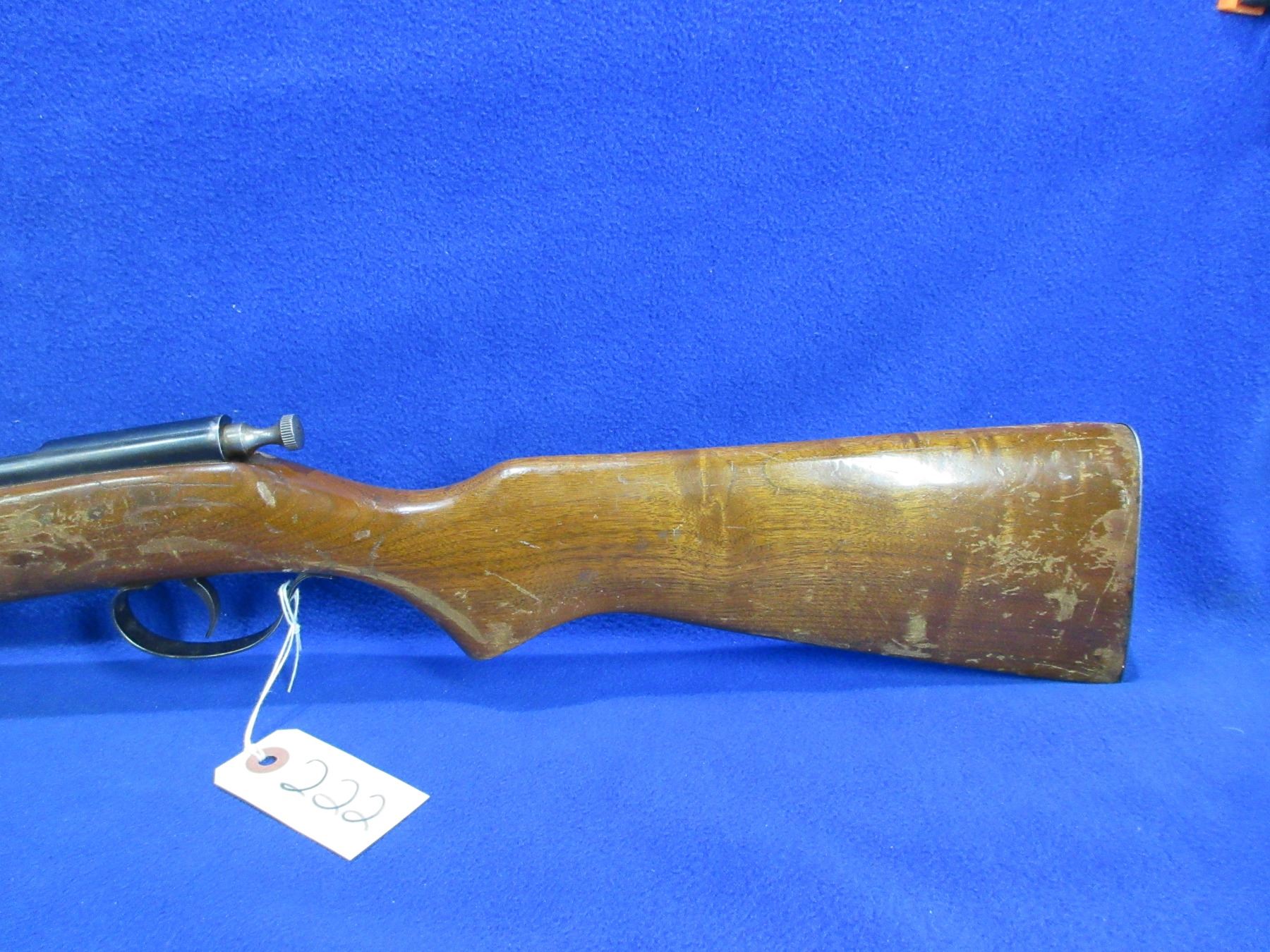 Non-Restricted - Cooey by Winchester Model 39 in 22 S,L,LR - This single shot bolt action rifle appears to be in good to very good working order. Barrel is 22", rifling is good to very good, bluing is good with wear spots, has both sights, stock is good with many usage marks and the finish is flaking, incorrect barrel screw, metal butt plate. Ser # None