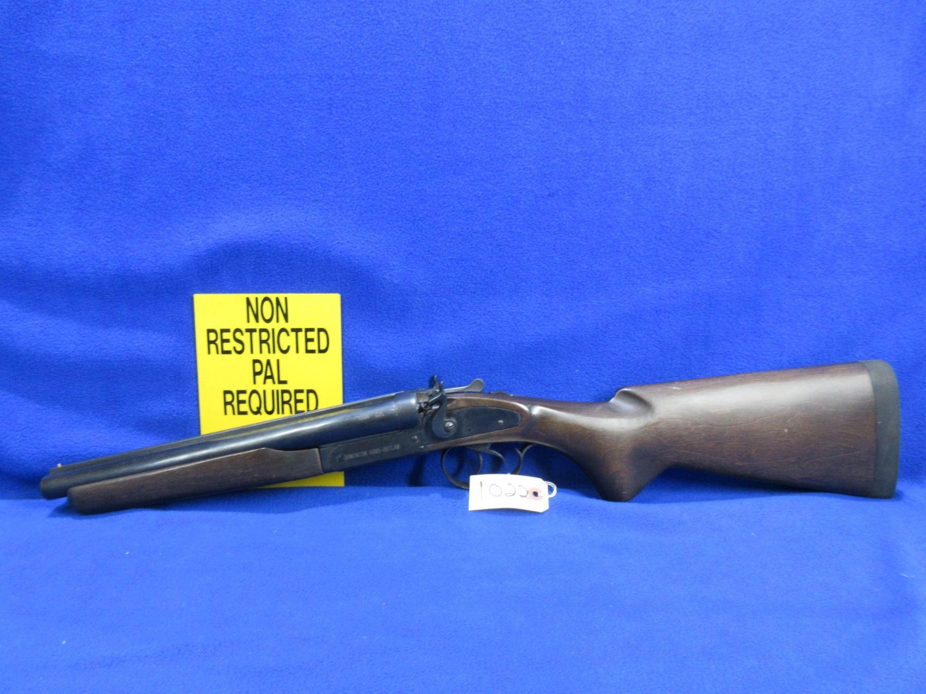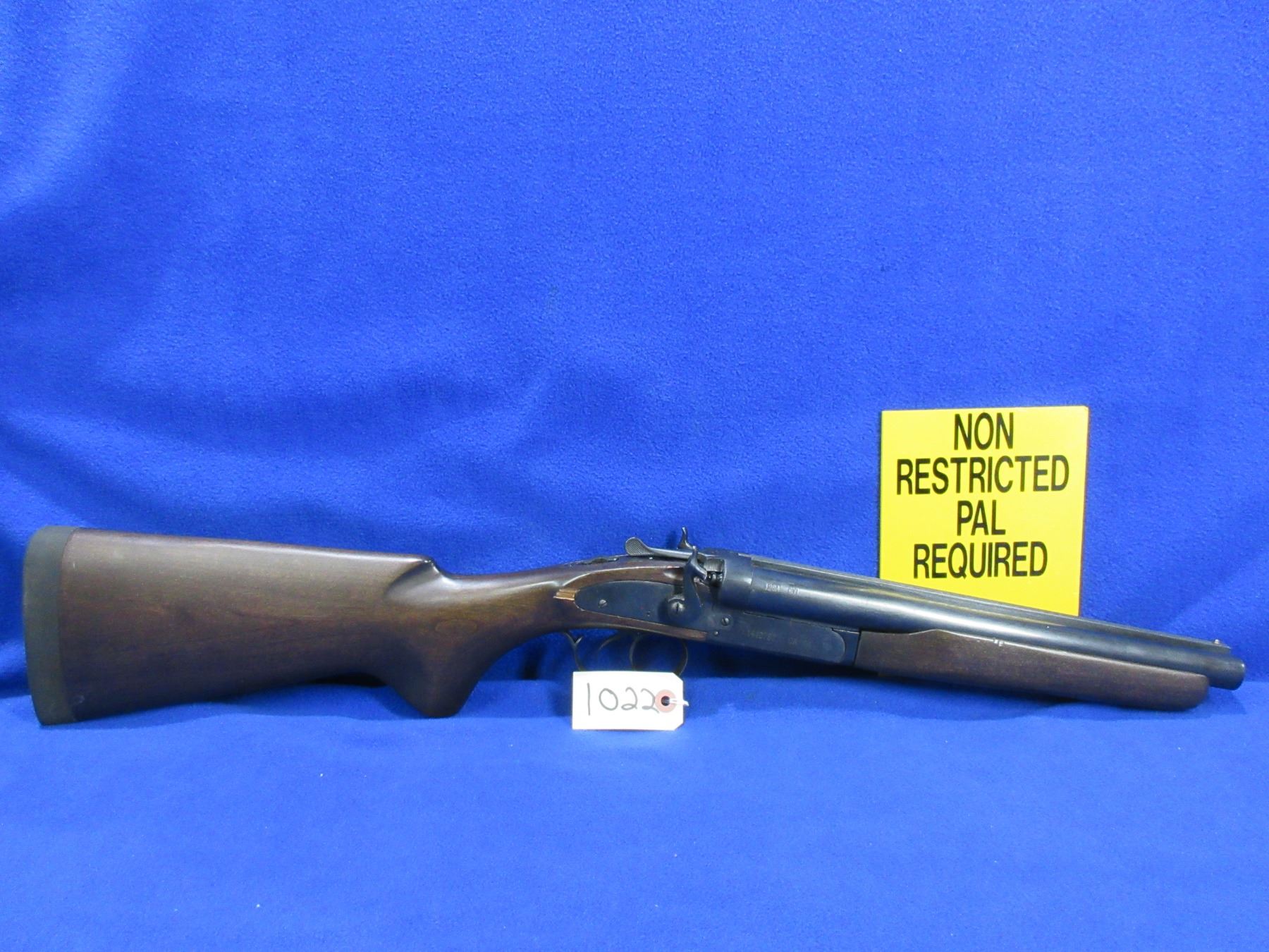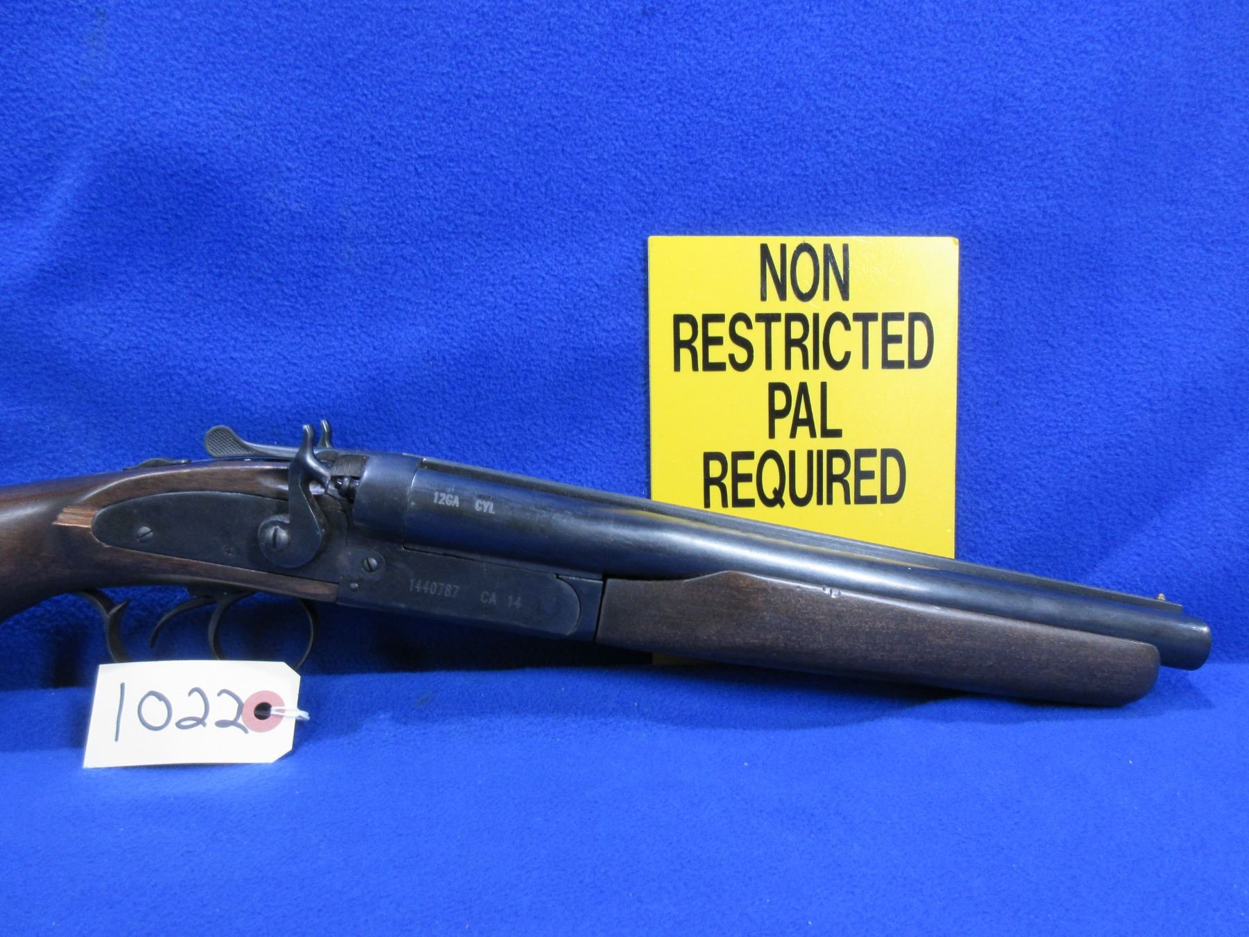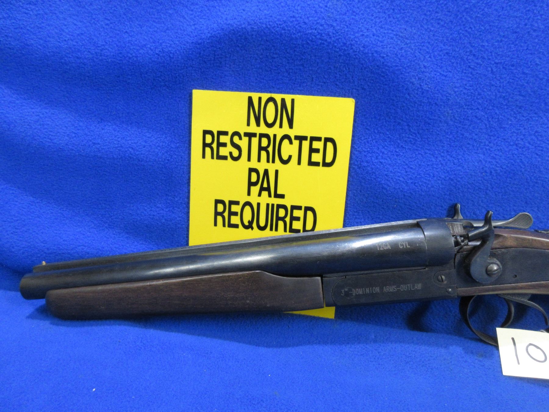 Non-Restricted - Dominion Arms CA-14 Outlaw in 12 Ga. 3" Cyl - This tip up SXS hammer shotgun appears to be in good working order. Barrels are 12", bores are good to very good, bluing is good, has bead front sight, stock is good but has a chip on back right side of action and has usage marks, forearm is good to very good with usage marks, rubber recoil pad good. Ser # 1440787