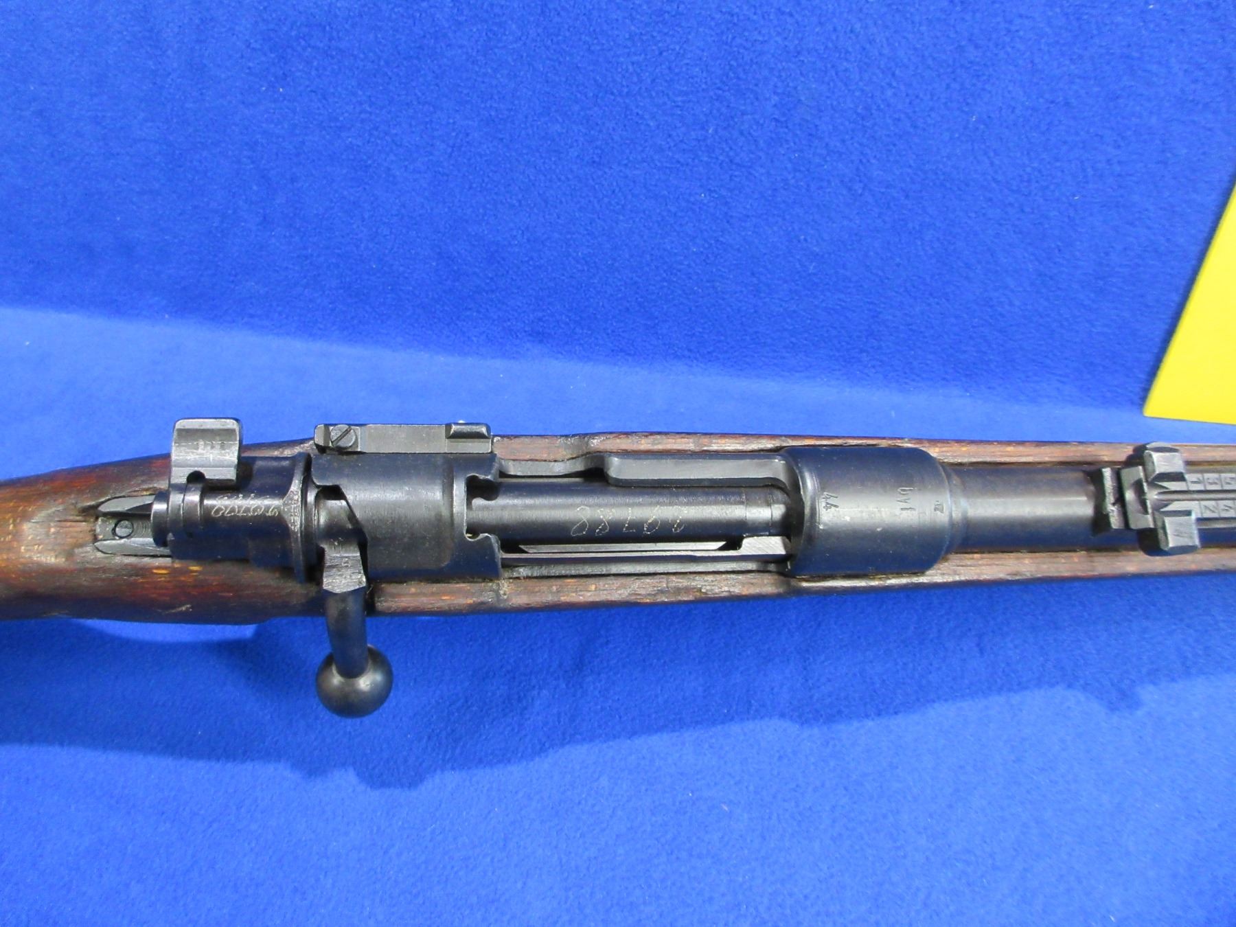 Non-Restricted - German Mauser 98 in 8mm - This bolt action rifle with floorplate magazine appears to be in good to very good working order. Barrel is 24", rifling is good to very good, bluing is good to very good, has both sights, stock is good to very good, metal butt plate good, comes with strap mounts. Made in 1944, WWII surplus, packed in grease never cleaned & never shot since purchased. Barrel was cleaned for auction. Ser #29788