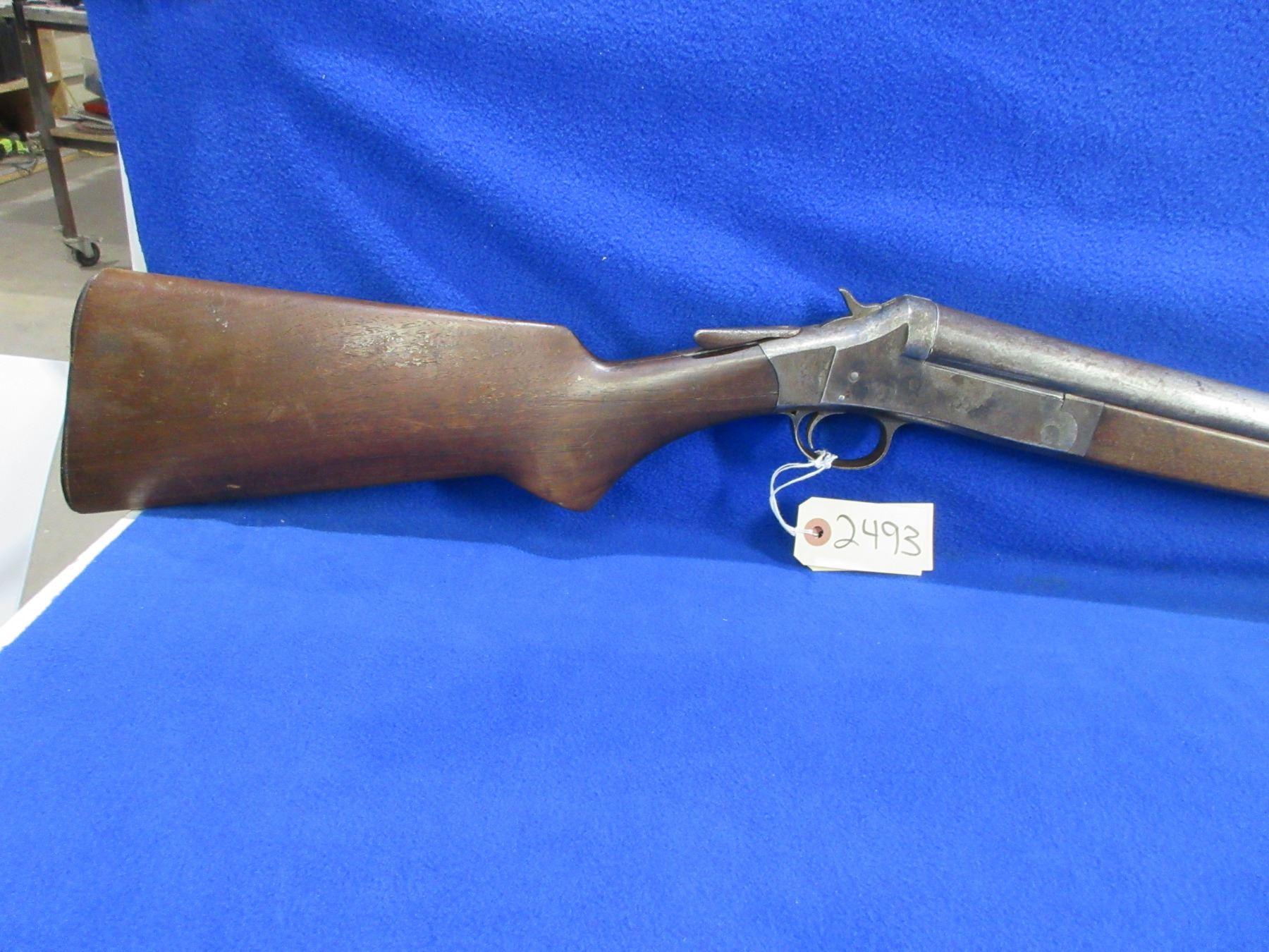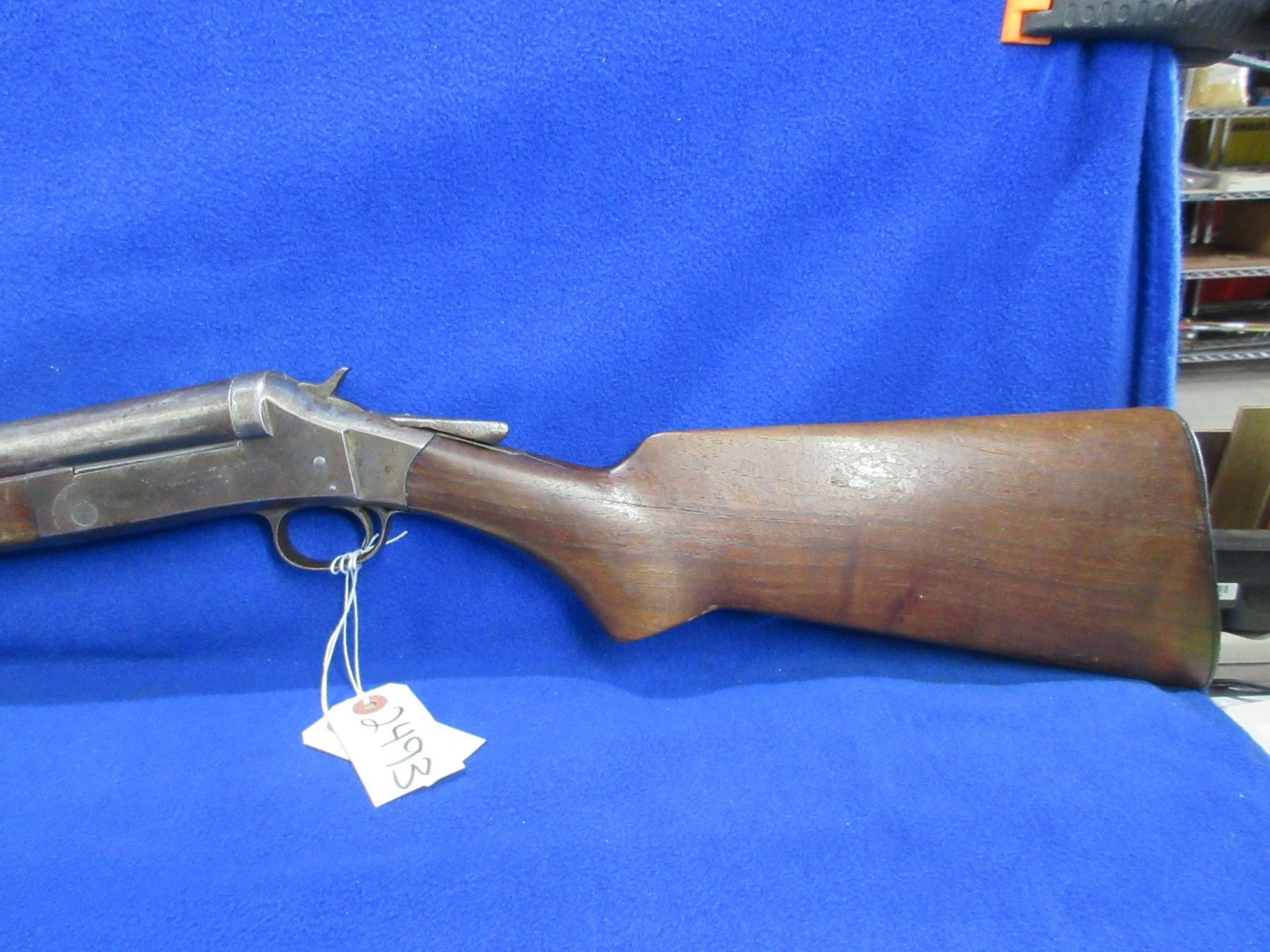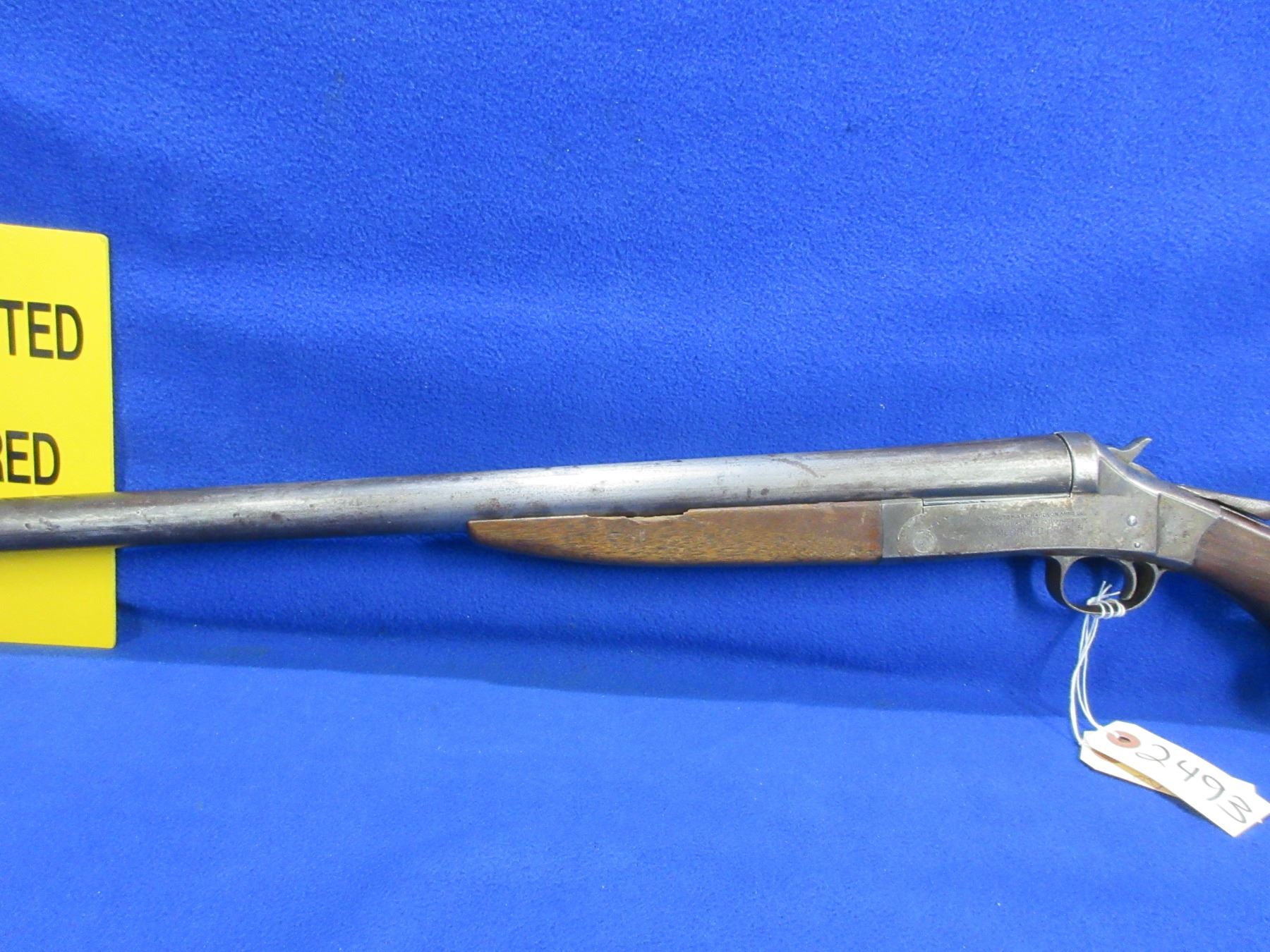 Non-Restricted - Harrington & Richardson in 12 Ga. - This tip up single shot shotgun is in non-working order as the action is loose. Barrel is 36", bore is good to very good, bluing is mostly gone, has bead sight, stock has cracks by the upper and lower tang and drying cracks, forearm has chip on left side, leather butt plate. Ser # A38299
