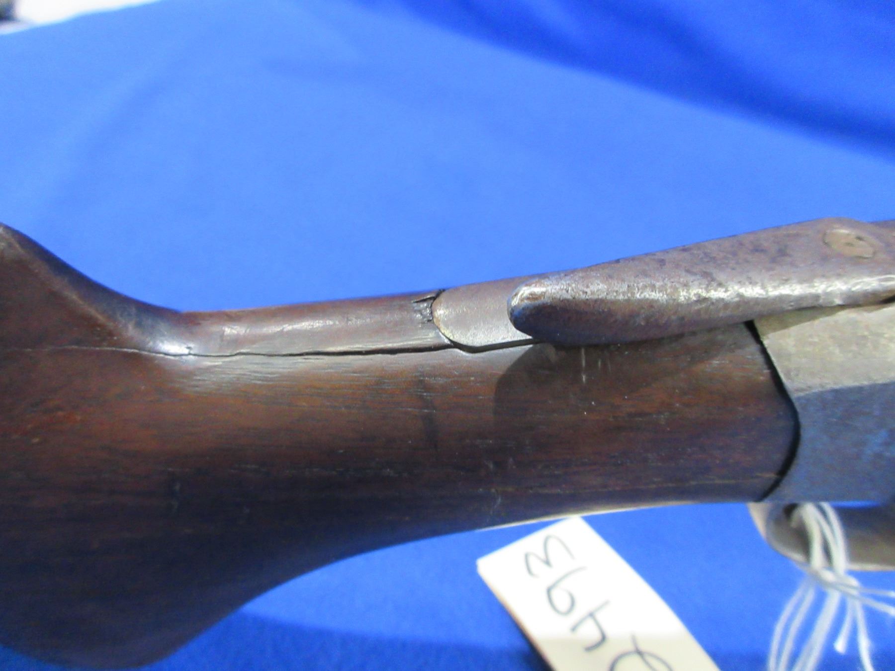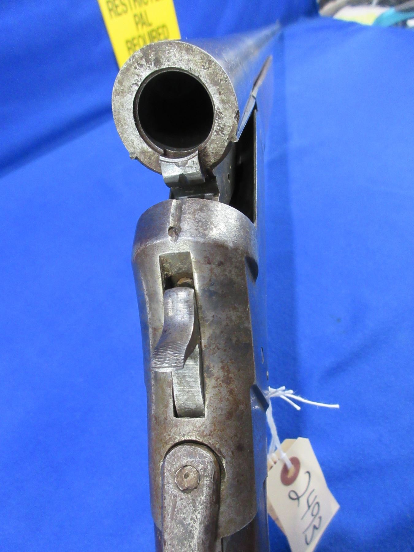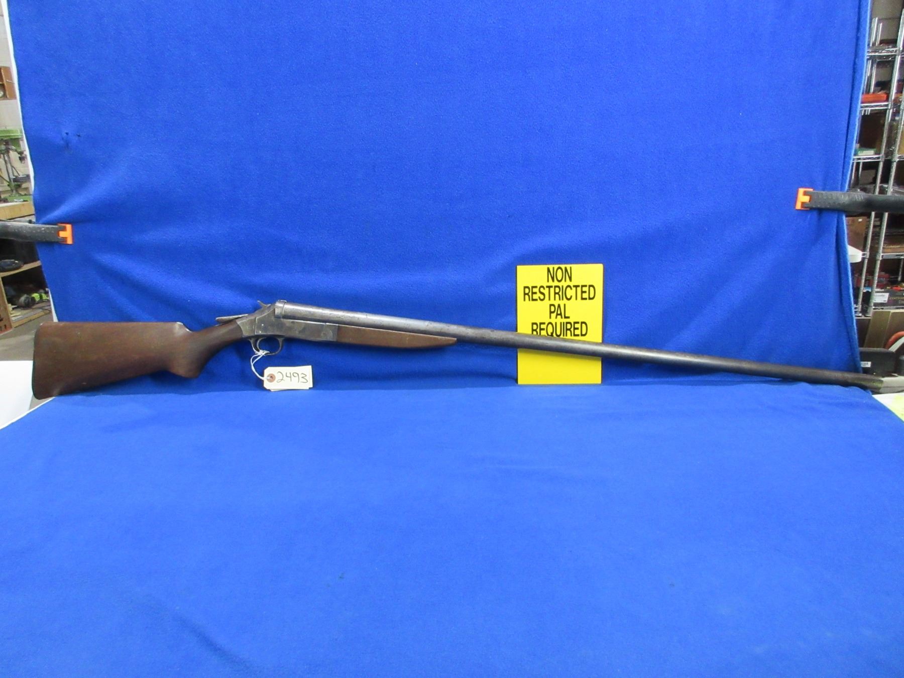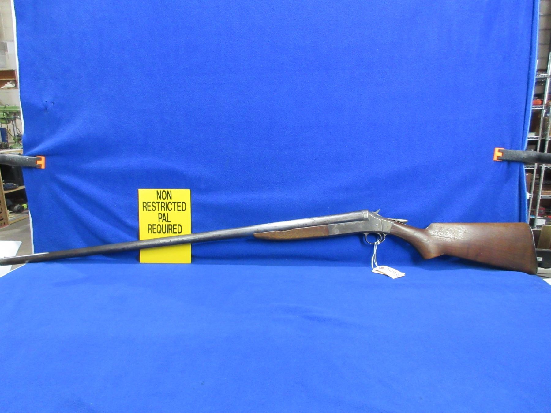 Non-Restricted - Harrington & Richardson in 12 Ga. - This tip up single shot shotgun is in non-working order as the action is loose. Barrel is 36", bore is good to very good, bluing is mostly gone, has bead sight, stock has cracks by the upper and lower tang and drying cracks, forearm has chip on left side, leather butt plate. Ser # A38299