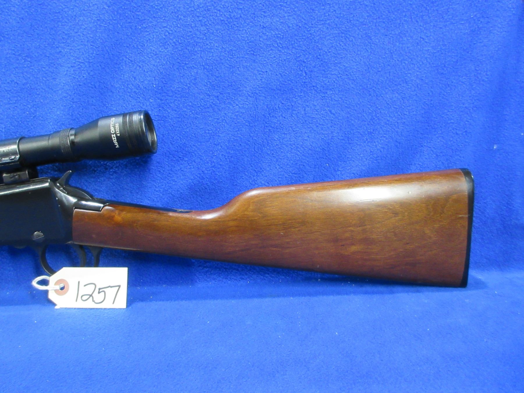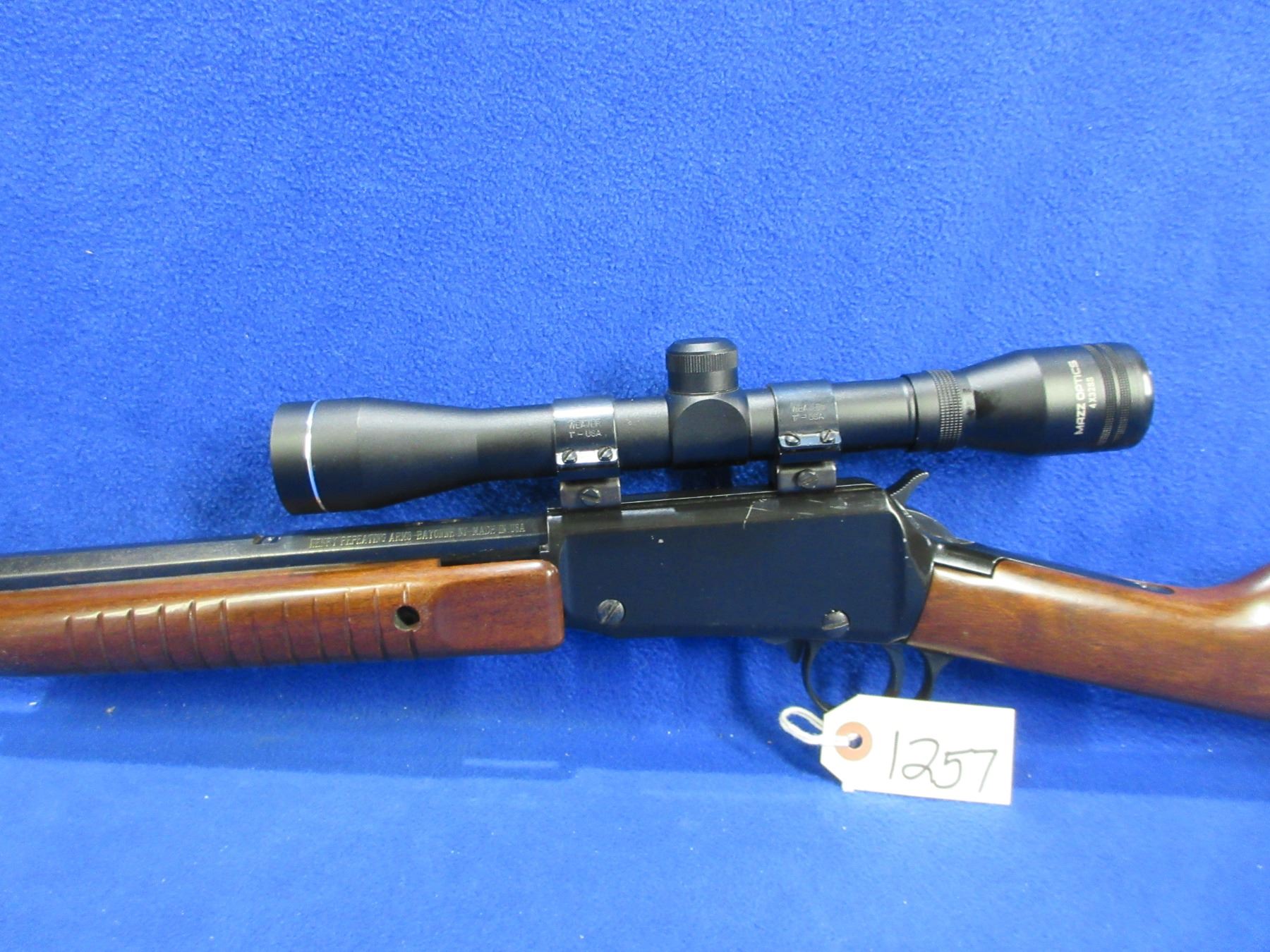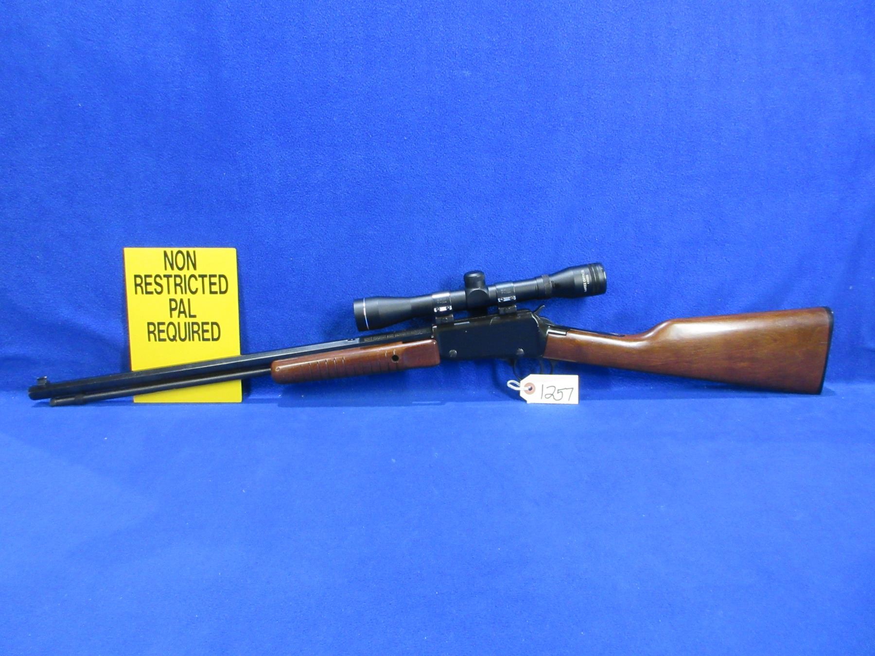 Non-Restricted - Henry Pump Rifle in 22 S/L/LR - This pump action rifle with tube magazine appears to be in good to very good working order. Octagon barrel is 20", rifling is very good, bluing is good with light pitting, has front sight, rear sight missing but has Weaver bases on Mazz Optics 4x32SS scope - appears clear, Mil dot reticle. Stock is good with usage marks, forearm is good with usage marks, butt plate good. Ser # P18423T