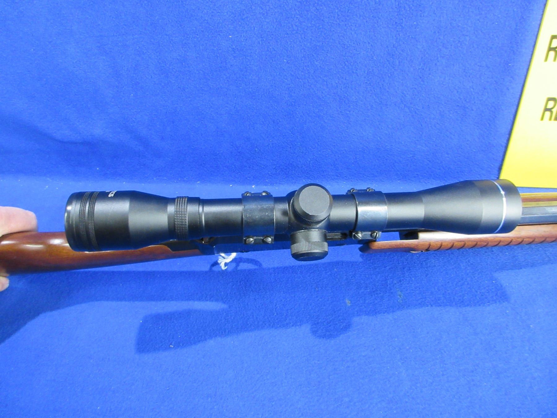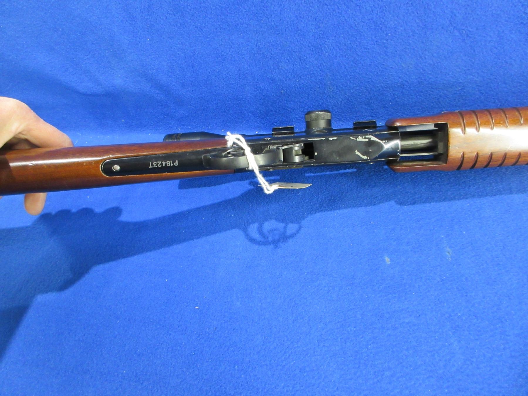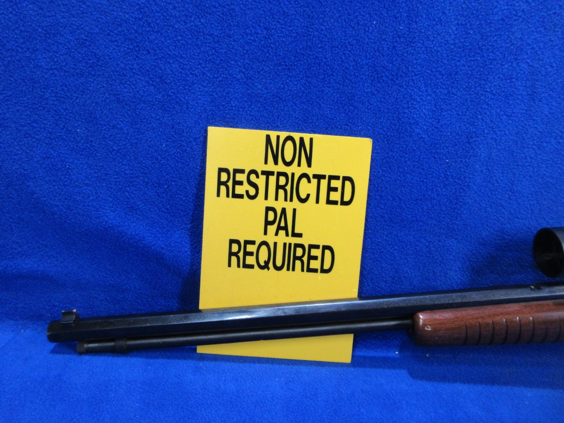 Non-Restricted - Henry Pump Rifle in 22 S/L/LR - This pump action rifle with tube magazine appears to be in good to very good working order. Octagon barrel is 20", rifling is very good, bluing is good with light pitting, has front sight, rear sight missing but has Weaver bases on Mazz Optics 4x32SS scope - appears clear, Mil dot reticle. Stock is good with usage marks, forearm is good with usage marks, butt plate good. Ser # P18423T