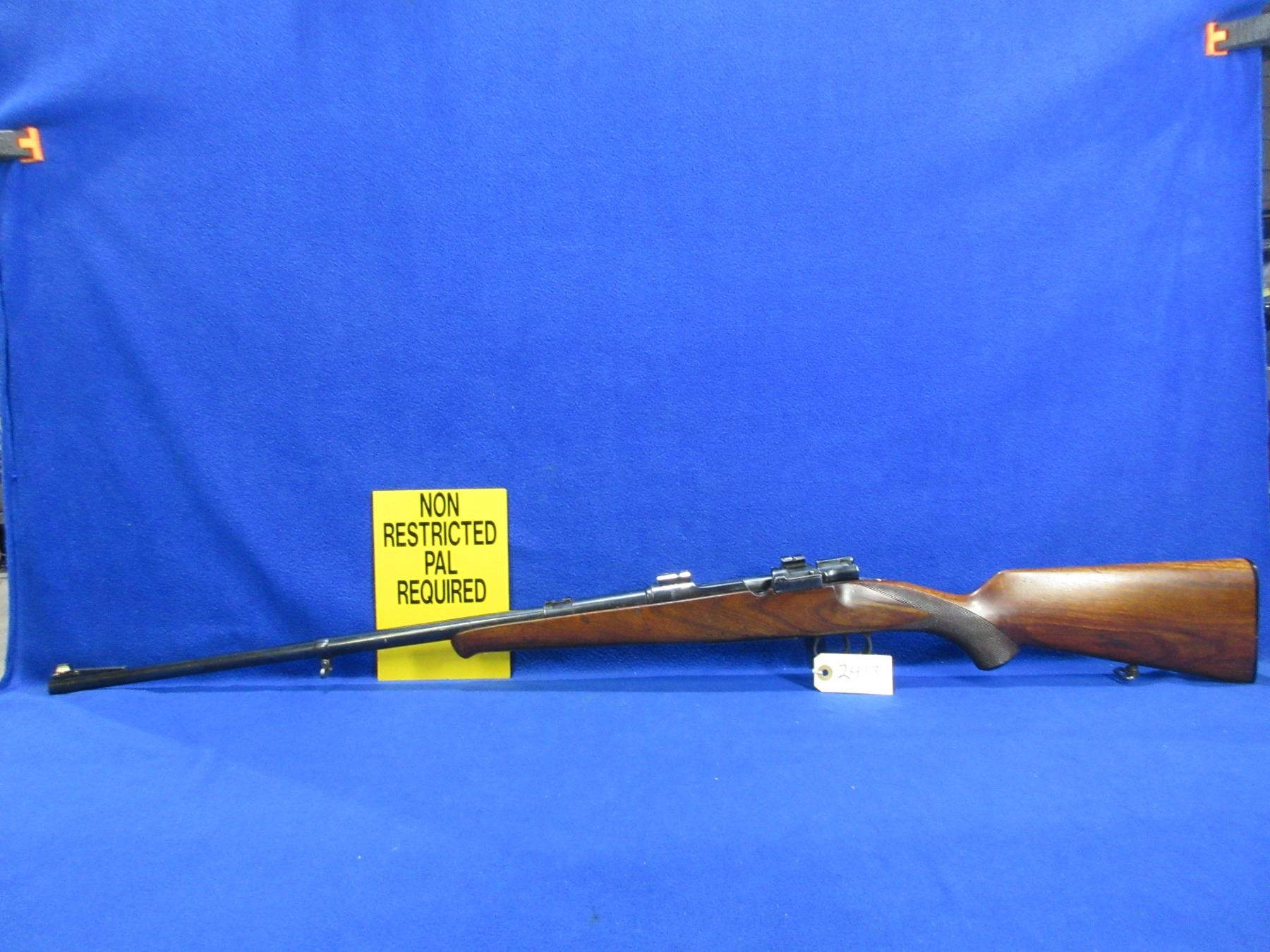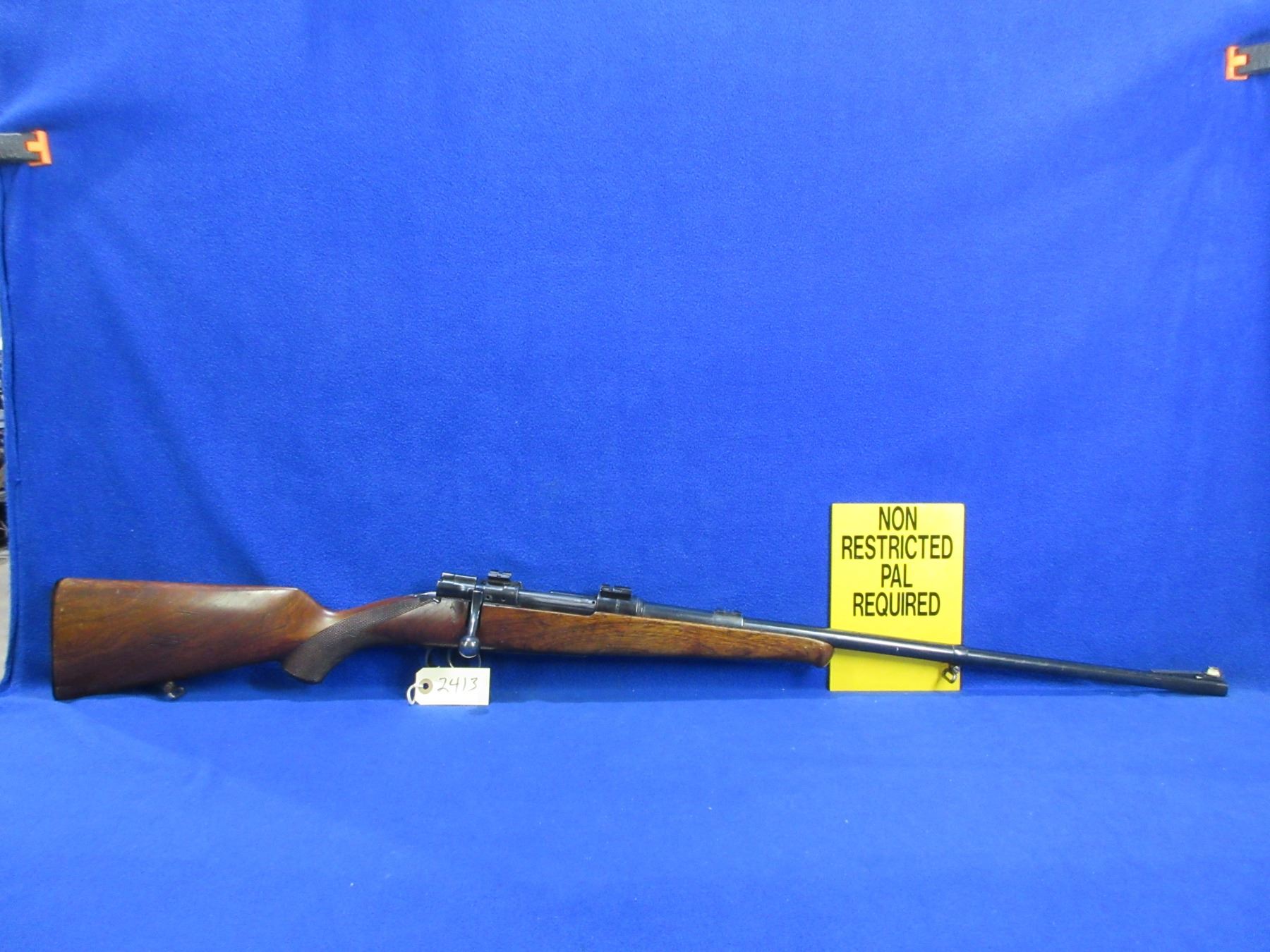 Non-Restricted - Husqvarna Model M96 in 6.5x55 - This is a bolt action rifle with floorplate magazine, action works well but magazine follower twists and pops out as may be incorrect to gun. Barrel is 23 1/2", rifling is good but dark, bluing is good to very good, has front sight, missing rear sight but has Weaver style bases, stock is good but has a crack on the toe, length of pull is 14 3/4", butt plate good, comes with swivels. Ser # 45385
