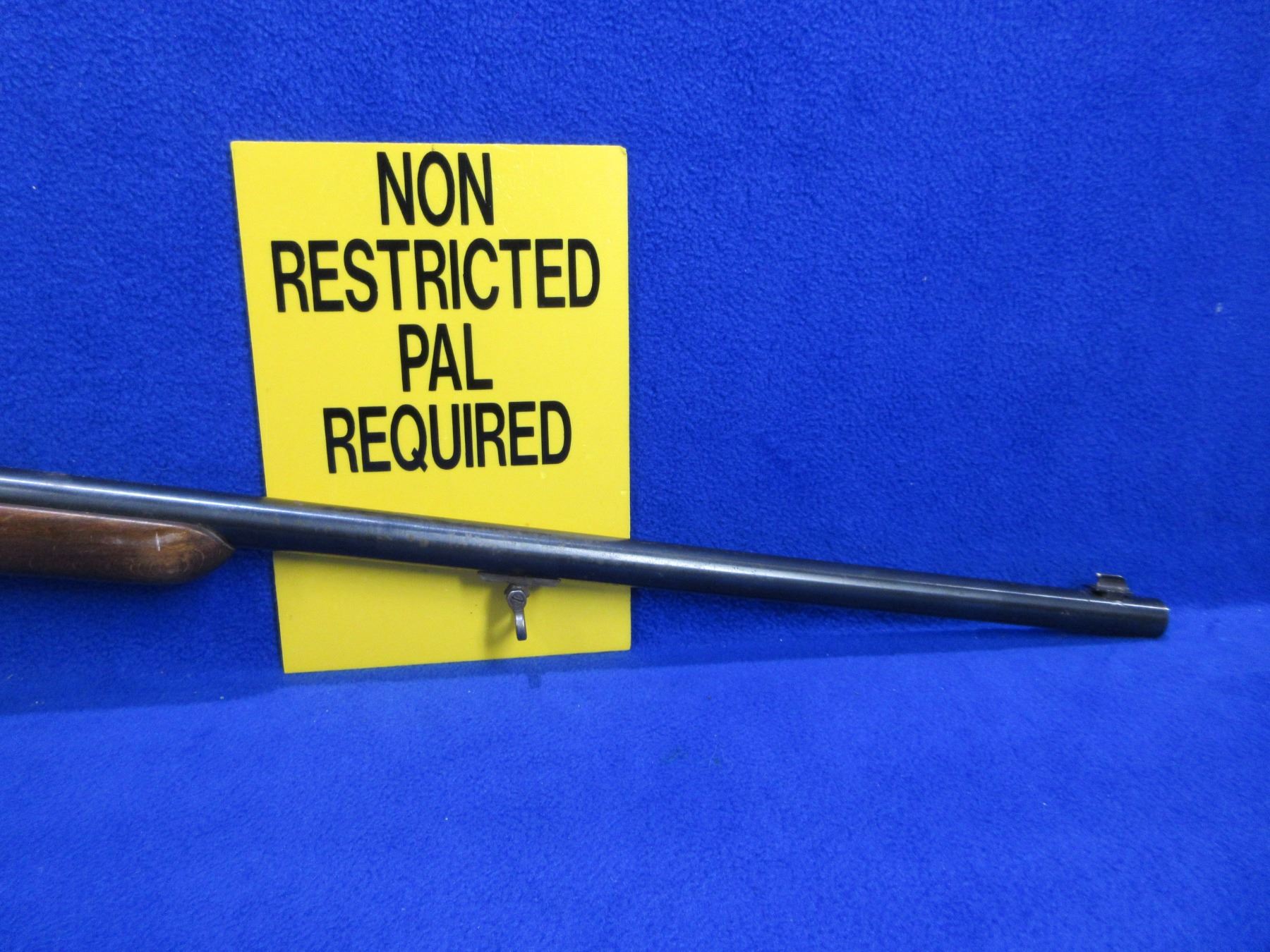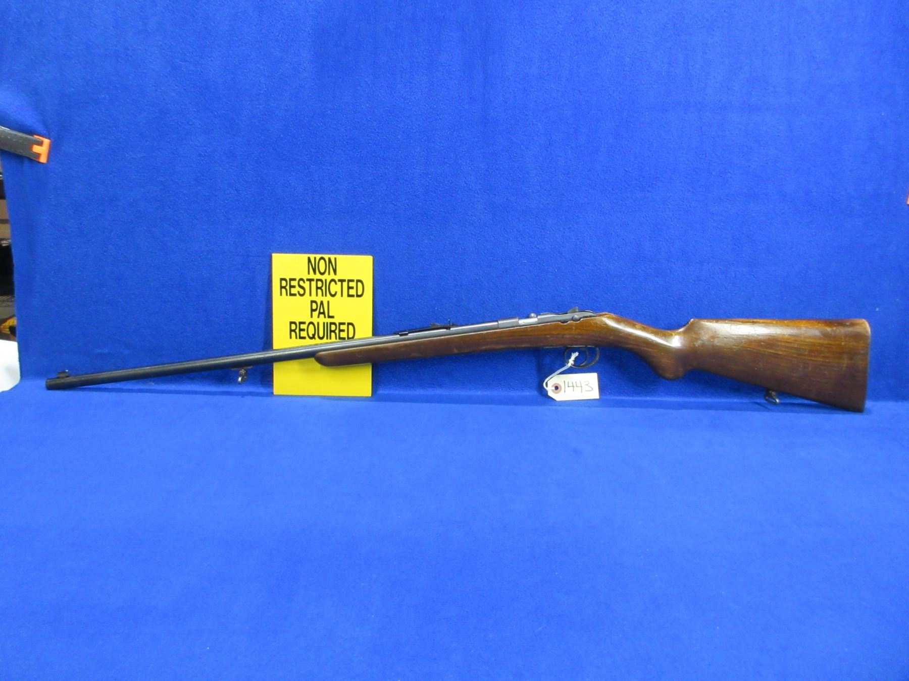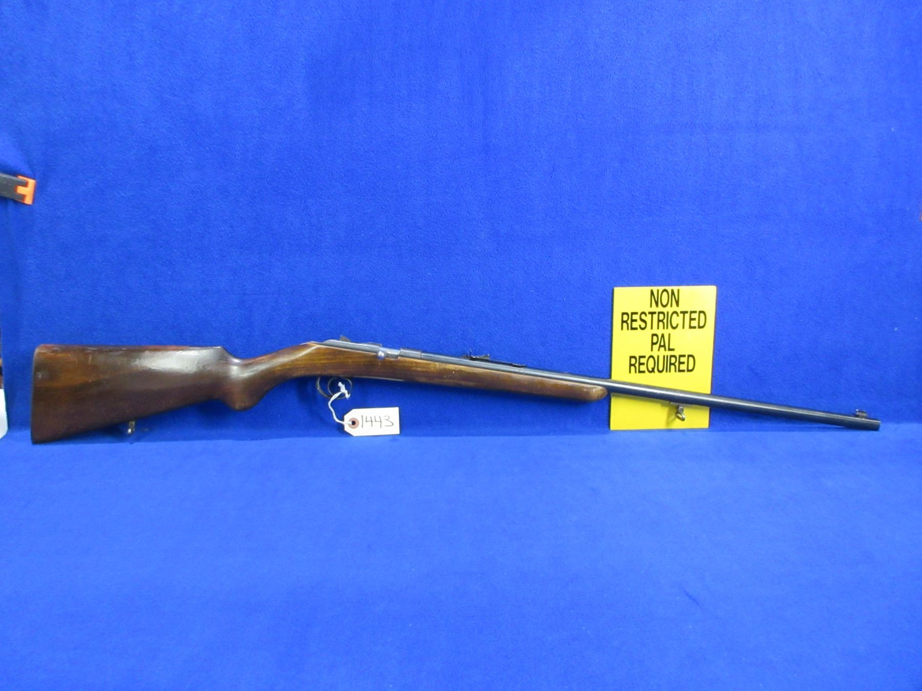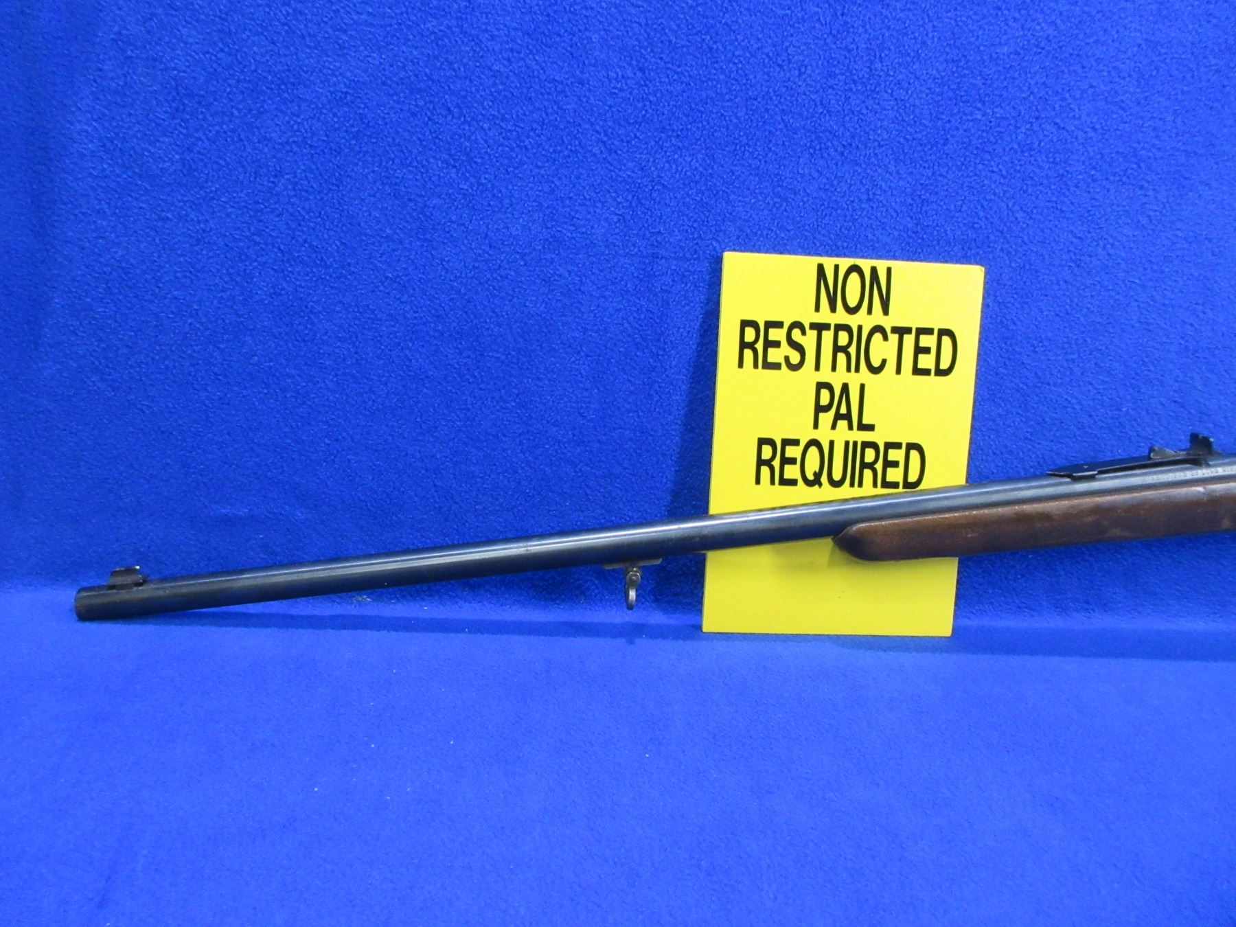 Non-Restricted - Husqvarna Sakrat in 22 LR - This single shot bolt action rifle appears to be in good working order. Barrel is 24 1/2", rifling is good to very good, bluing is good but has some rust and pitting, has both sights, stock is good with finish flaking and wear, metal butt plate good. Comes with swivels. Ser #75674