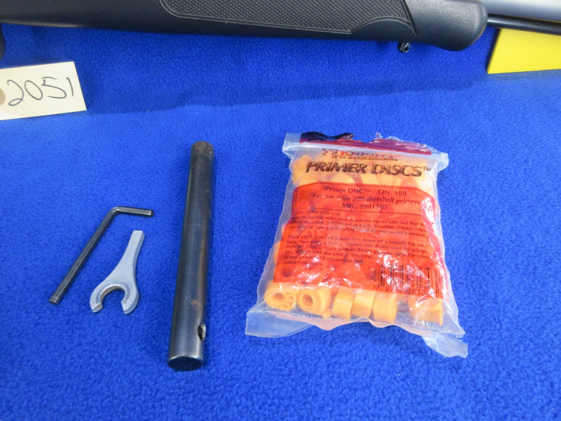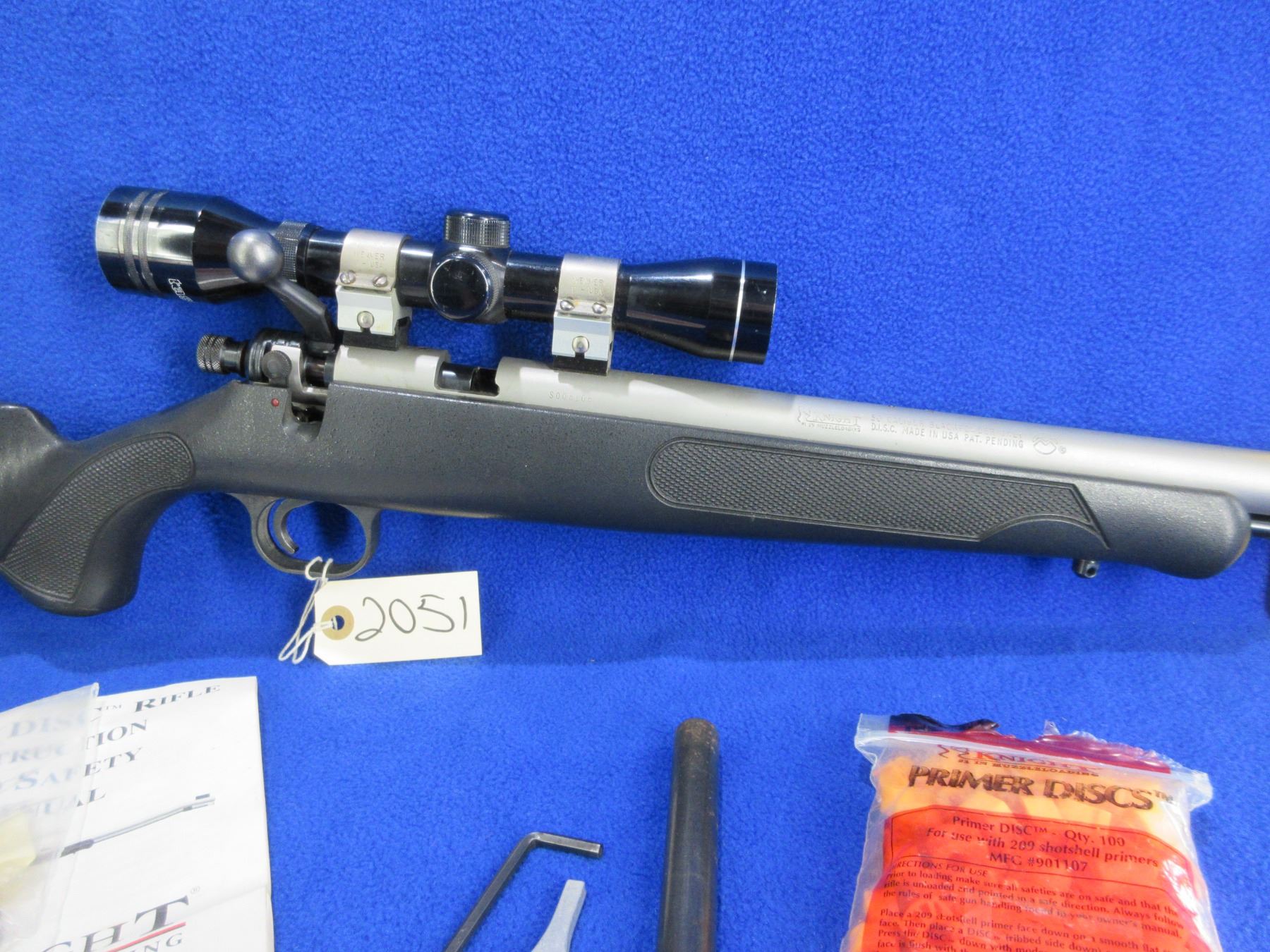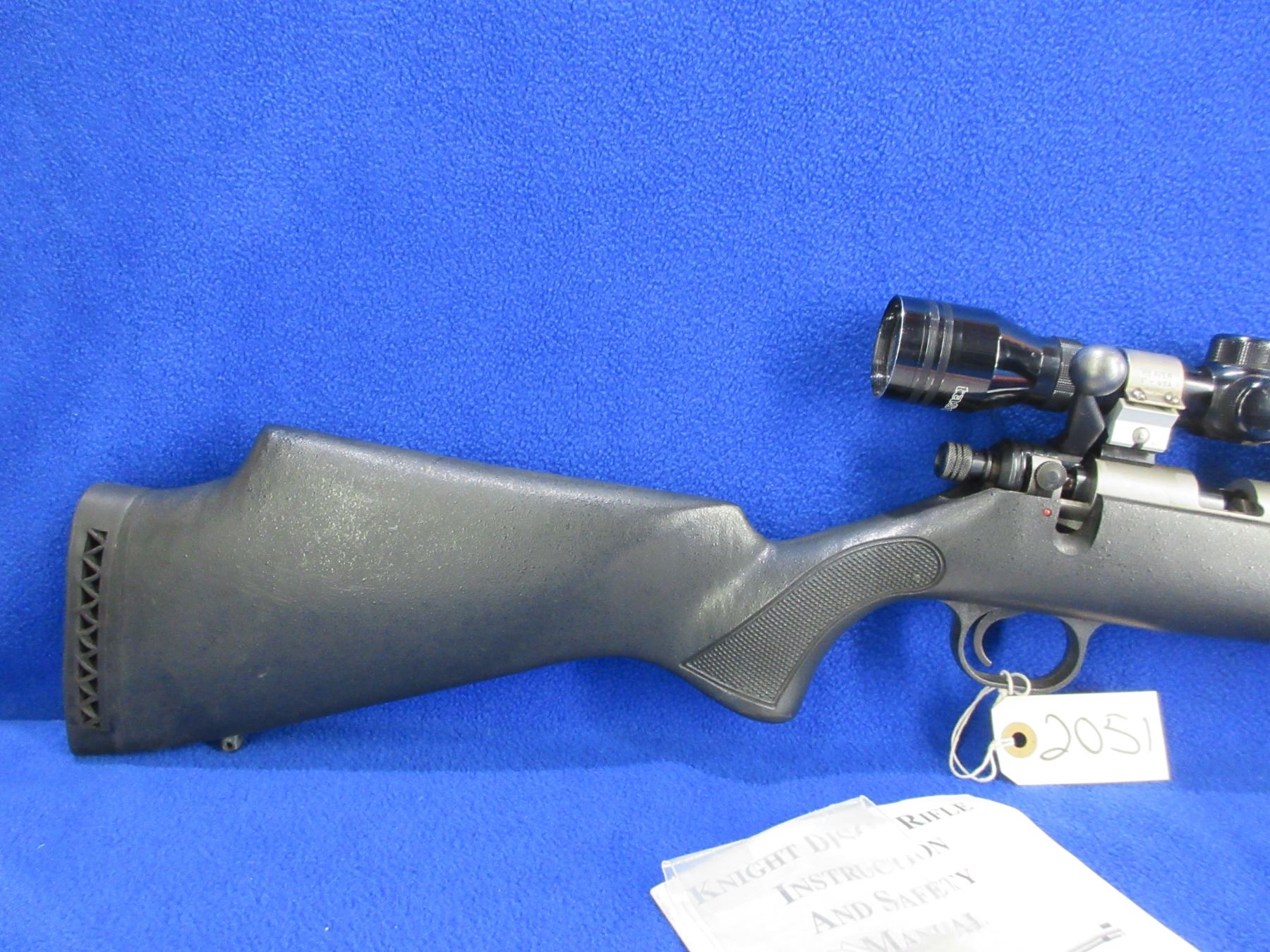 Non-Restricted - Knight D.I.S.C. Inline in 50 Cal. - This is a bolt action muzzleloading 209 primer rifle, action appears to be in good to very good working order. Stainless barrel is 22 3/4", rifling appears good, stainless finish is good, has front sight (rear sight in bag), has Tasco 4x32 sccope with Weaver rings - appears clear - duplex reticle, sunthetic stock is good, length of pull is 14 1/2", rubber recoil pad good, comes with swivel studs, ram rod, primer disks, chamber plug wrench and instruction manual. Ser # S005106