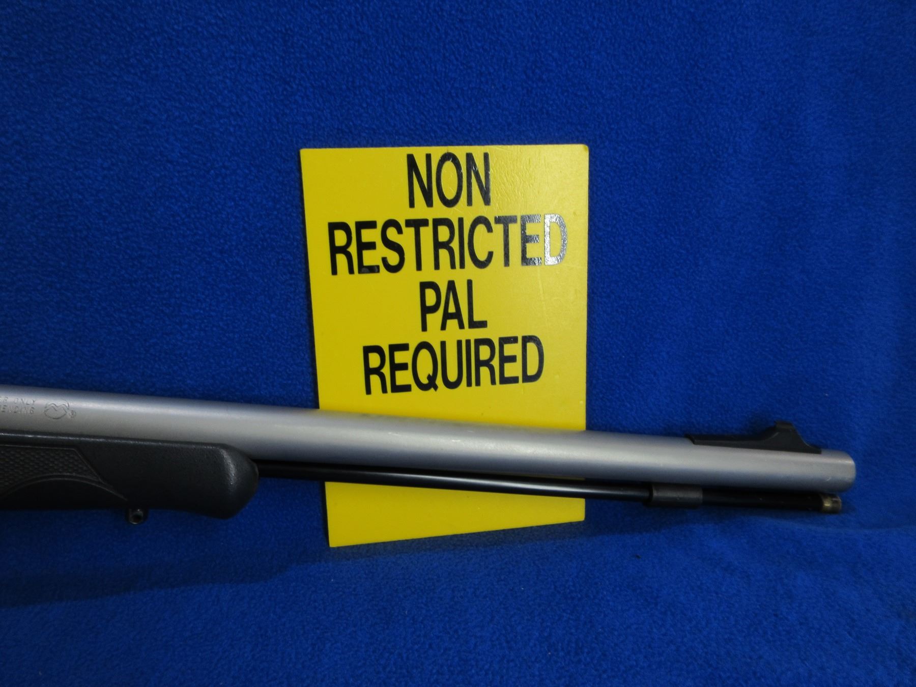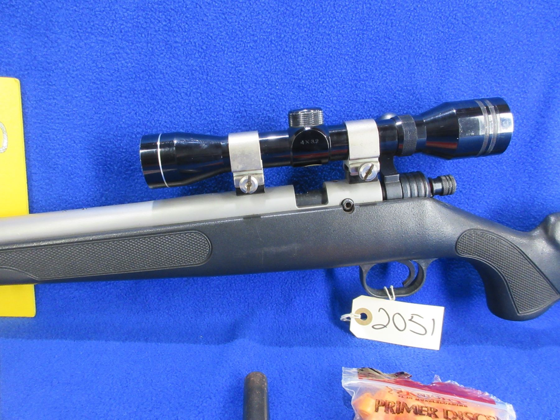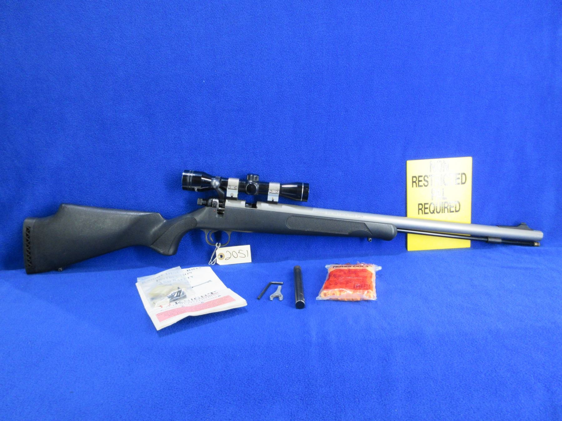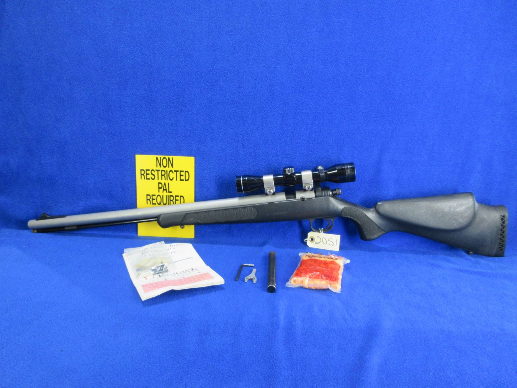 Non-Restricted - Knight D.I.S.C. Inline in 50 Cal. - This is a bolt action muzzleloading 209 primer rifle, action appears to be in good to very good working order. Stainless barrel is 22 3/4", rifling appears good, stainless finish is good, has front sight (rear sight in bag), has Tasco 4x32 sccope with Weaver rings - appears clear - duplex reticle, sunthetic stock is good, length of pull is 14 1/2", rubber recoil pad good, comes with swivel studs, ram rod, primer disks, chamber plug wrench and instruction manual. Ser # S005106