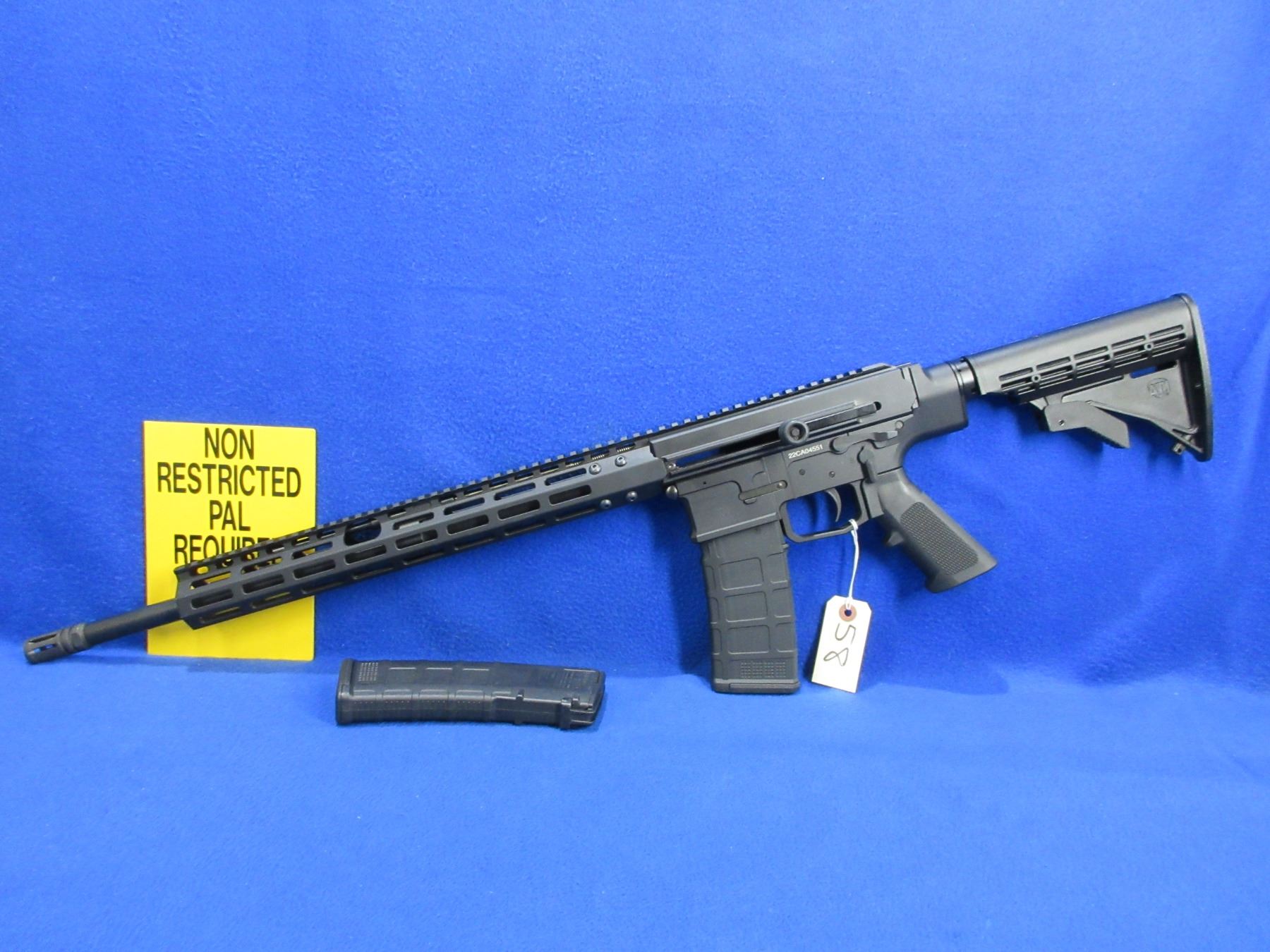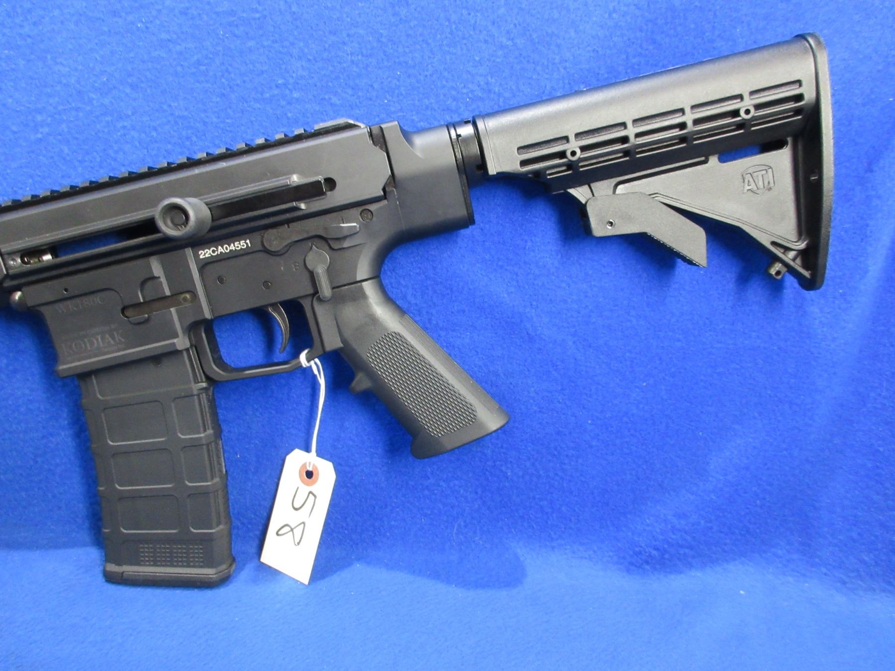 Non-Restricted - Kodiak WK180C in 5.56x45 - This semi-auto rifle with 2 removable magazines appears to be in very good working order. Barrel is 18.7", rifling is very good, bluing is good to very good, has no sights but has STANAG 4694 rail system, adjustable synthetic stock is very good. Comes with 2 magazines. Ser # 22CA04551