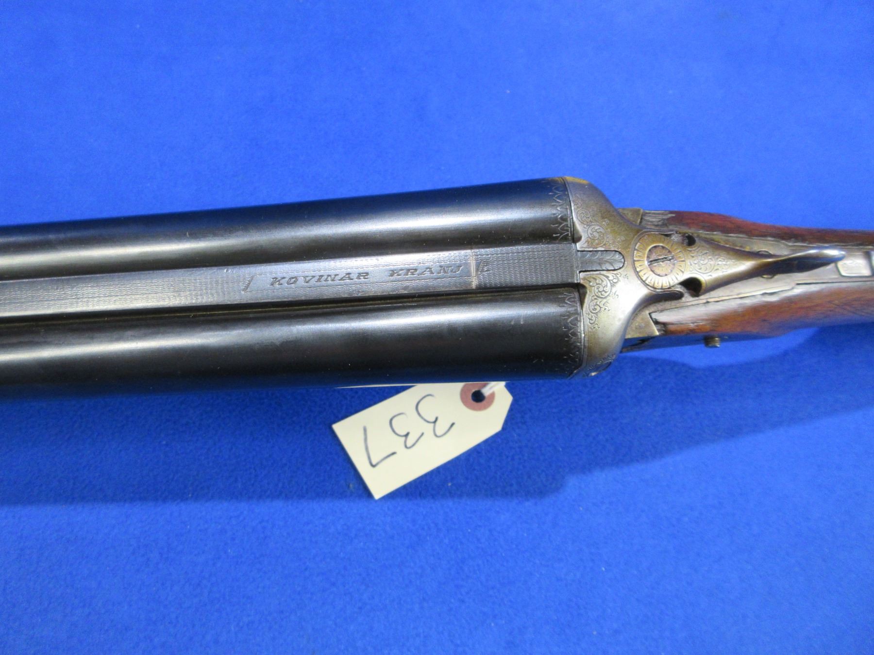 Non-Restricted - Kovinar Kranj in 12 Ga. 2 3/4" - This tip up SXS shotgun appears to be in working order, action has a small amount of play. Barrels are 28 3/4", bores are fair to good, bluing is good, has bead front sight, stock has chips and a cracks on both sides behind the action and a crack behind the upper tang, forearm is good but has a small chip at the back on the right side, butt plate, comes with swivels. Ser # 305