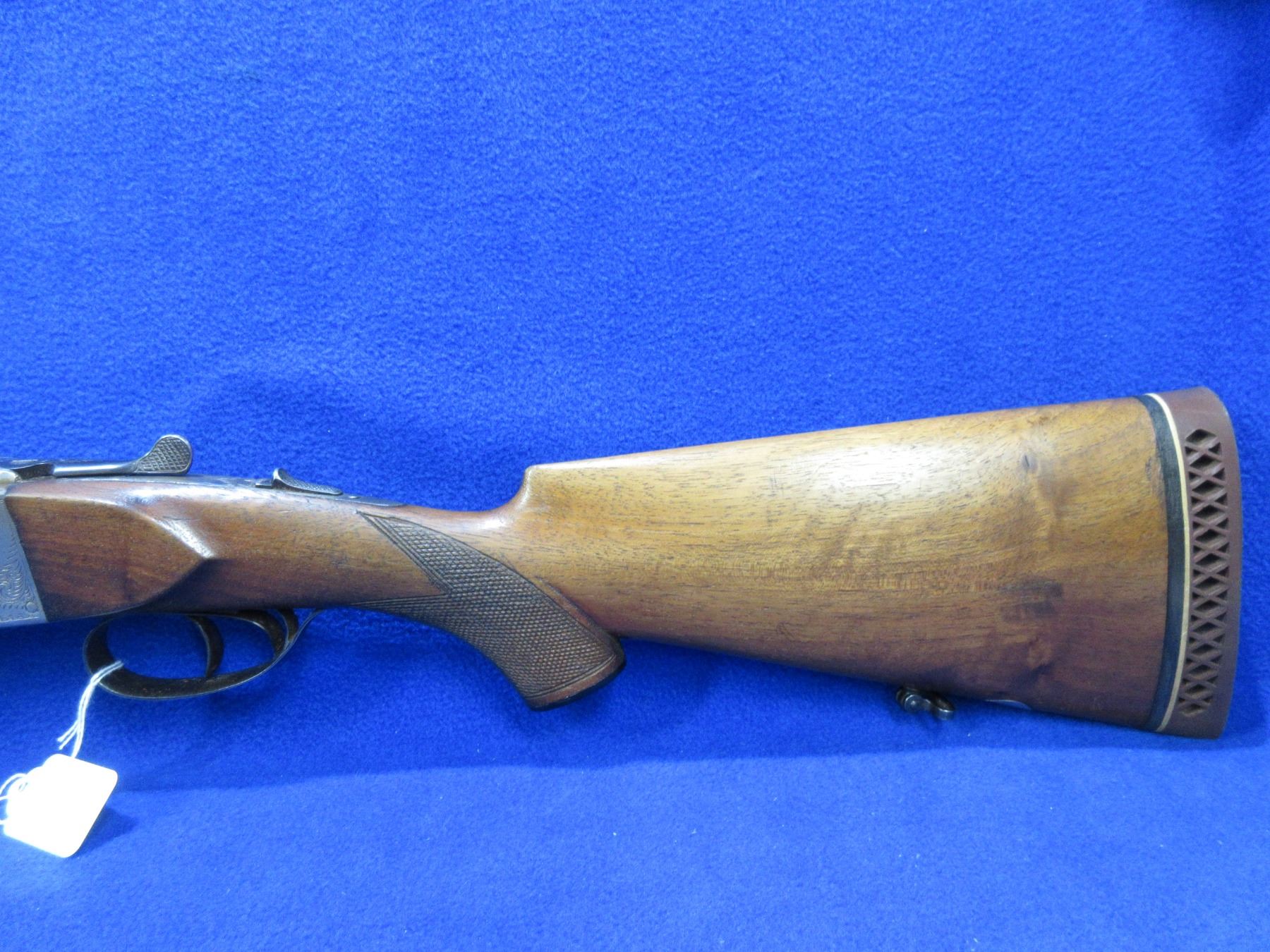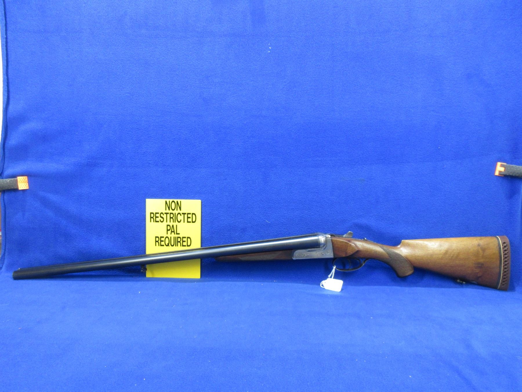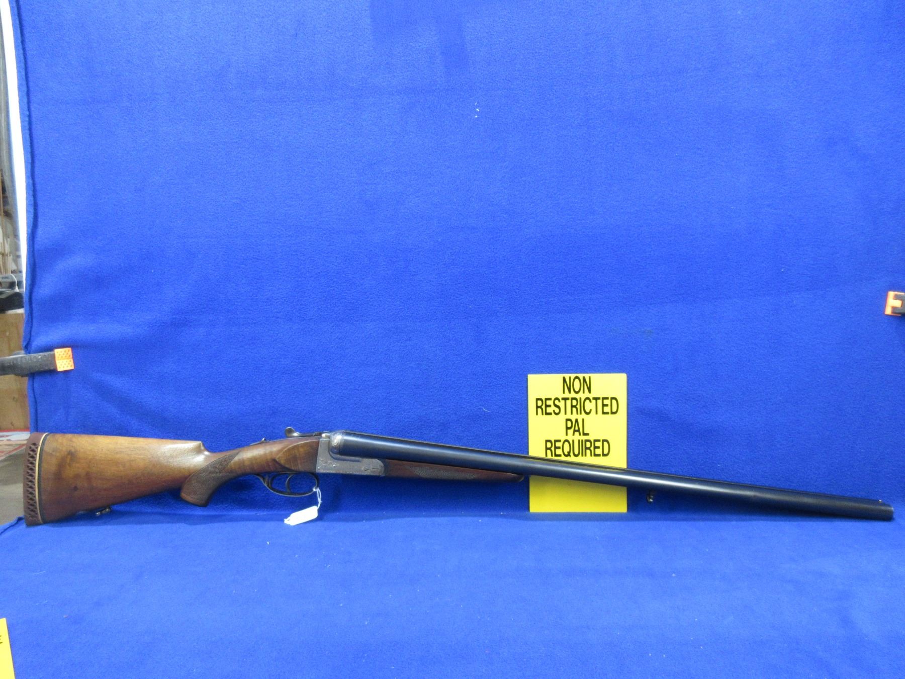 Non-Restricted - Laurona SXS in 12 Ga. 2 3/4" - This tip up SXS shotgun appears to be in working order but is missing the firing pins. Barrels are 27 7/8", bores are shiny but right barrel has dent approx. 7" from end of barrel, bluing and finish is good, has bead front sight, stock is good to very good, forearm is good to very good, rubber recoil pad good. Ser # 26404