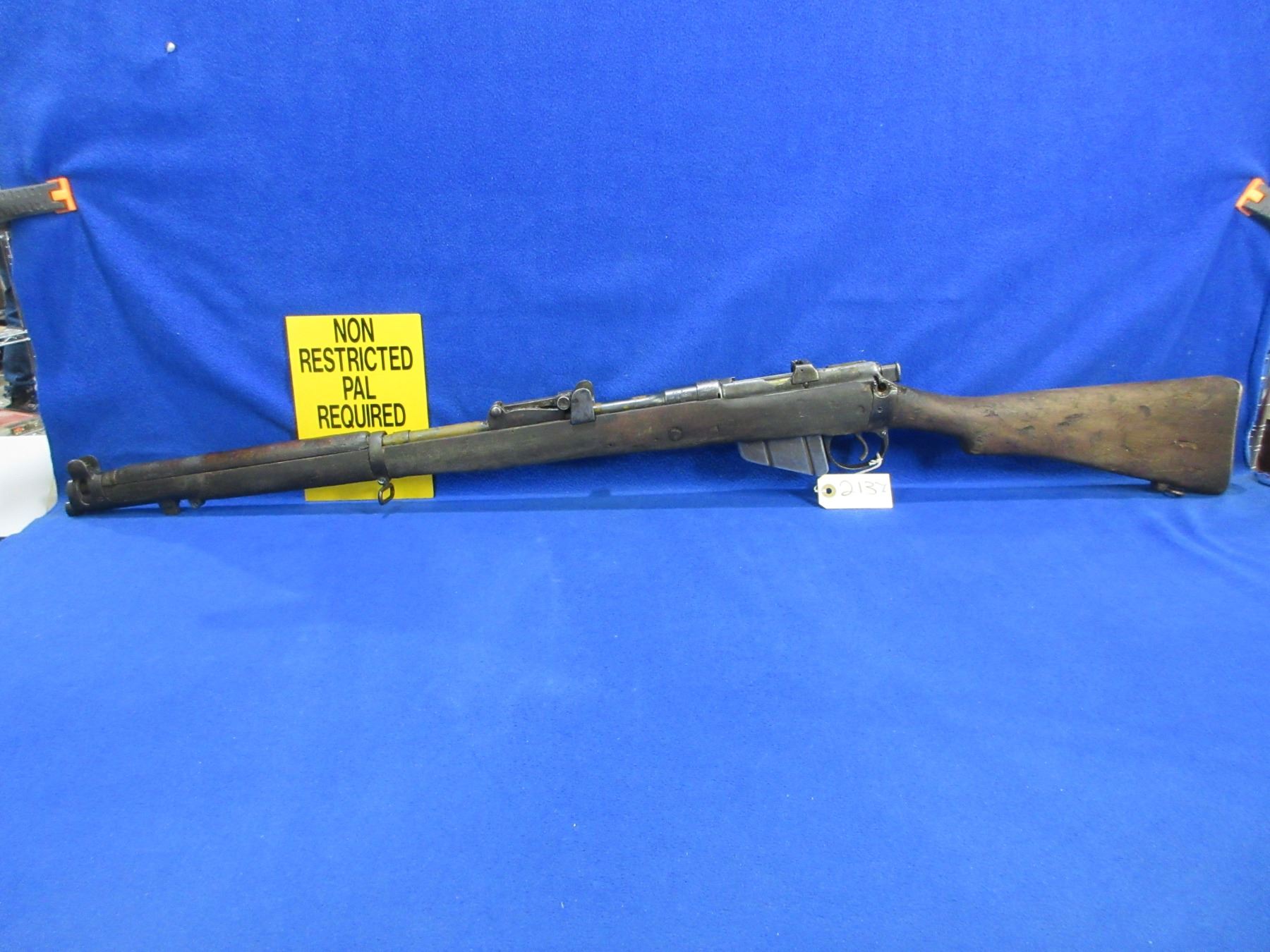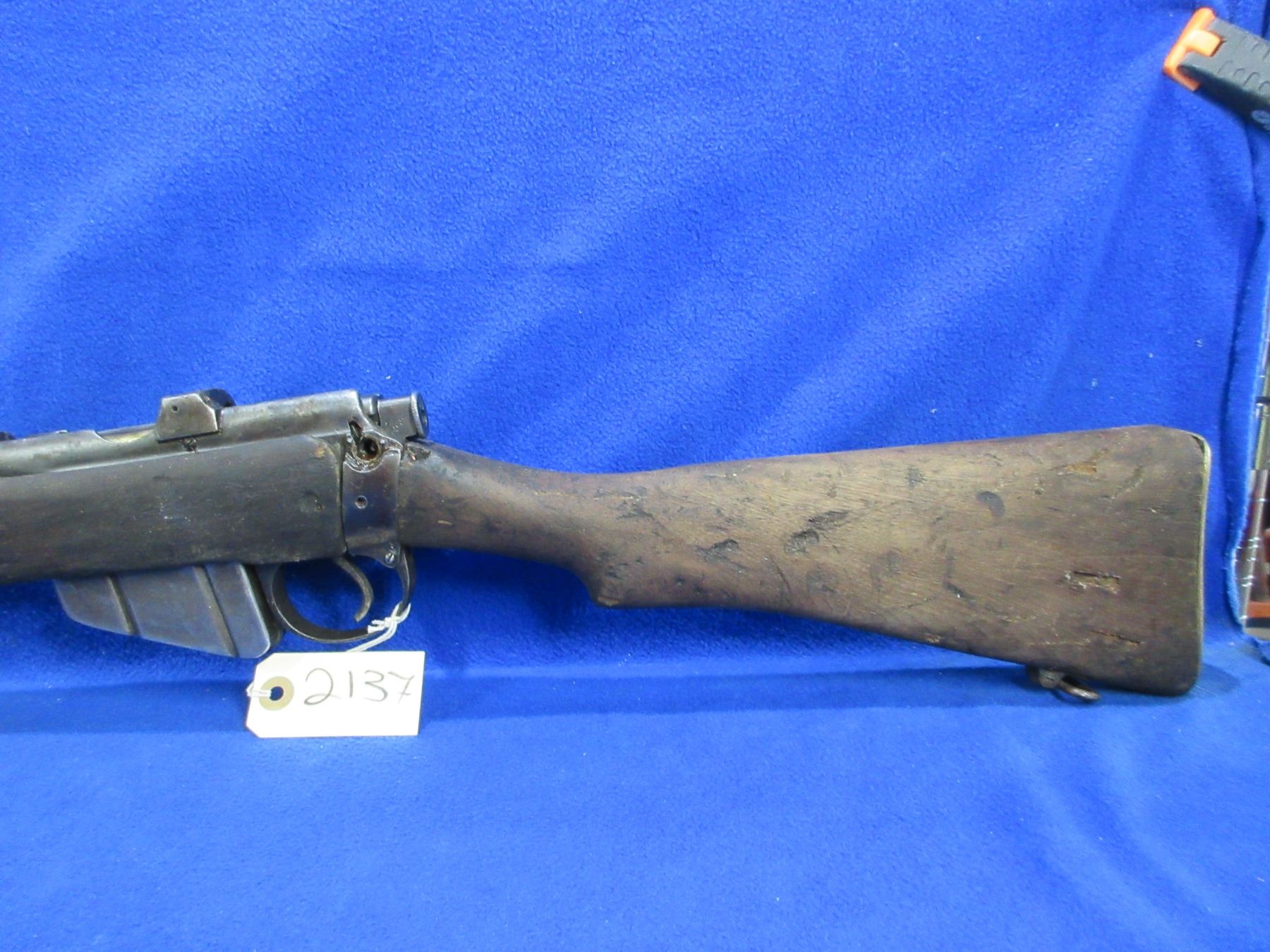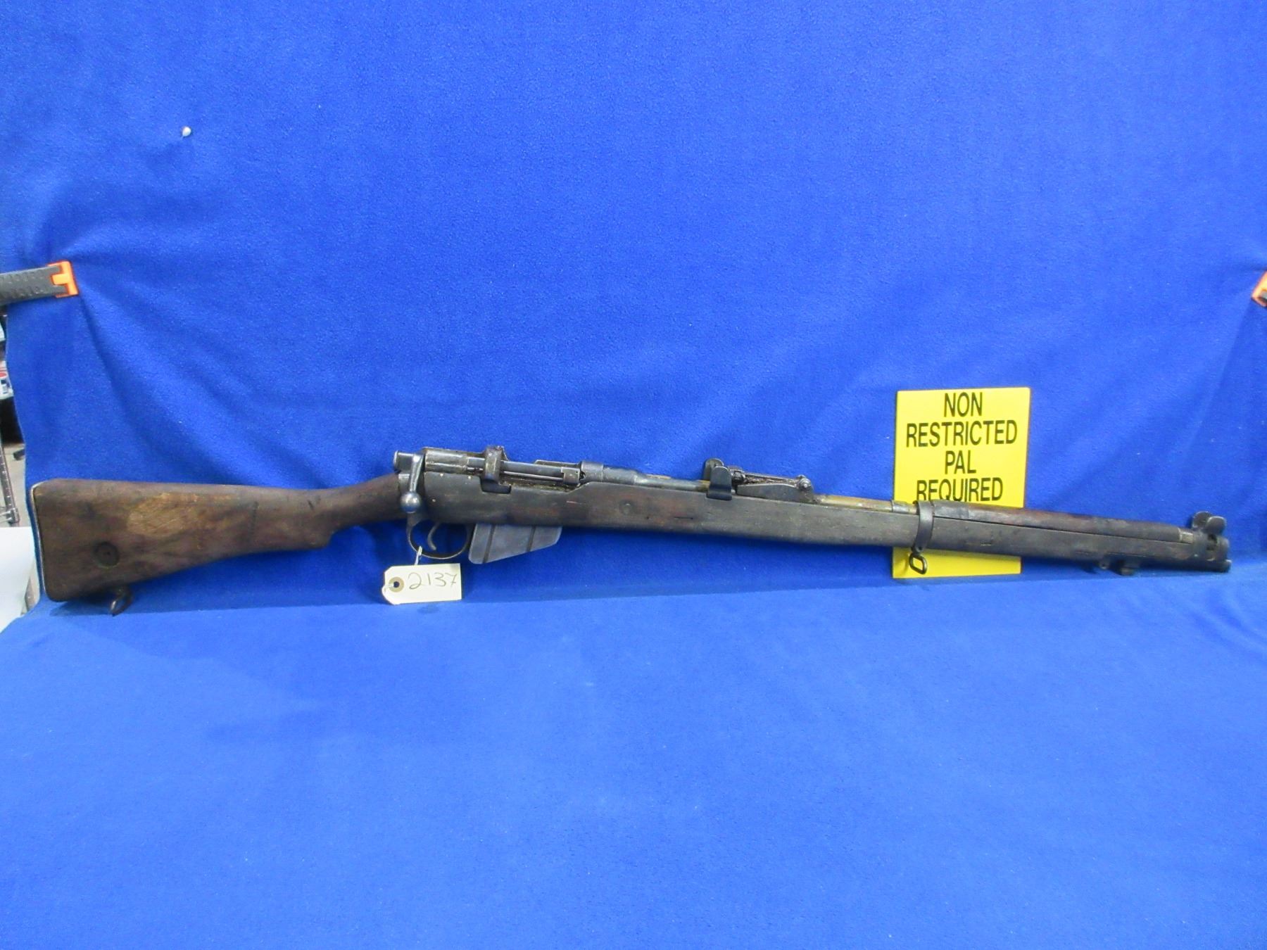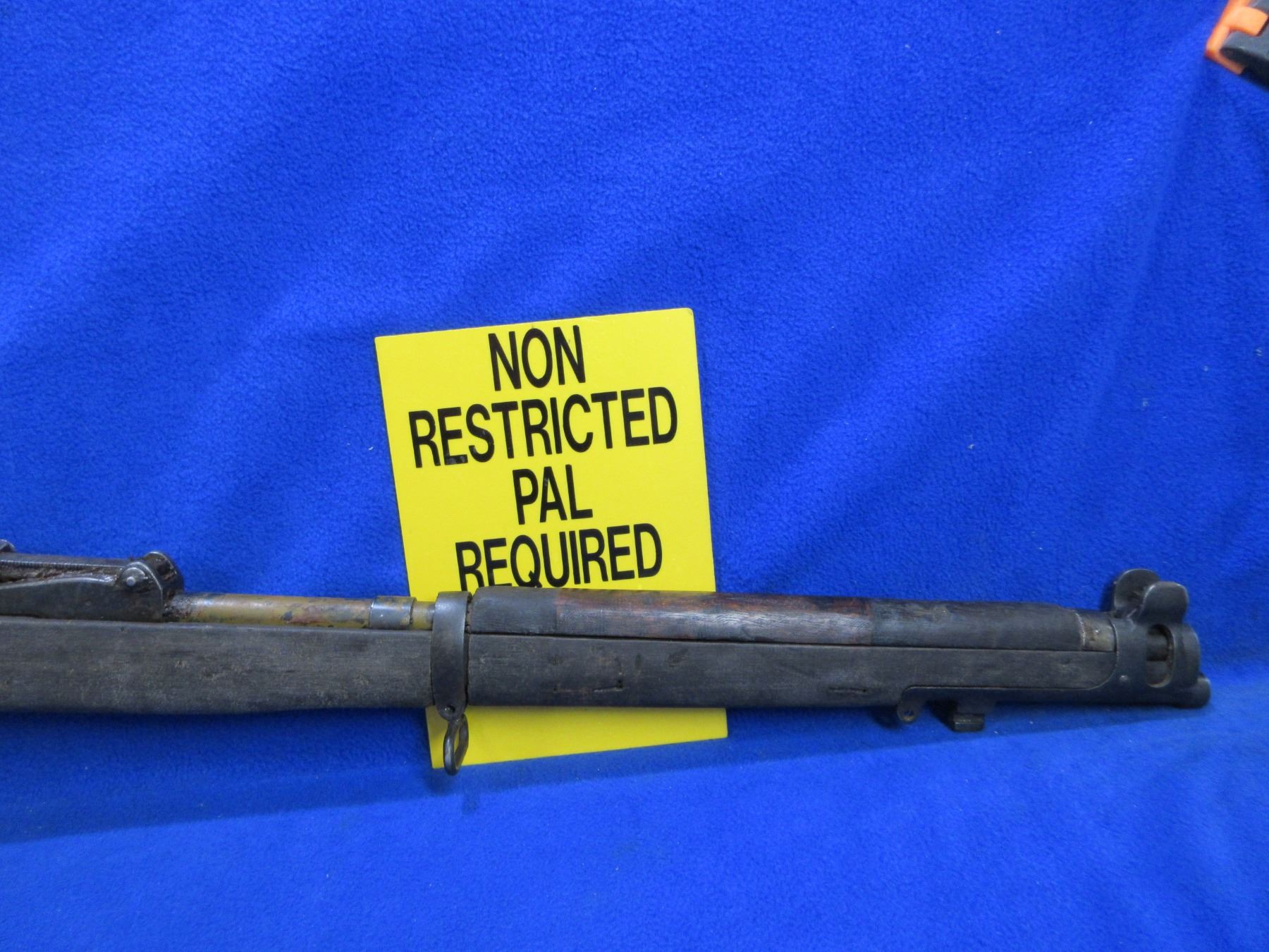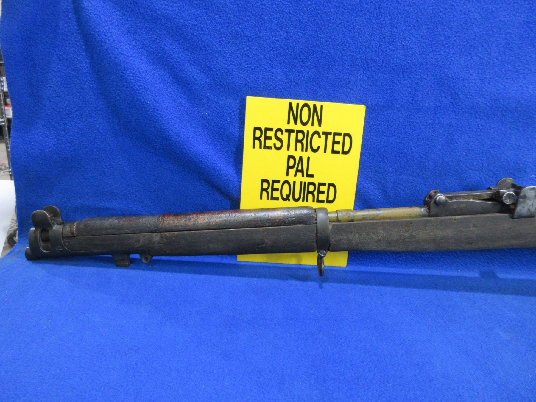 Non-Restricted - Lee Enfield No. 1 Mark III in 303 British - This rifle was packed in grease, marked "Crown over G.R, Enfield 1918 SHTLE III". This bolt action rifle with removable magazine appears to be in non working order as trigger spring appears broken. Barrel is 25", rifling is good to very good, bluing is poor to fair and has been painted, has both sights, full wood stock is good for age with many usage marks, rear handguard is missing and front handguard is damaged at the barrel ring, brass butt plate good, comes with swivels. Ser #H5471