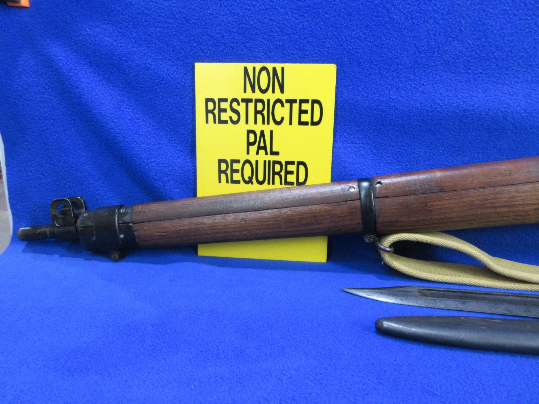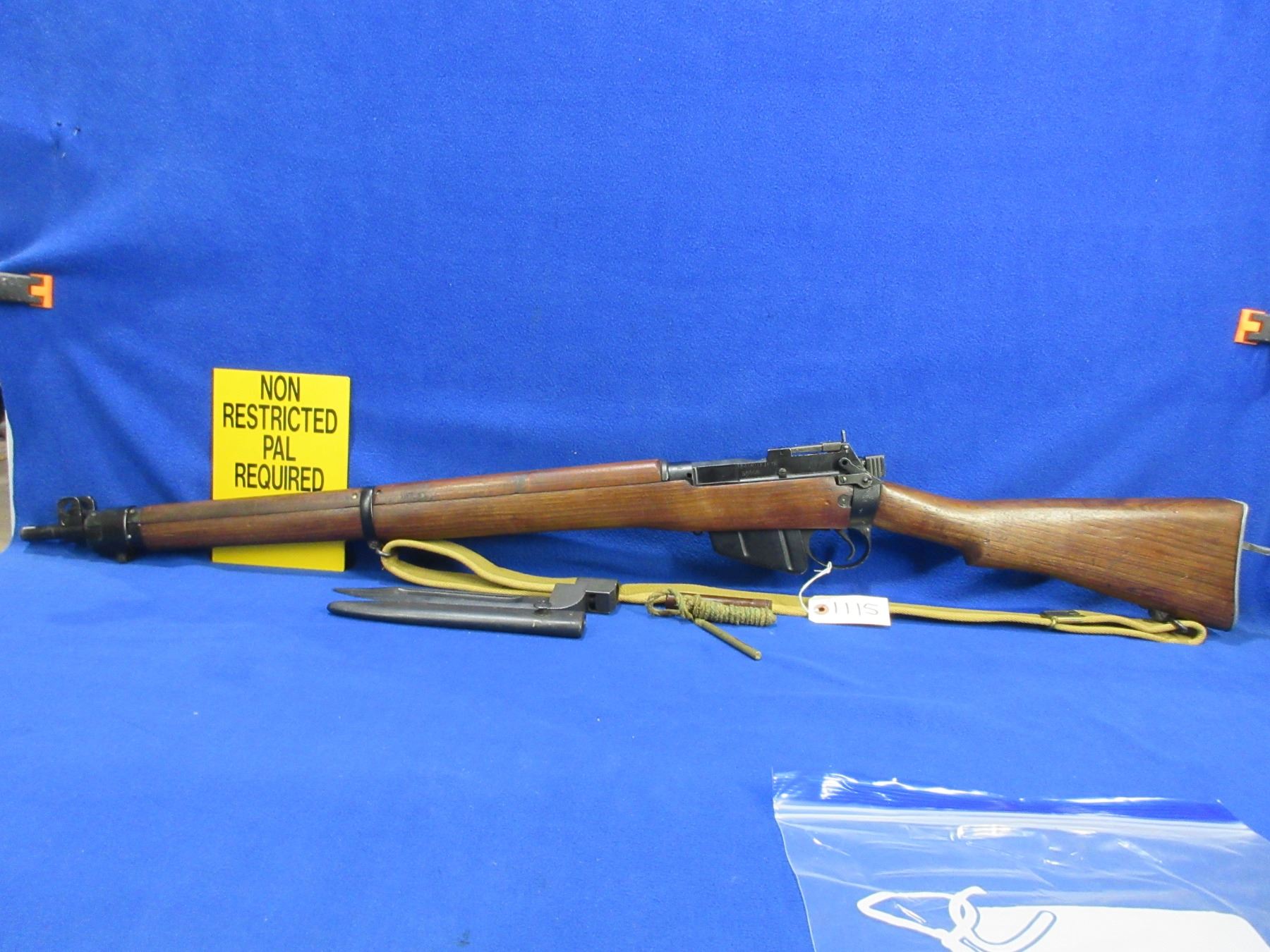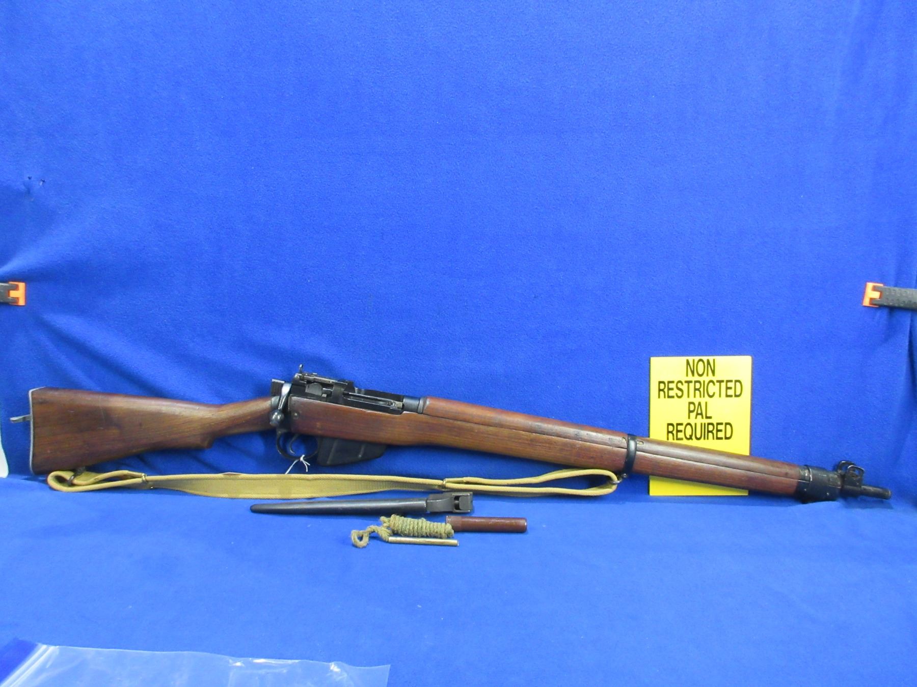 Non-Restricted - Lee Enfield No. 4 Mark I in 303 British - This bolt action rifle with removable magazine appears to be in good to very good working order. Barrel is 25", rifling is good to very good, bluing is good, has both sights, full wood stock is good with usage marks, butt plate good, comes with swivels, bayonet and sling, has oiler and cleaning rod in end of stock, rifle appears numbers matching. Ser #S6806