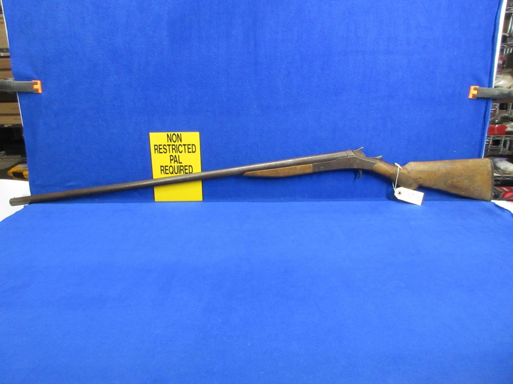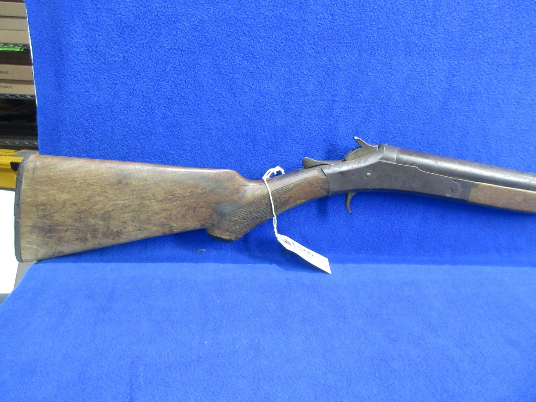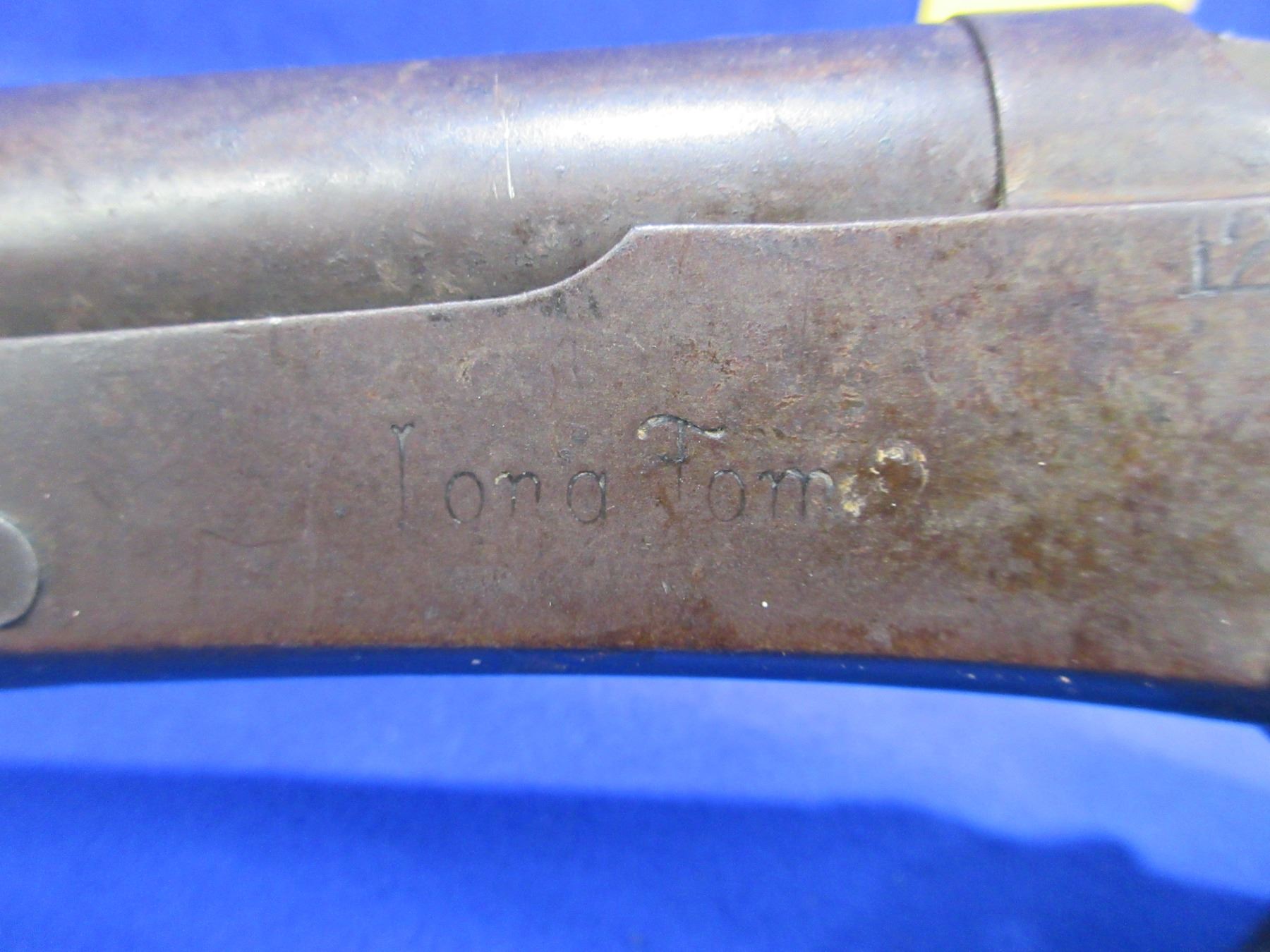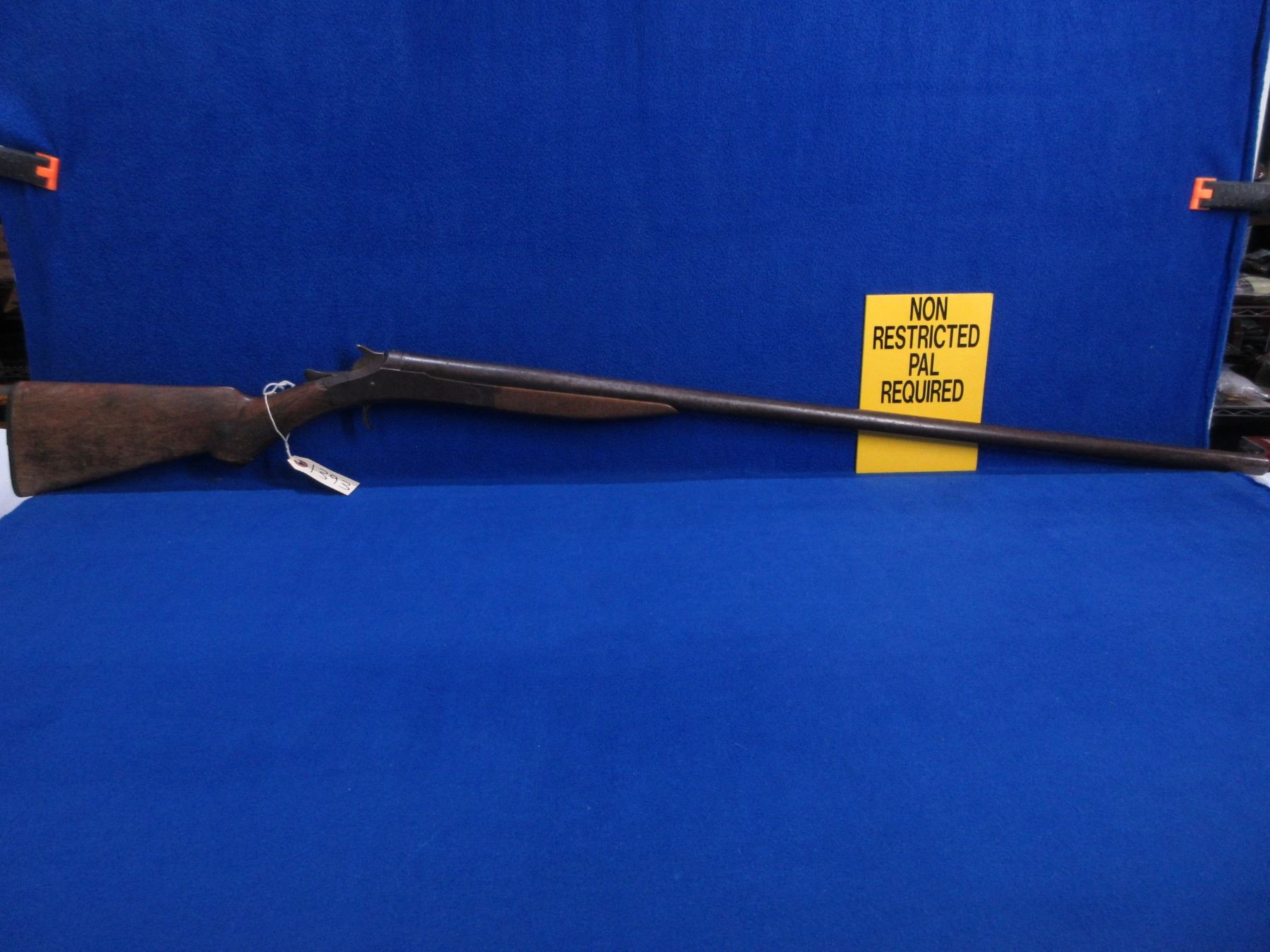 Non-Restricted - Long Tom in 12 Ga. 2 3/4" - This tip up single shot shotgun appears to be in non working order as stock is broken and action is loose. Barrel is 36", bore is poor to fair, bluing is turning brown with pitting, has bead front sight, stock is broken, forearm has a crack on the bottom, trigger guard is missing, rubber recoil pad good. Ser # 478866
