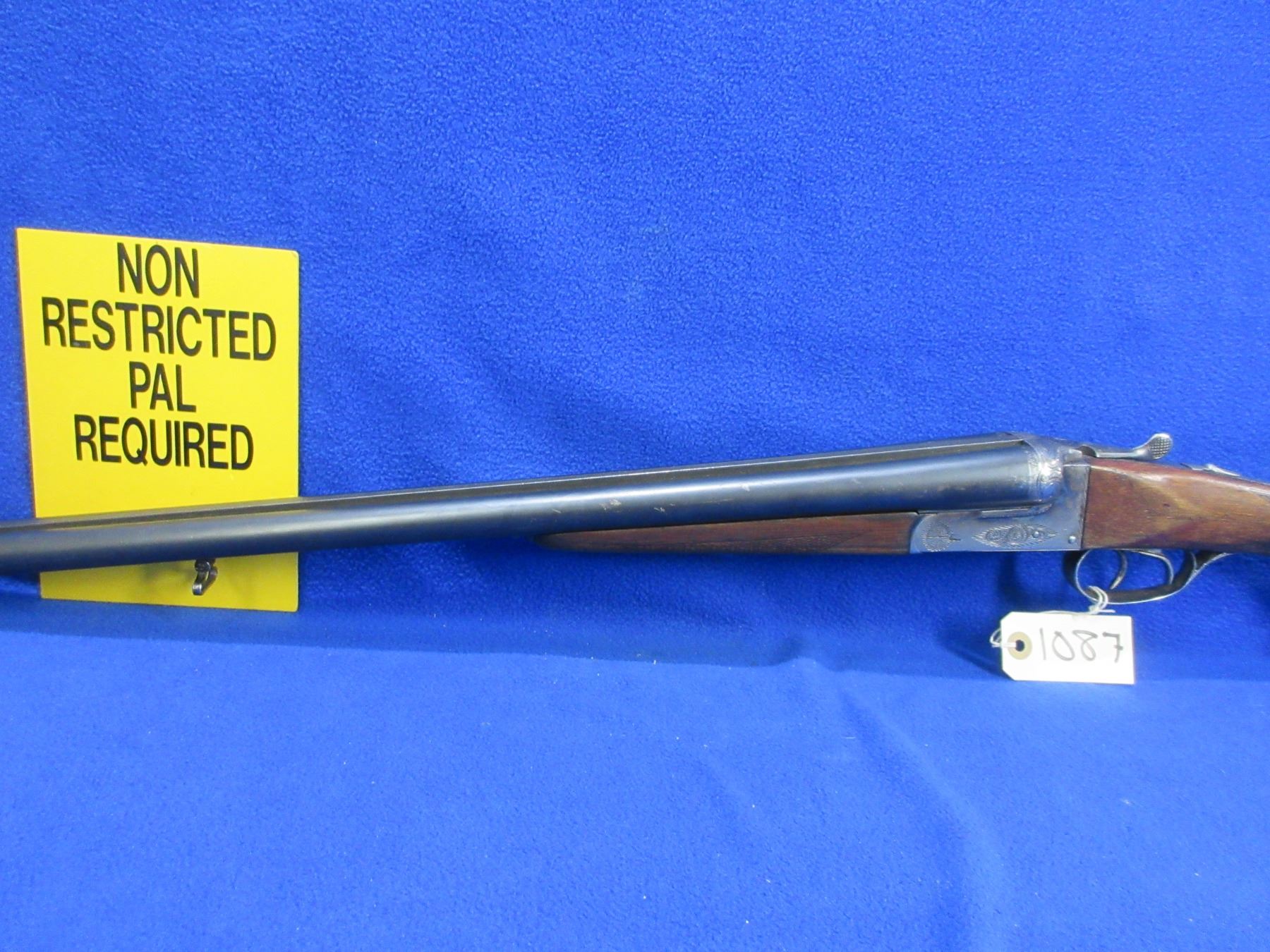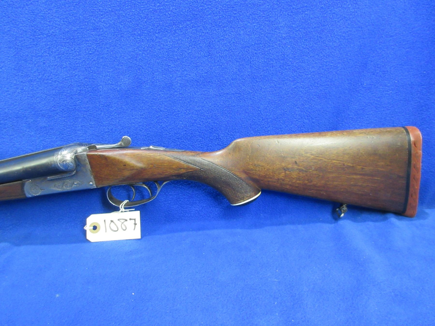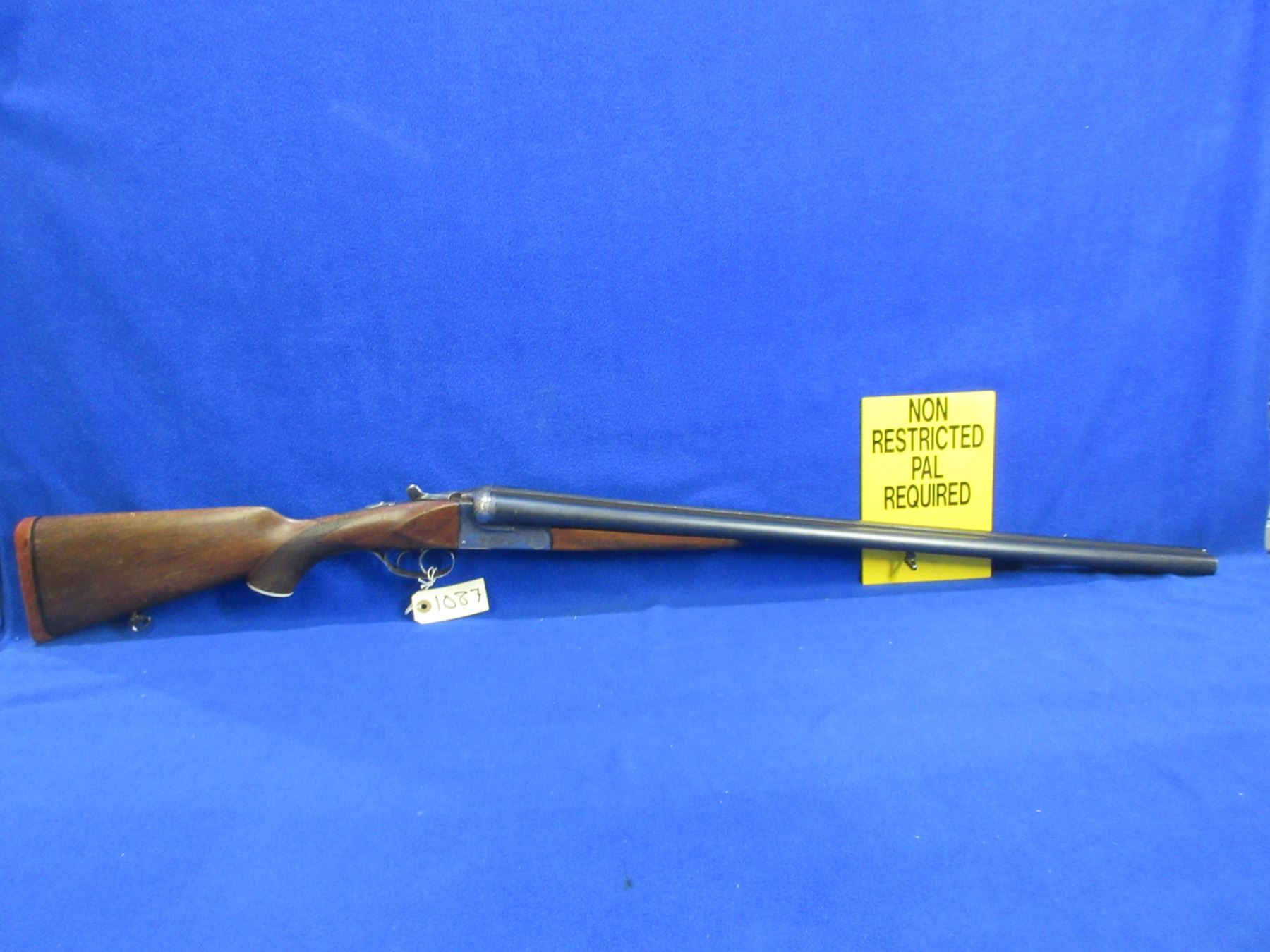Non-Restricted - Manhela SXS in 12 Ga. 2 3/4" - This is a tip up SXS shotgun, engraved action is tight and appears to be in good to very good working order. Barrels are 27 3/4", bores are good, bluing is good with some light scratches, has bead front sight, stock has a crack in the wrist area, forearm is good with usage marks, length of pull is 14 1/4", rubber recoil pad poor, comes with swivels. Ser # 23363