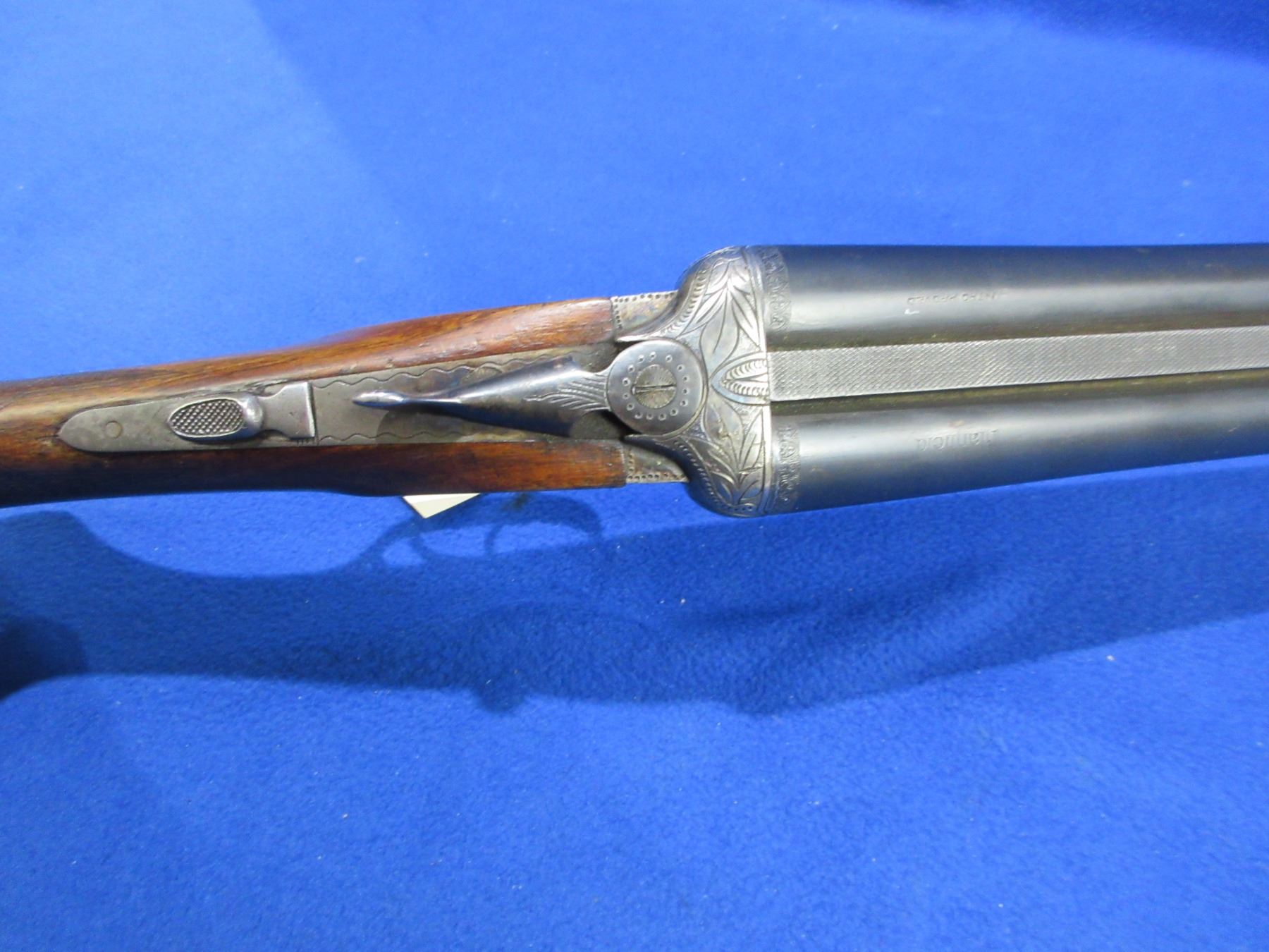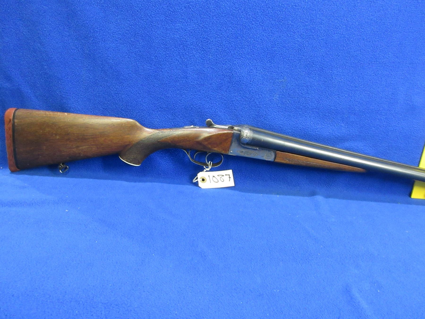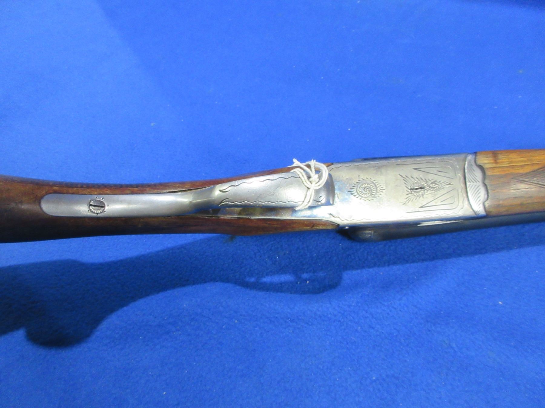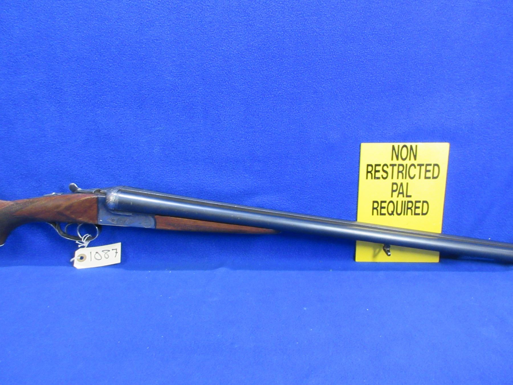 Non-Restricted - Manhela SXS in 12 Ga. 2 3/4" - This is a tip up SXS shotgun, engraved action is tight and appears to be in good to very good working order. Barrels are 27 3/4", bores are good, bluing is good with some light scratches, has bead front sight, stock has a crack in the wrist area, forearm is good with usage marks, length of pull is 14 1/4", rubber recoil pad poor, comes with swivels. Ser # 23363
