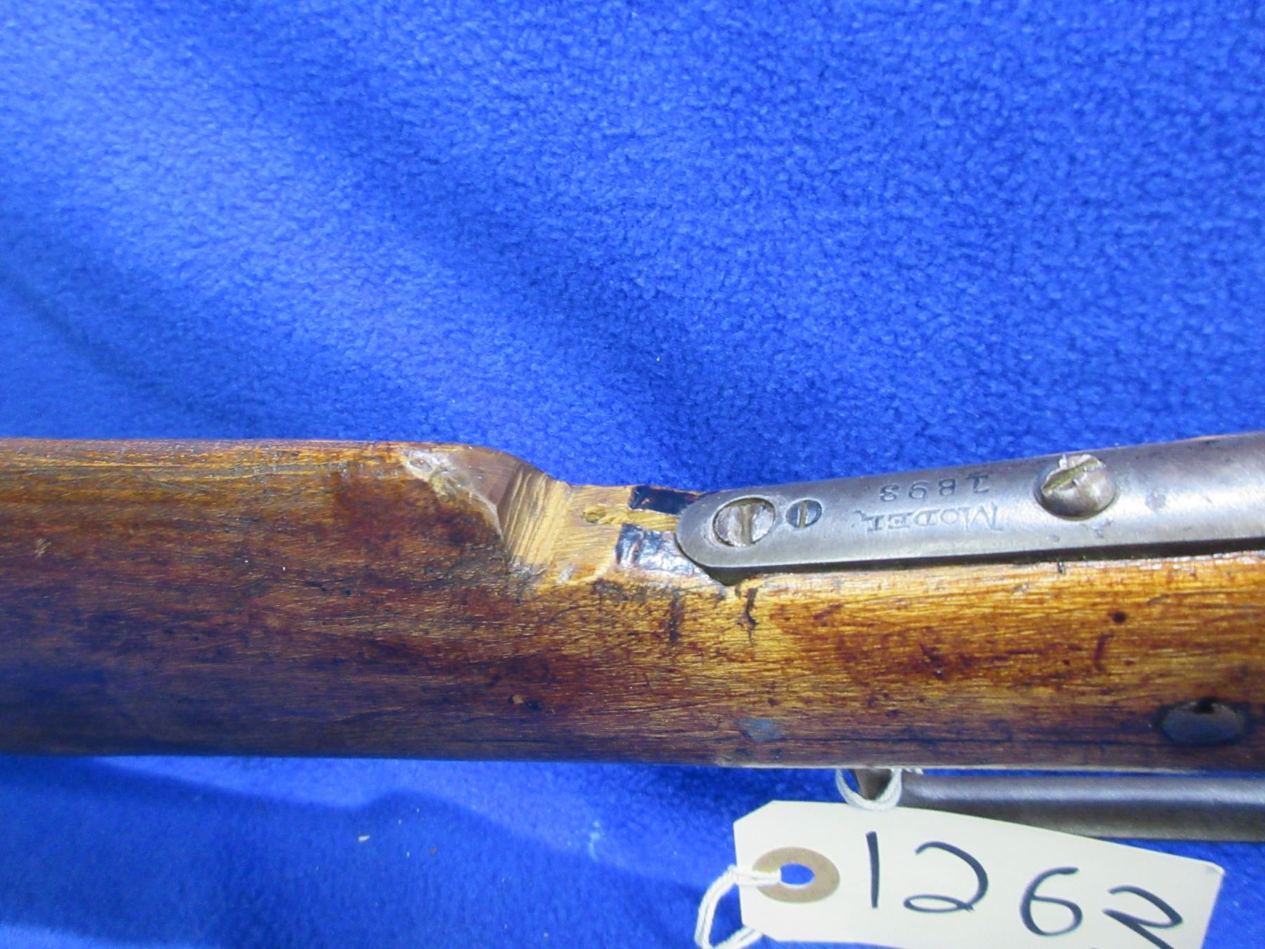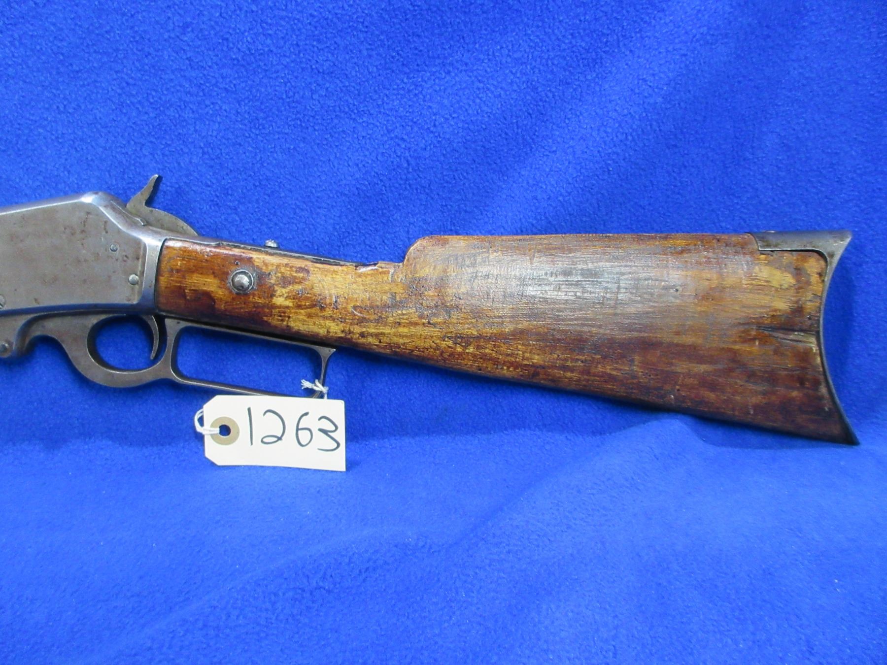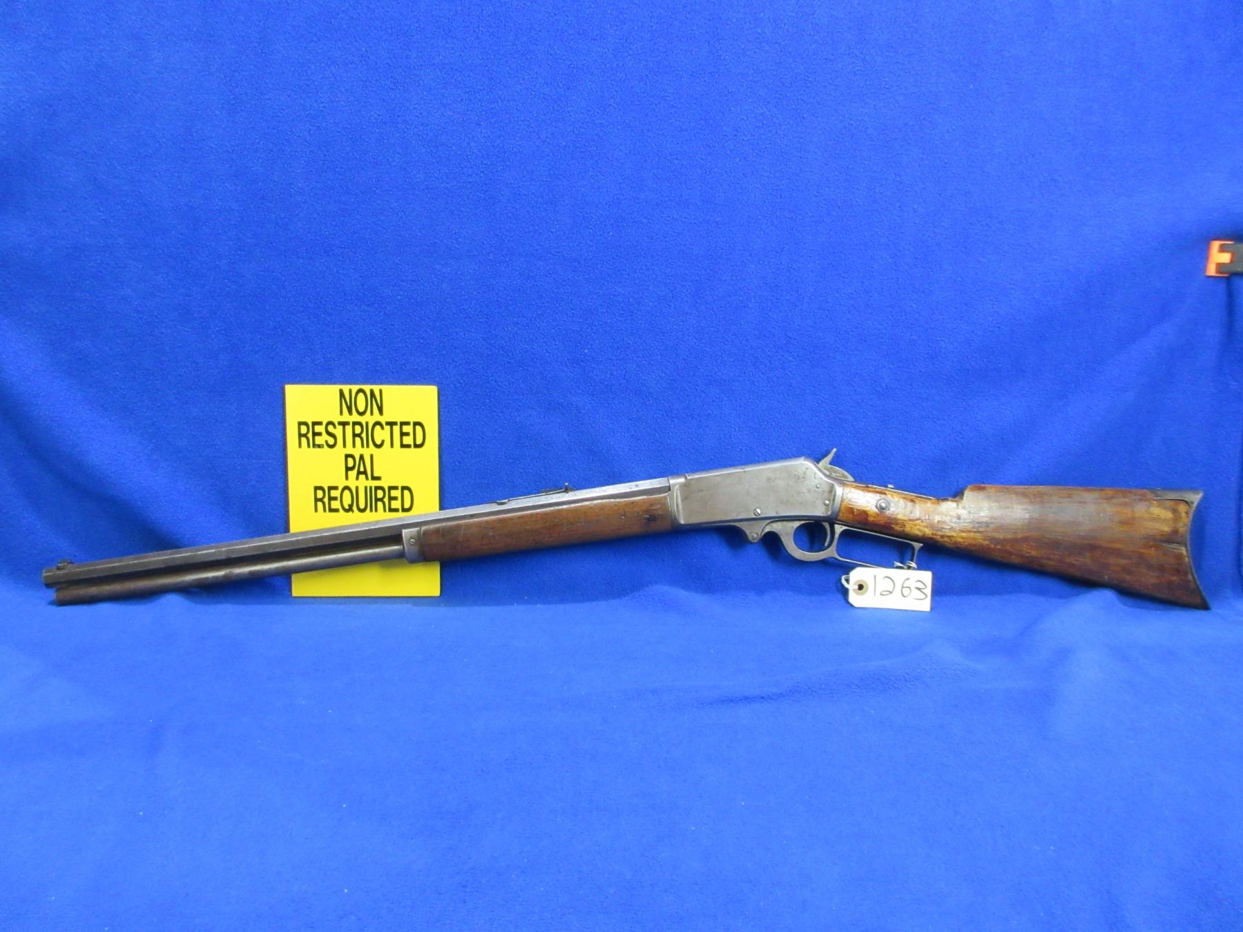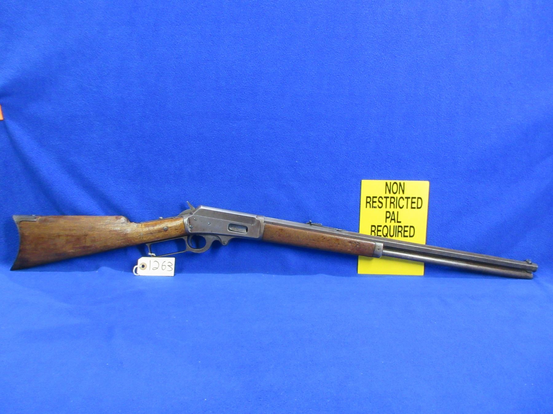 Non-Restricted - Marlin Model 1893 in 25-36 Marlin - Made in approx 1904, this is a lever action rifle with tube magazine, action appears to be in good working order. Octagon barrel is 21 3/4", rifling is fair to good with some pitting, bluing is turning brown or gone, has both sights, stock is poor and had been pinned in the wrist area, forearm has a chip at the top left side at the back, crescent metal butt plate good. Ser #264440