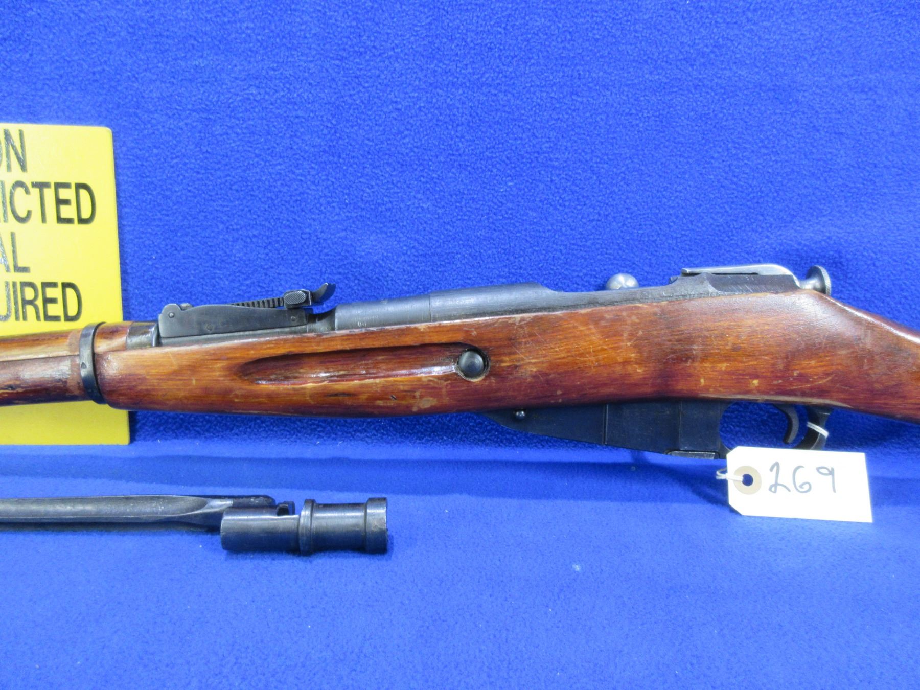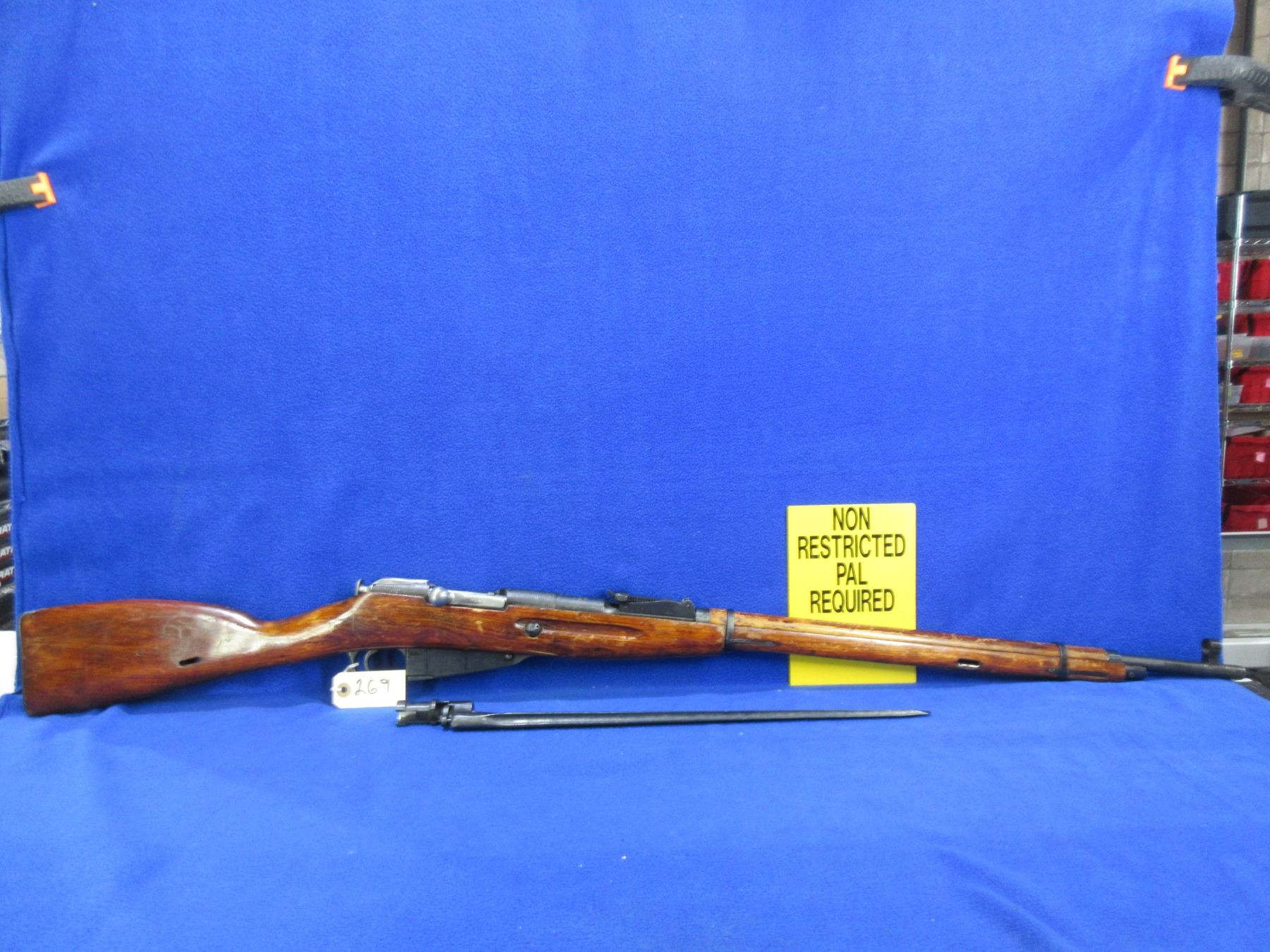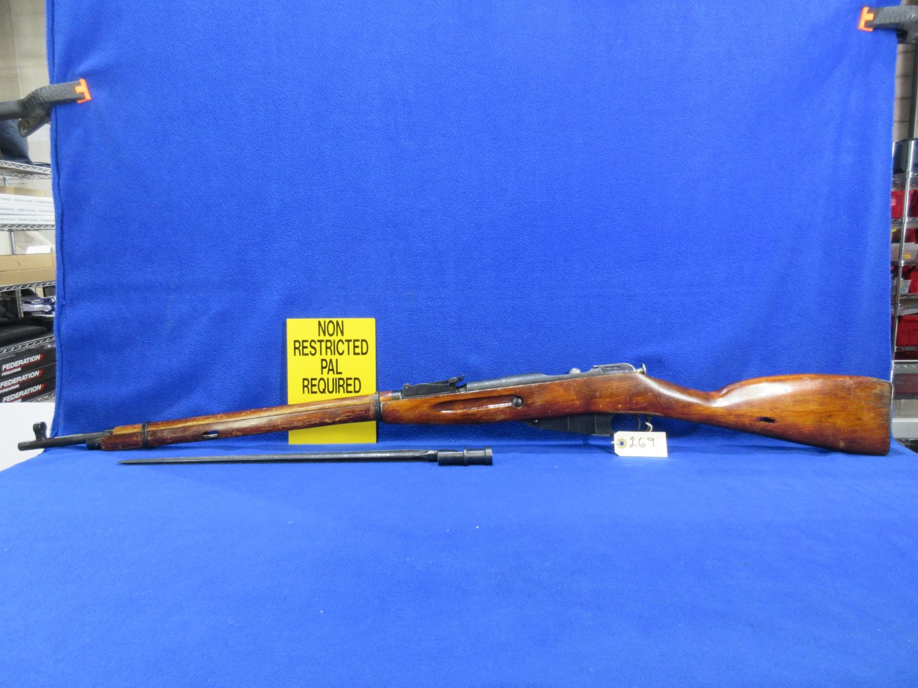 Non-Restricted - Mosin Nagant 1943 in 7.62X51 - This is a bolt action rifle with floor plate magazine, action appears to be in good to very good working order. Barrel is 28 1/2", rifling is good, bluing is good to very good, has both sights, stock is good with usage marks, length of pull is 13 1/2", metal butt plate, comes with bayonet. Appears numbers matching except bayonet. Ser # 2907