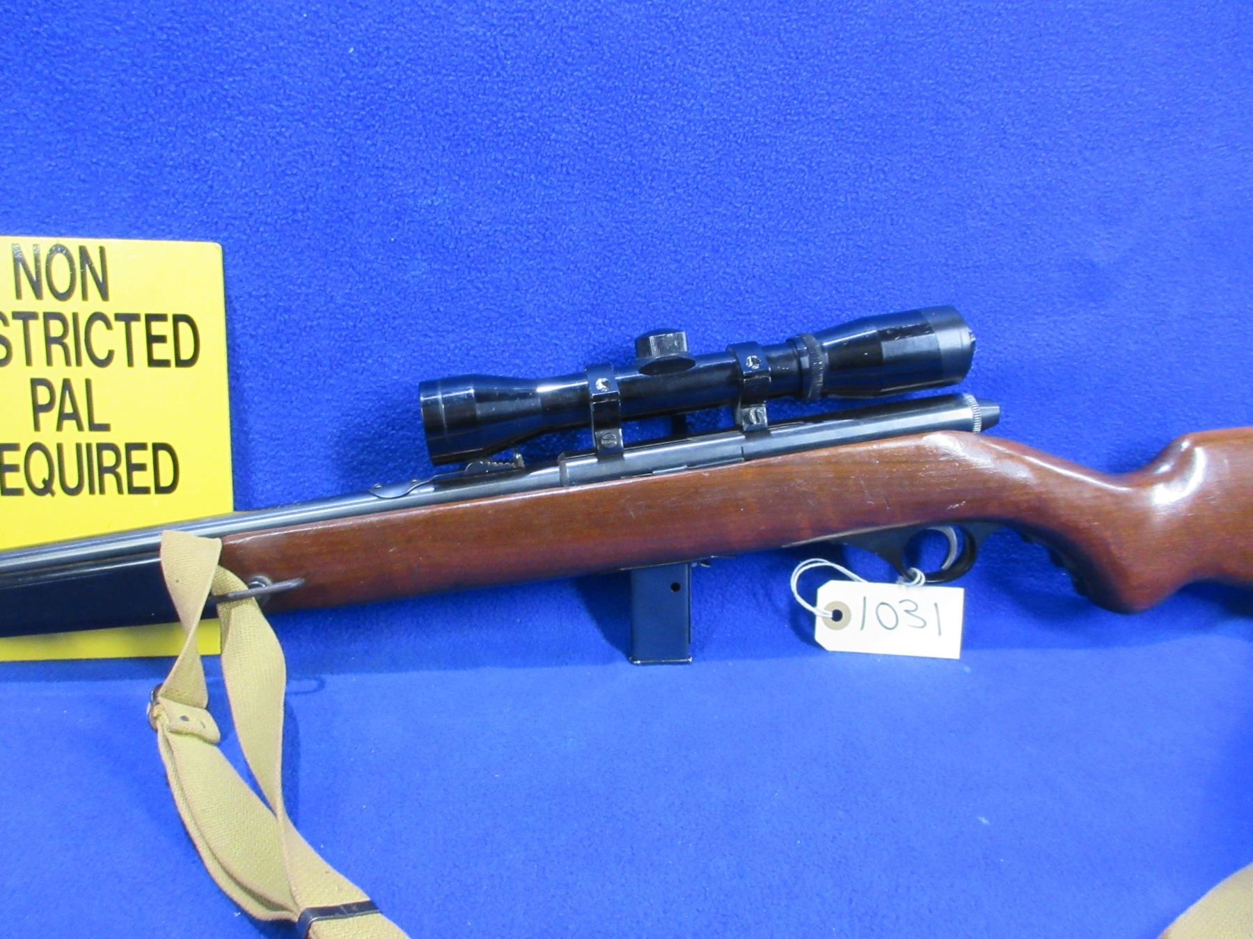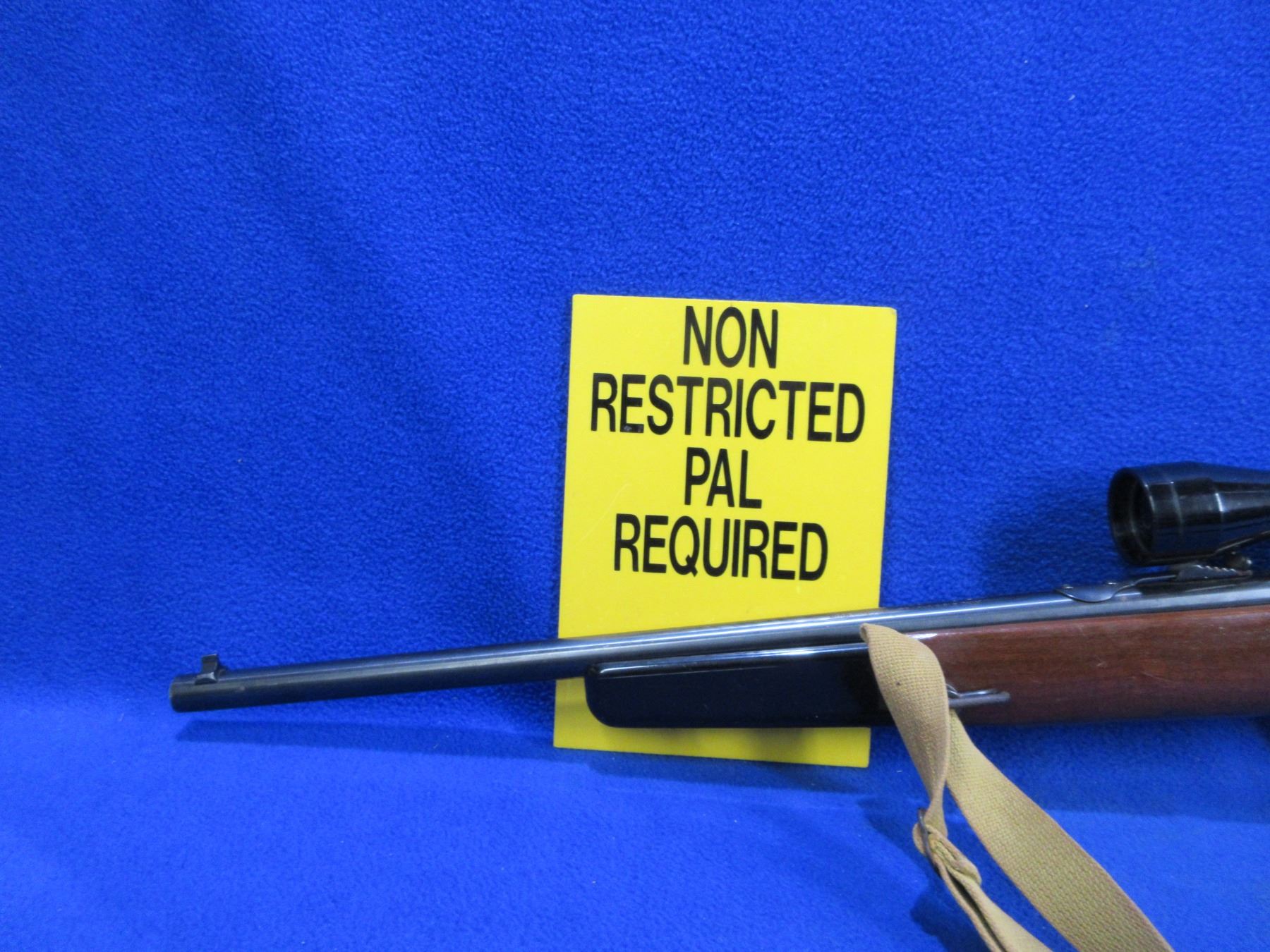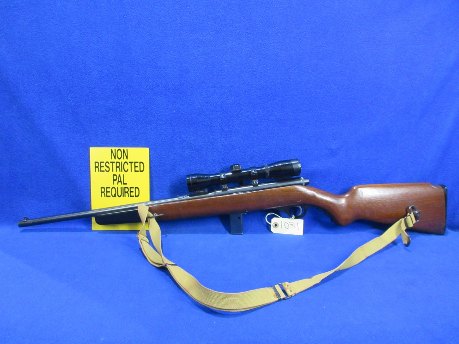 Non-Restricted - Mossberg Model 152K in 22 LR - This is a semi-auto rifle with removable magazine, action appears to be in good to very good working order. Barrel is 18", rifling is good to very good, bluing is good, has both sights and Bell 4x32 compact scope - appears clear - dupplex reticle - eye piece plastic damaged, stock with folding pistol grip forearm is good usage marks, length of pull is 13", butt plate good, comes with swivels and web sling. Ser # None