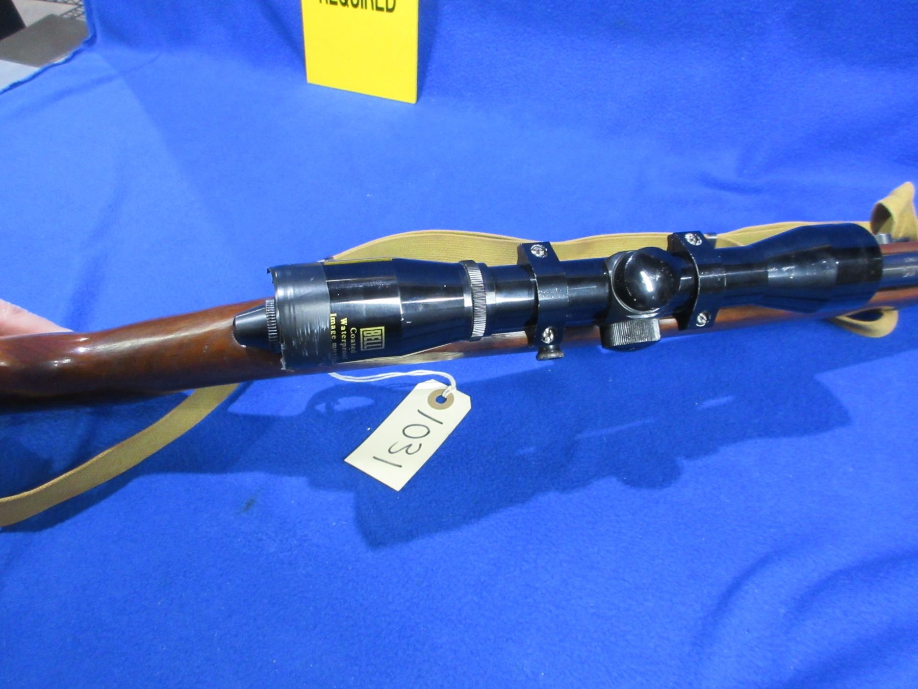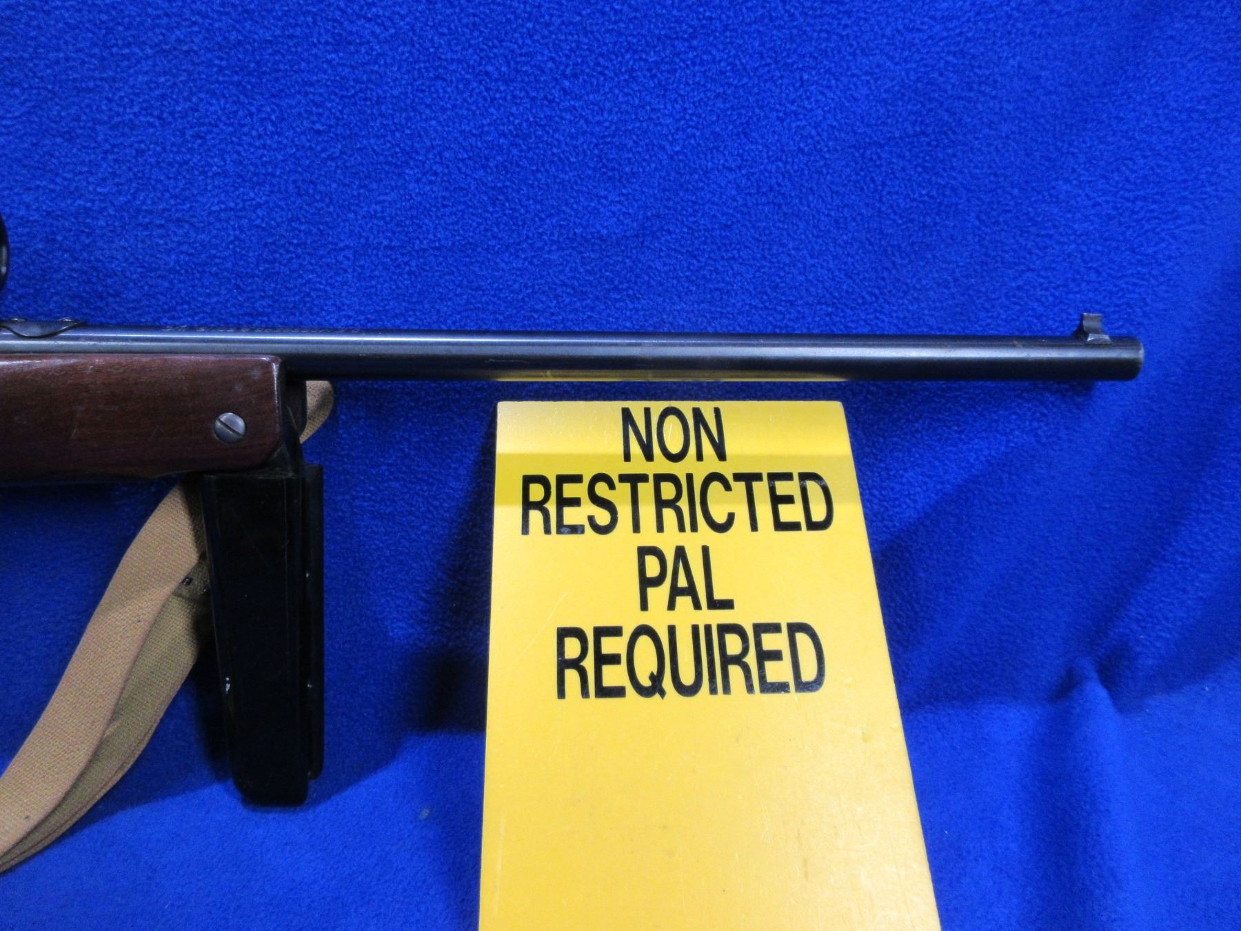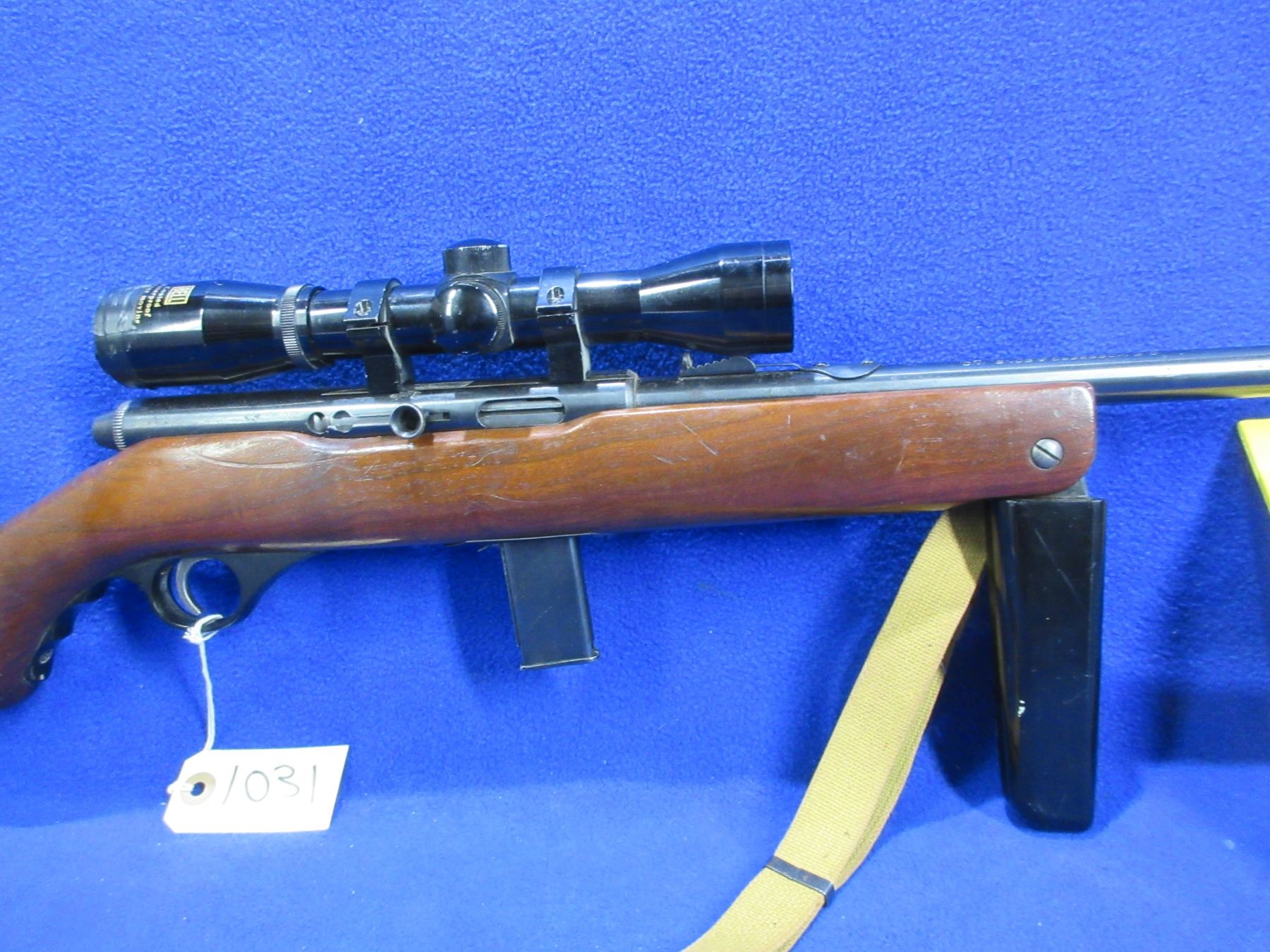 Non-Restricted - Mossberg Model 152K in 22 LR - This is a semi-auto rifle with removable magazine, action appears to be in good to very good working order. Barrel is 18", rifling is good to very good, bluing is good, has both sights and Bell 4x32 compact scope - appears clear - dupplex reticle - eye piece plastic damaged, stock with folding pistol grip forearm is good usage marks, length of pull is 13", butt plate good, comes with swivels and web sling. Ser # None