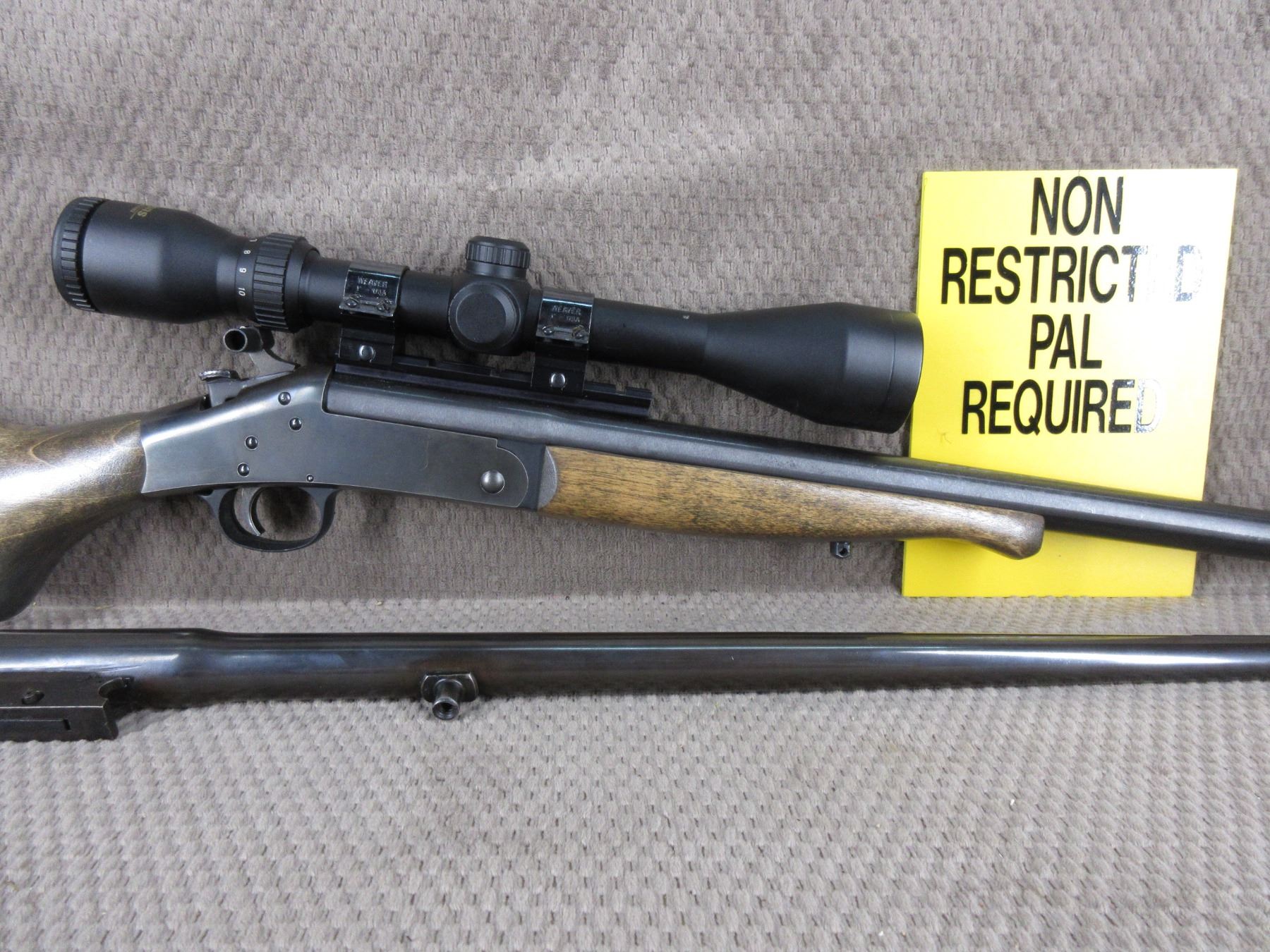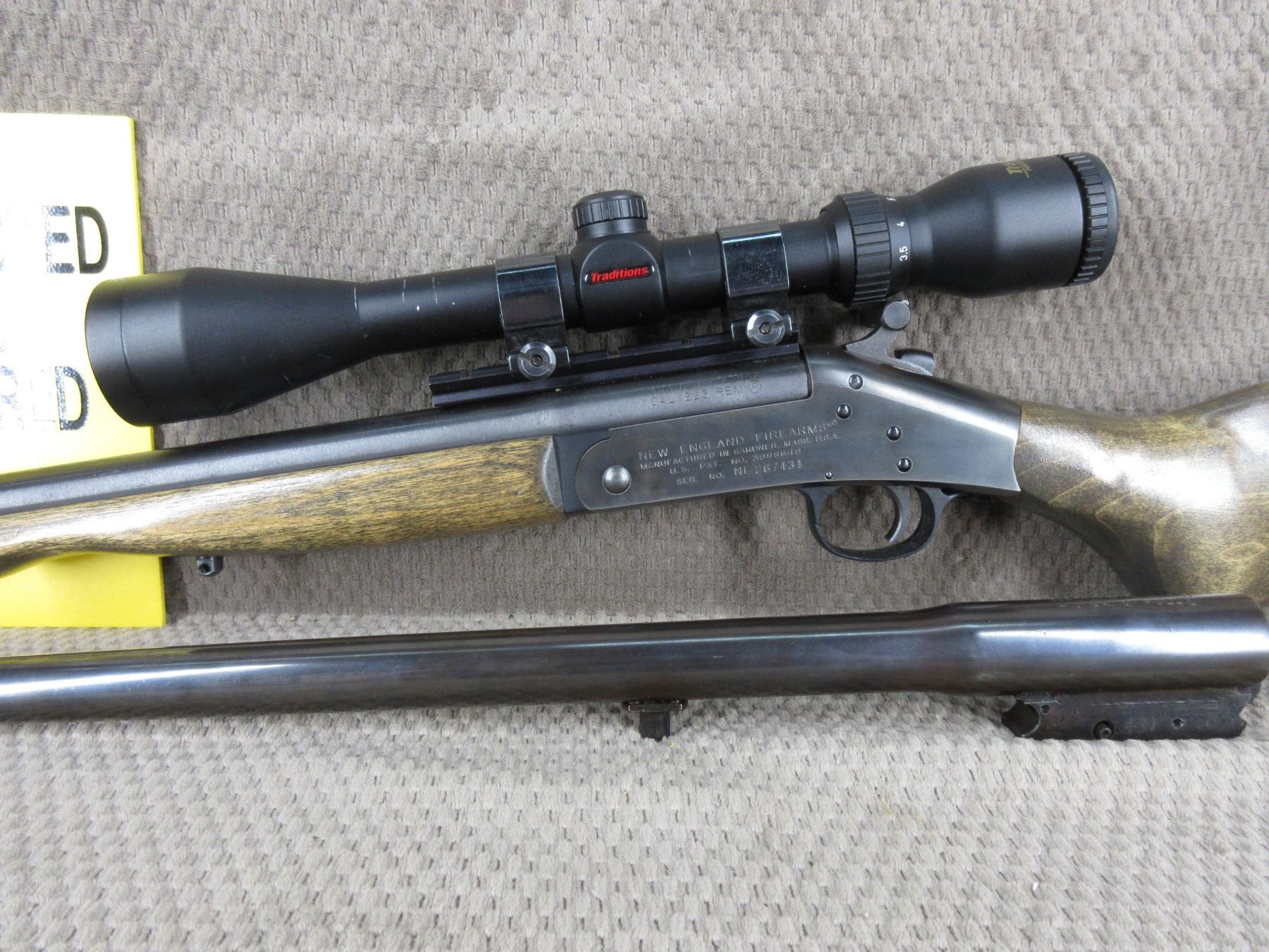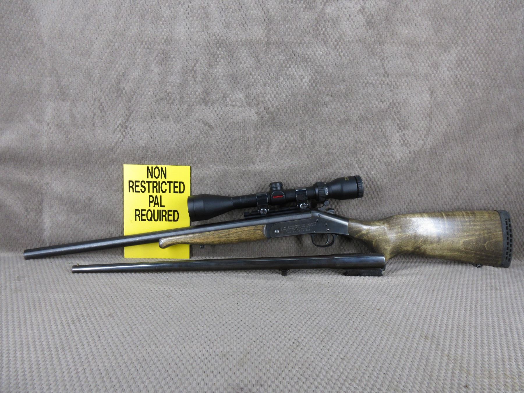 Non-Restricted - New England Firearms SB2 in 223 & 410 - This single shot tip barrel rifle appears to be in very good working order and comes with 2 barrels. Barrels are both 22", rifling in 223 is very good, bore in 410 is shiny, bluing is good to very good on all, has no sights but has Bushnel Traditions 3.5-10X44 appears clear duplex crosshairs , stock is very good, rubber recoil pad, Ser # NL267431