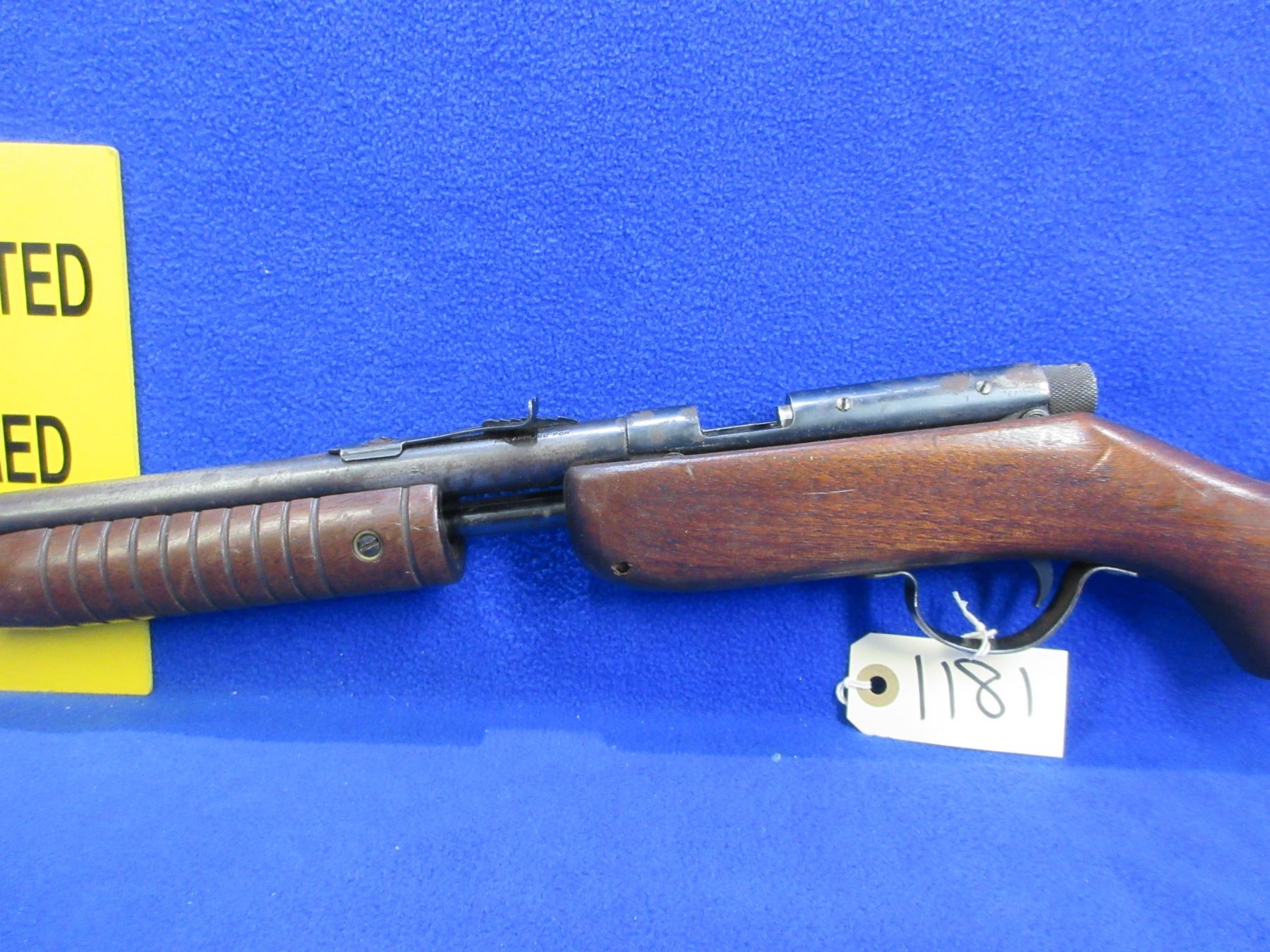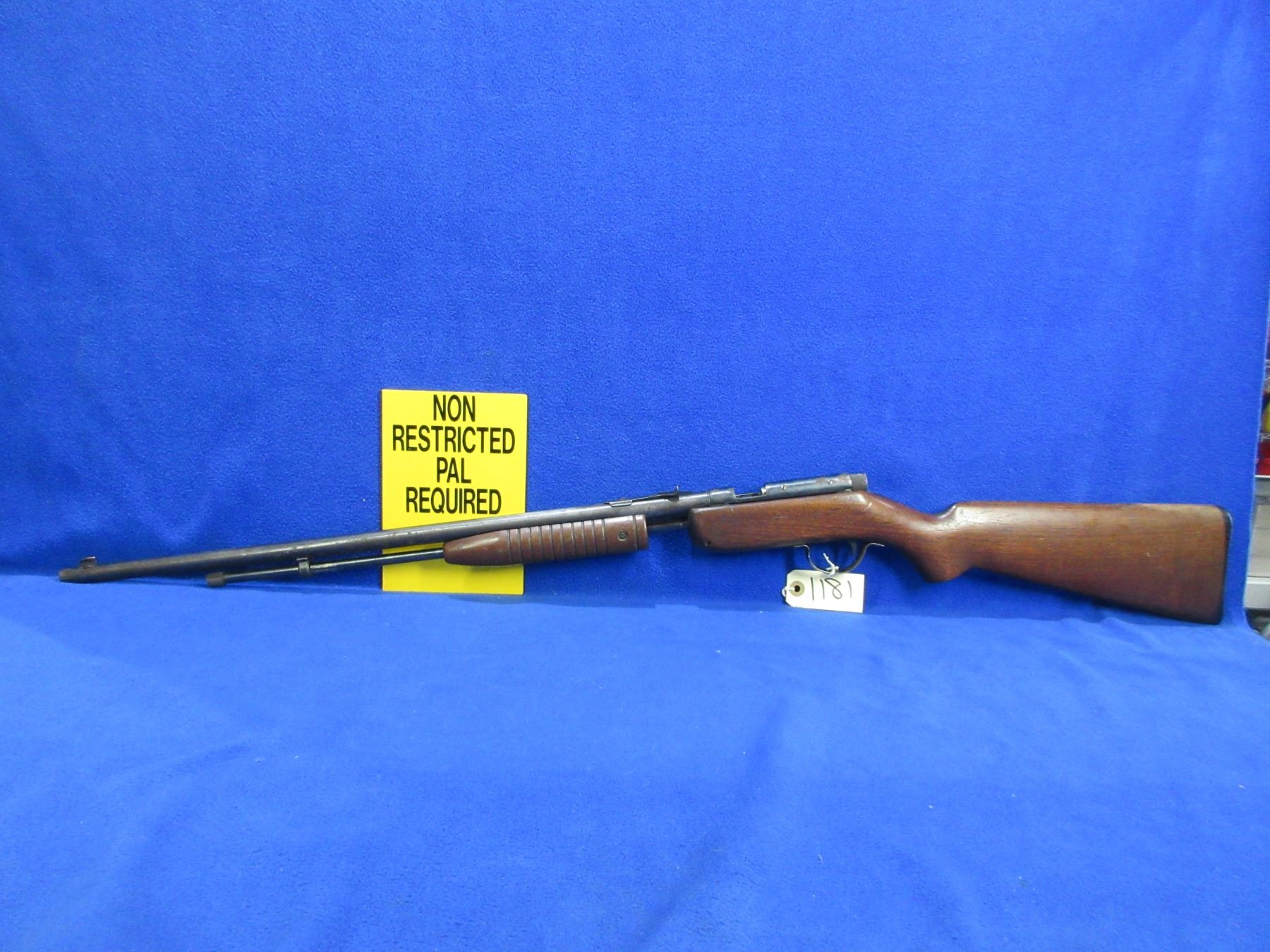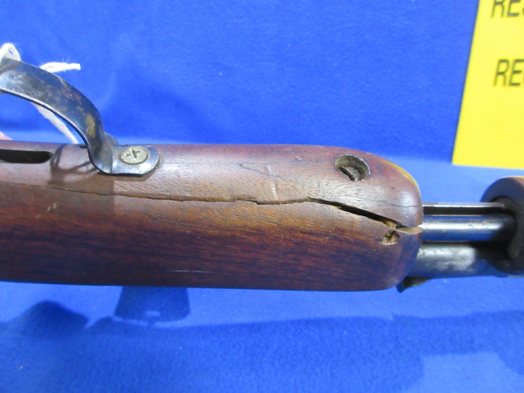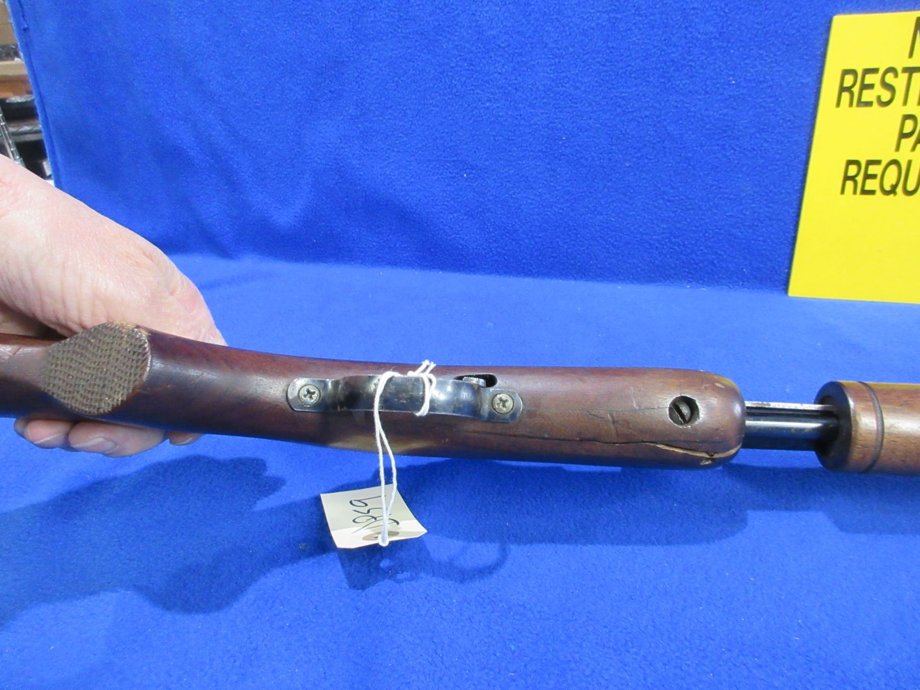 Non-Restricted - Noble Model 33A in 22 S/L/LR - This is a pump action rifle with tube magazine, action appears to be in working order. Barrel is 24", rifling is good to very good, bluing is poor to fair with pitting, has both sights, stock has a large crack on bottom left of action and back of action top right (needs replaced), forearm is good with usage marks, length of pull is 13 1/2", butt plate good. Ser # None