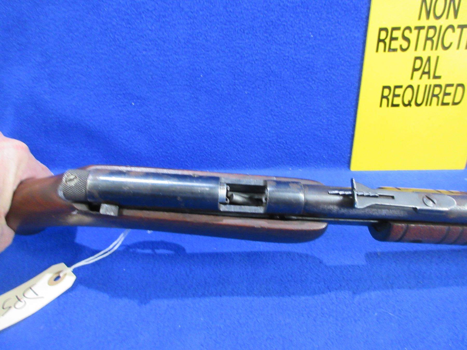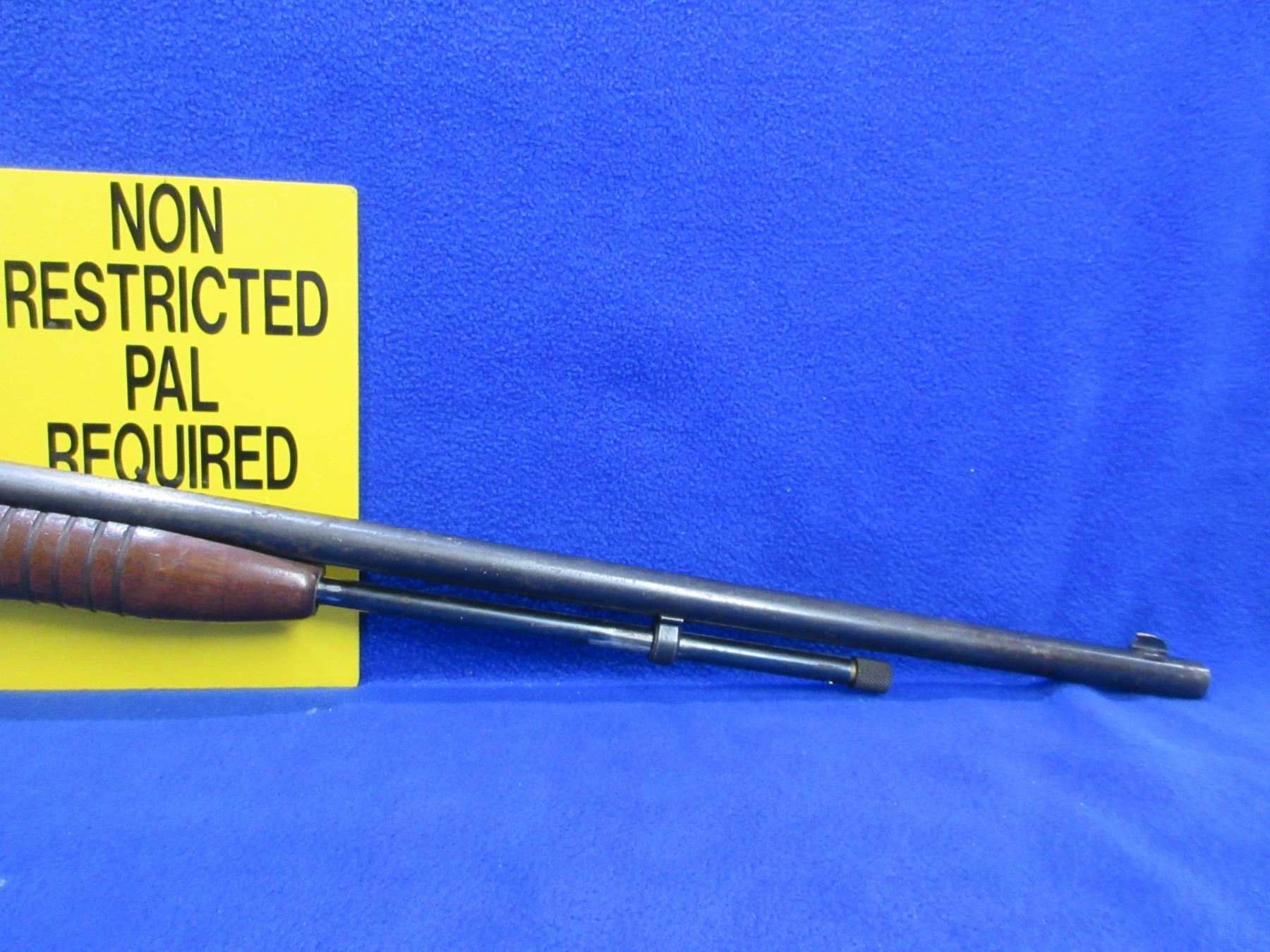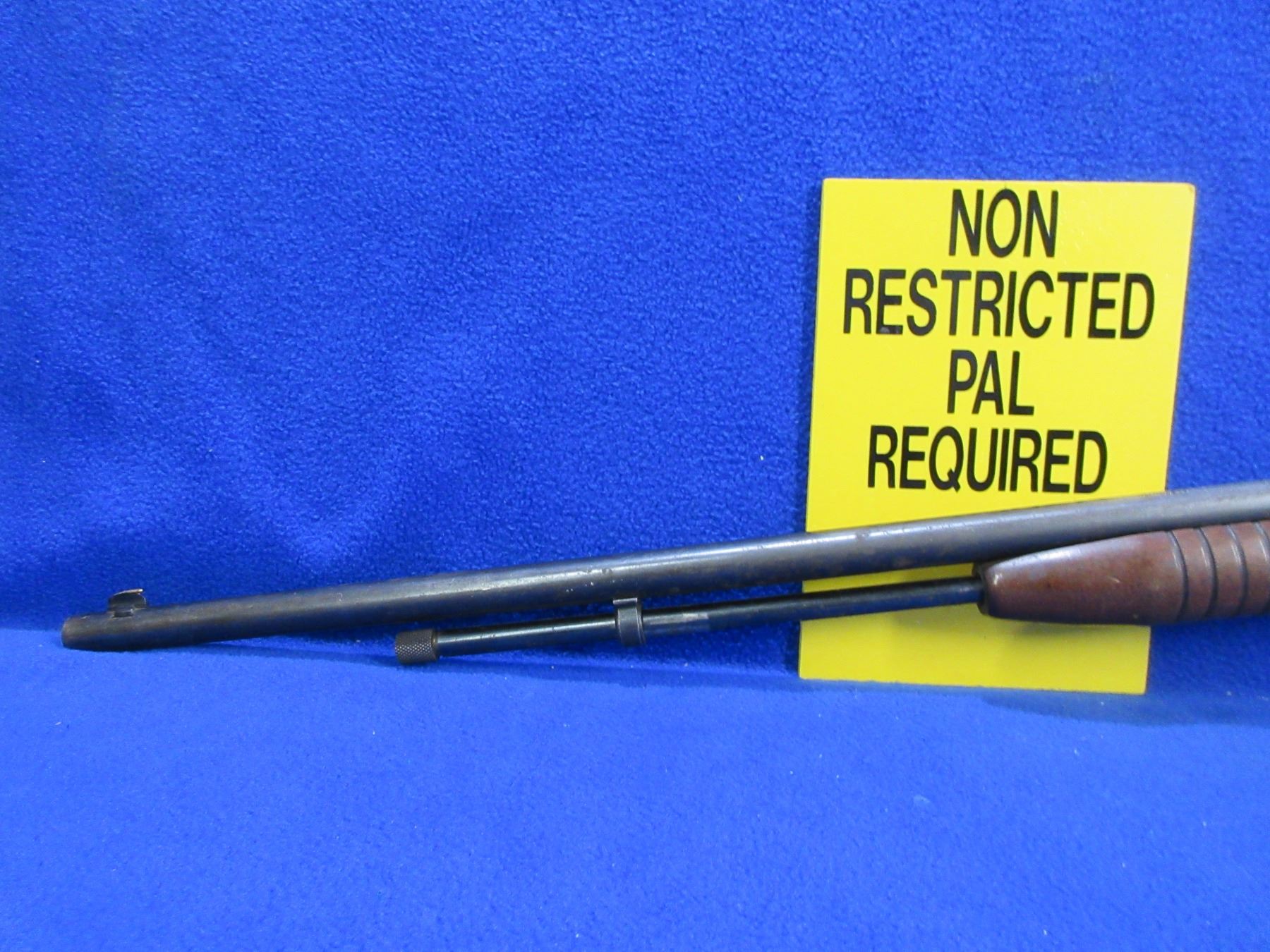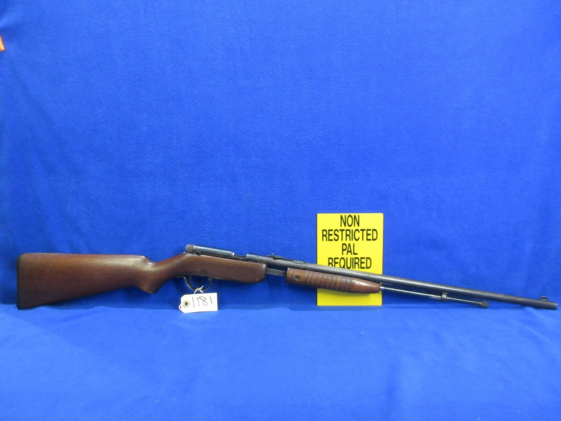 Non-Restricted - Noble Model 33A in 22 S/L/LR - This is a pump action rifle with tube magazine, action appears to be in working order. Barrel is 24", rifling is good to very good, bluing is poor to fair with pitting, has both sights, stock has a large crack on bottom left of action and back of action top right (needs replaced), forearm is good with usage marks, length of pull is 13 1/2", butt plate good. Ser # None