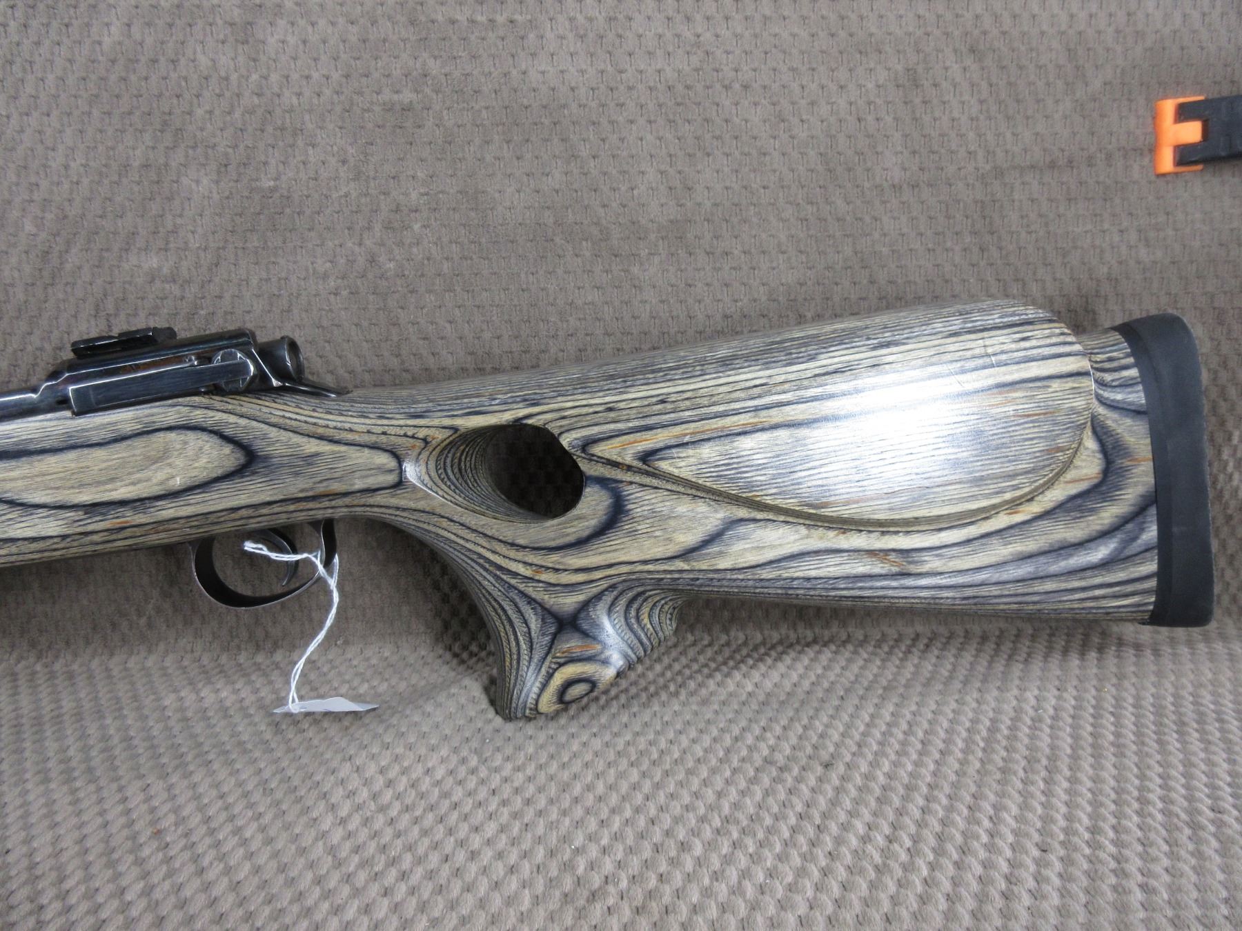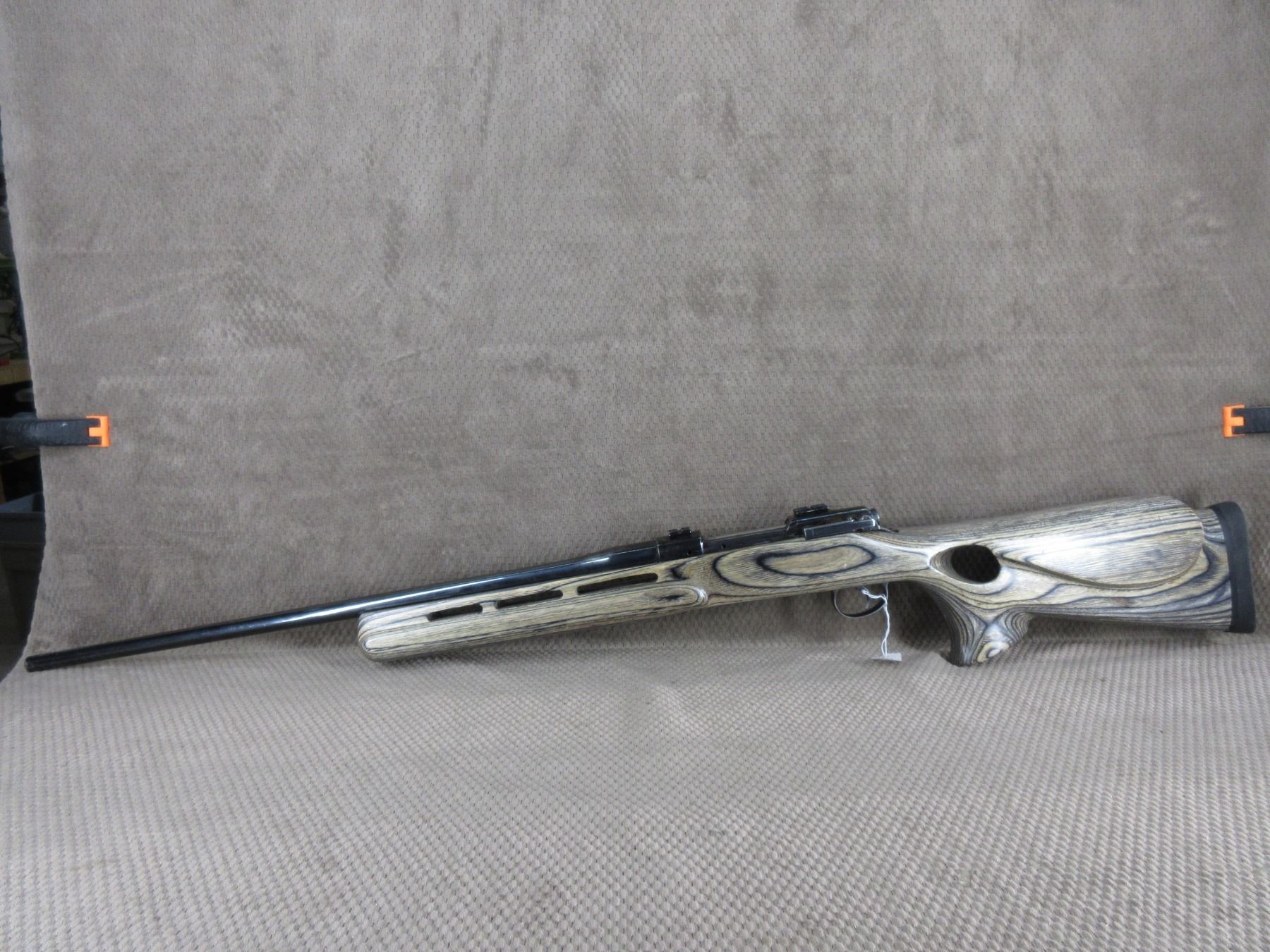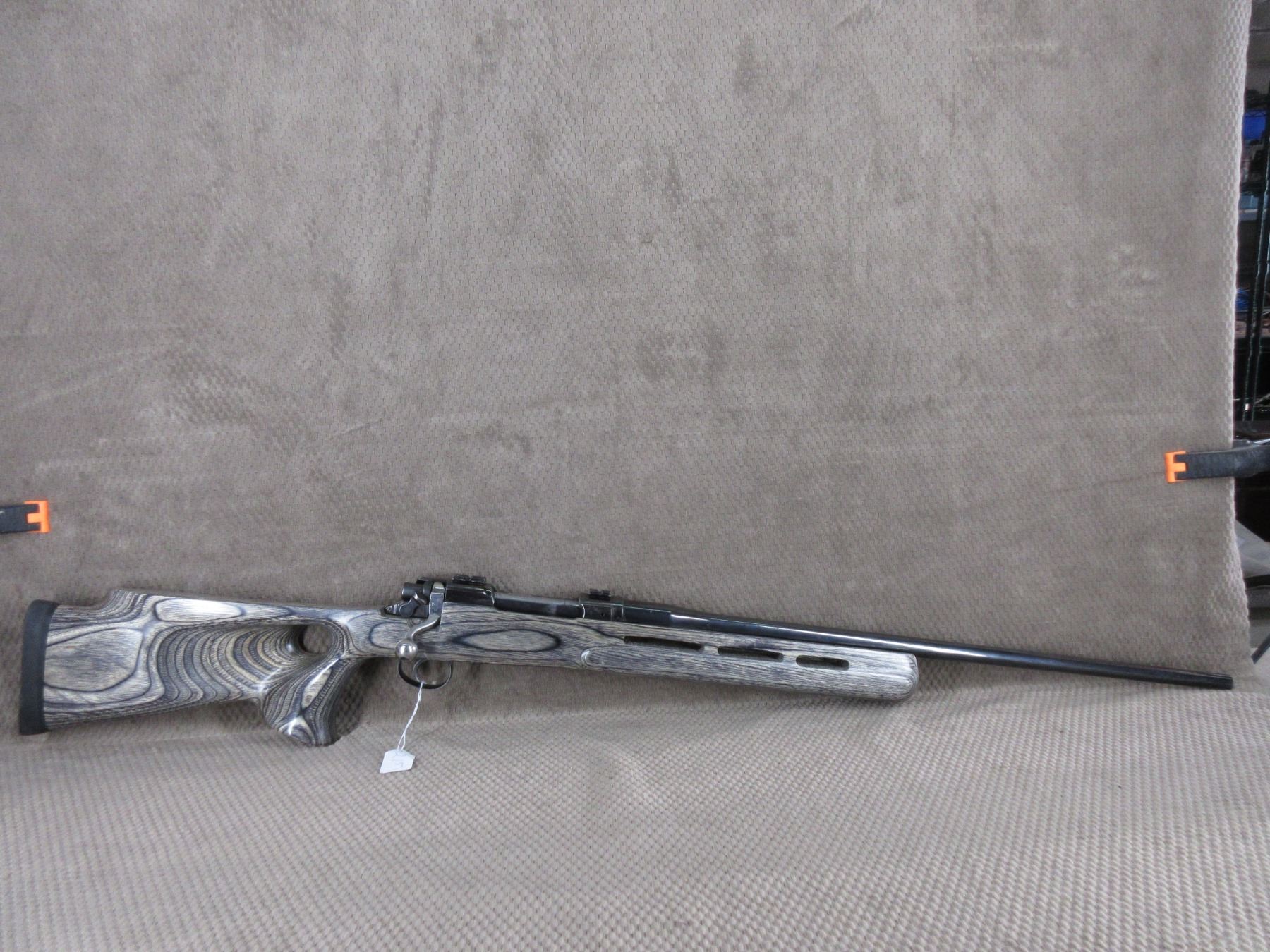 Non-Restricted - P17??? Action Rebarreled to 338 Win??? - This bolt action rifle with floor plate magazine appears to be in very good working order. Barrel is 24", bluing is good to very good, rifling is very good, has no sights, has scope bases, thumbhole grey lamintated stock is very good, rubber recoil pad. Barrel has no caliber markings I think it is a 338 Win Mag but can't be totally sure, only marks on action are under front base and it is RE in an oval.
