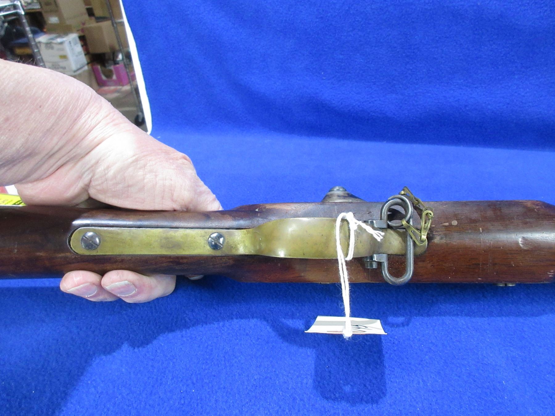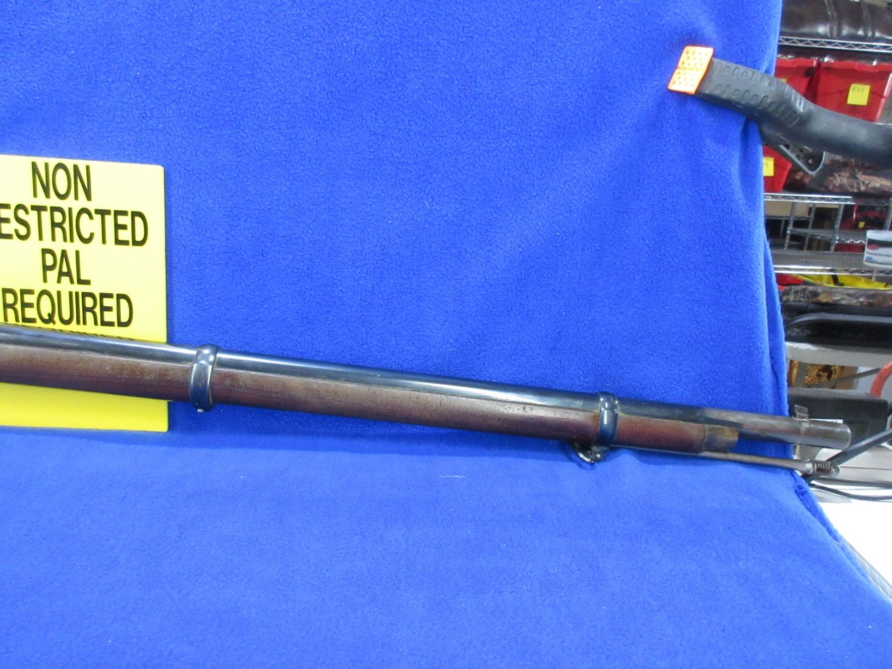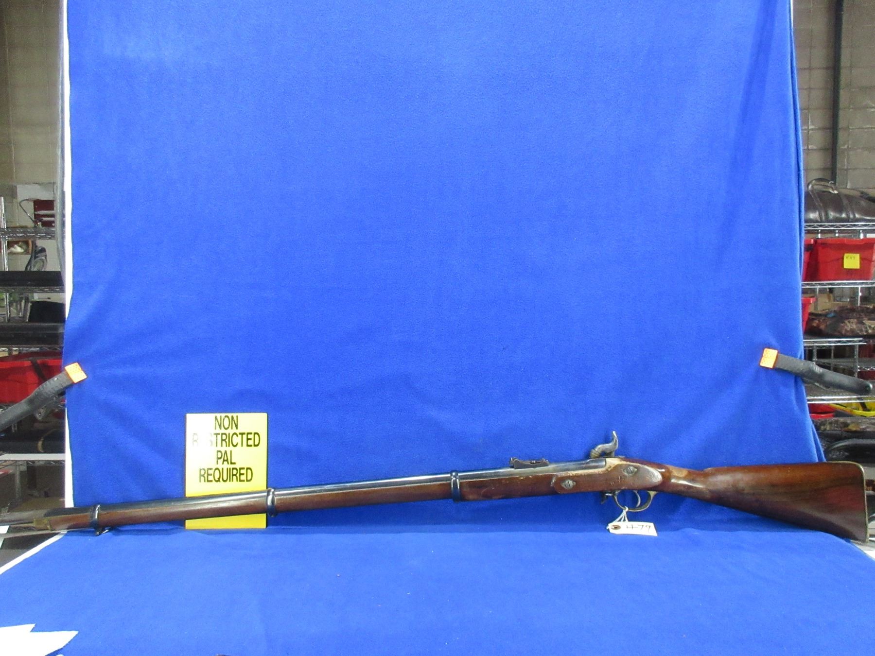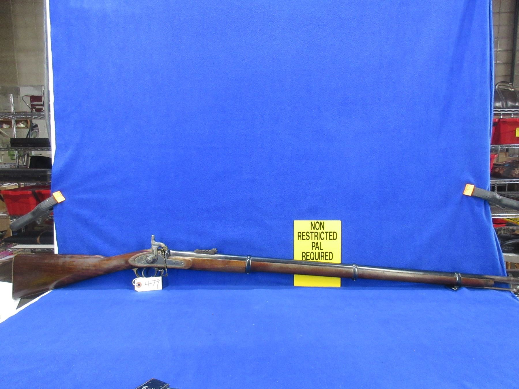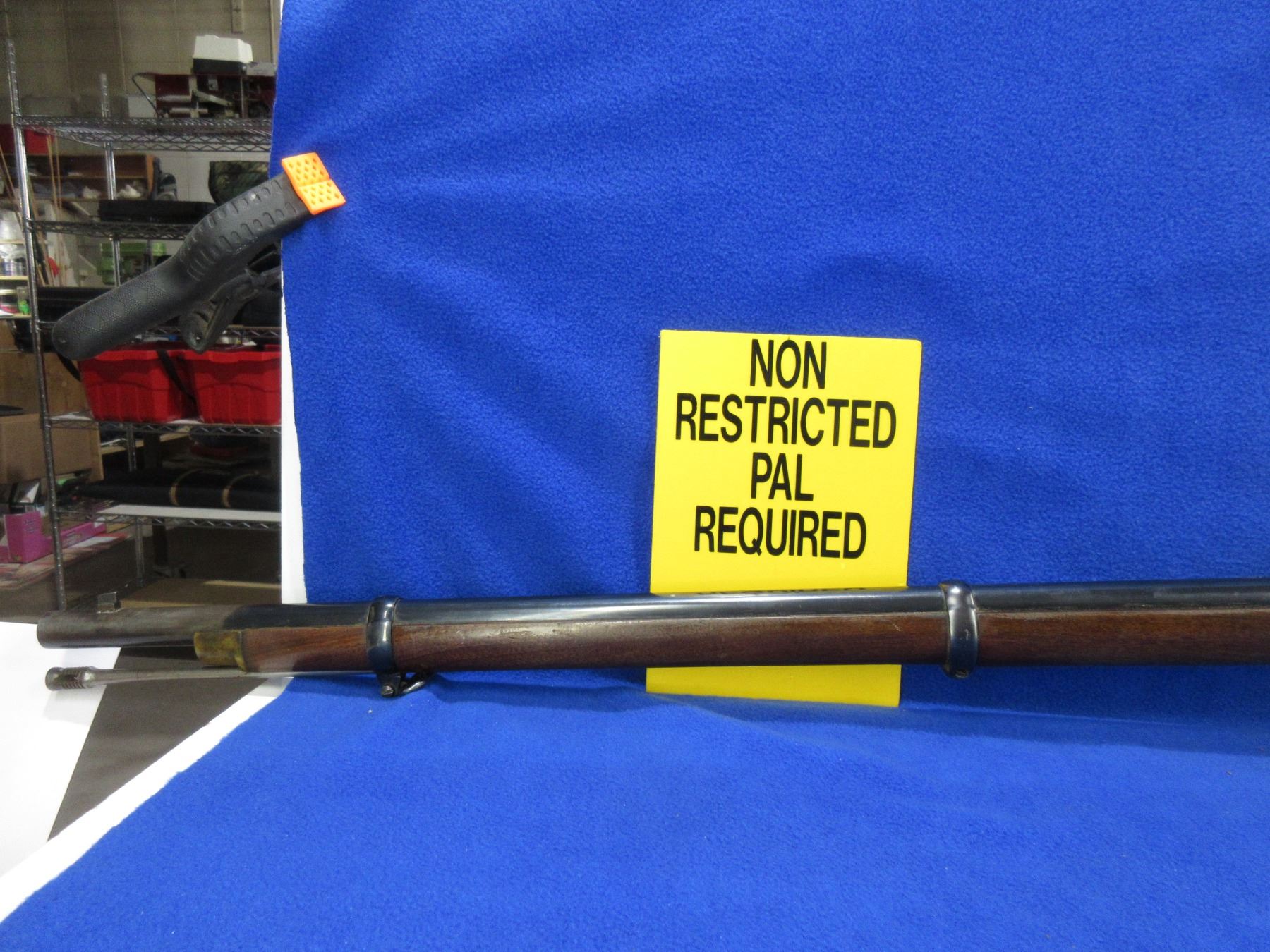 Non-Restricted - Parker Hale Reproduction 1858 Enfield in 577 3 Band Rifle - This muzzleloading percussion cap rifle appears to be in good to very good working order. Barrel is 38.5", rifling is good to very good, bluing is fair to good, has both sights, stock and forearm are good but have heavy wear marks, brass butt plate good. Ser # 5663