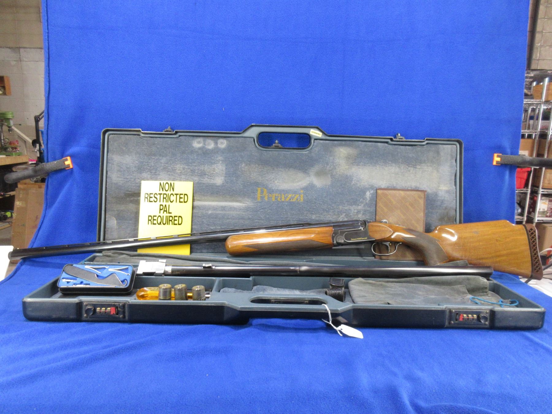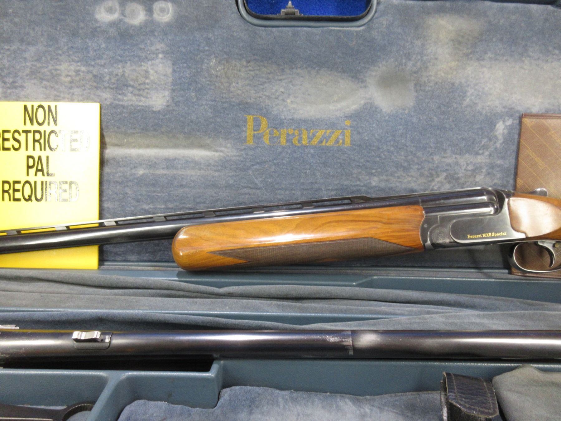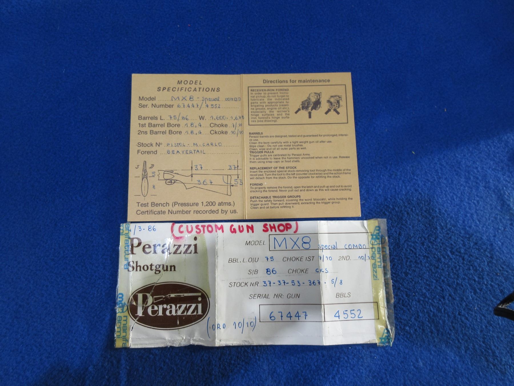 Non-Restricted - Perazzi Model MX8 Special in 12 ga 2 3/4" - This tip barrel shotgun with a single barrel and over/under double barrel appears to be in good to very good working order. Vent rib double barrel is 29 9/16" & bores are shiny, Ser. No. 67447. Vent rib single barrel is 33 7/8" & bore is shiny, Ser. No. 67447-4552. Bluing on barrels is good to very good, bluing on bottom of action, front edge of weight on single barrel & trigger guard has worn off, has bead front sights, stock is good to very good with 2 wear marks on cheek rest area, forearm is good to very good, rubber recoil pad good. Comes with original Perazzi case (1 latch is missing a rivet), information, tools, parts & 3 extra removable chokes, Ser # 67447