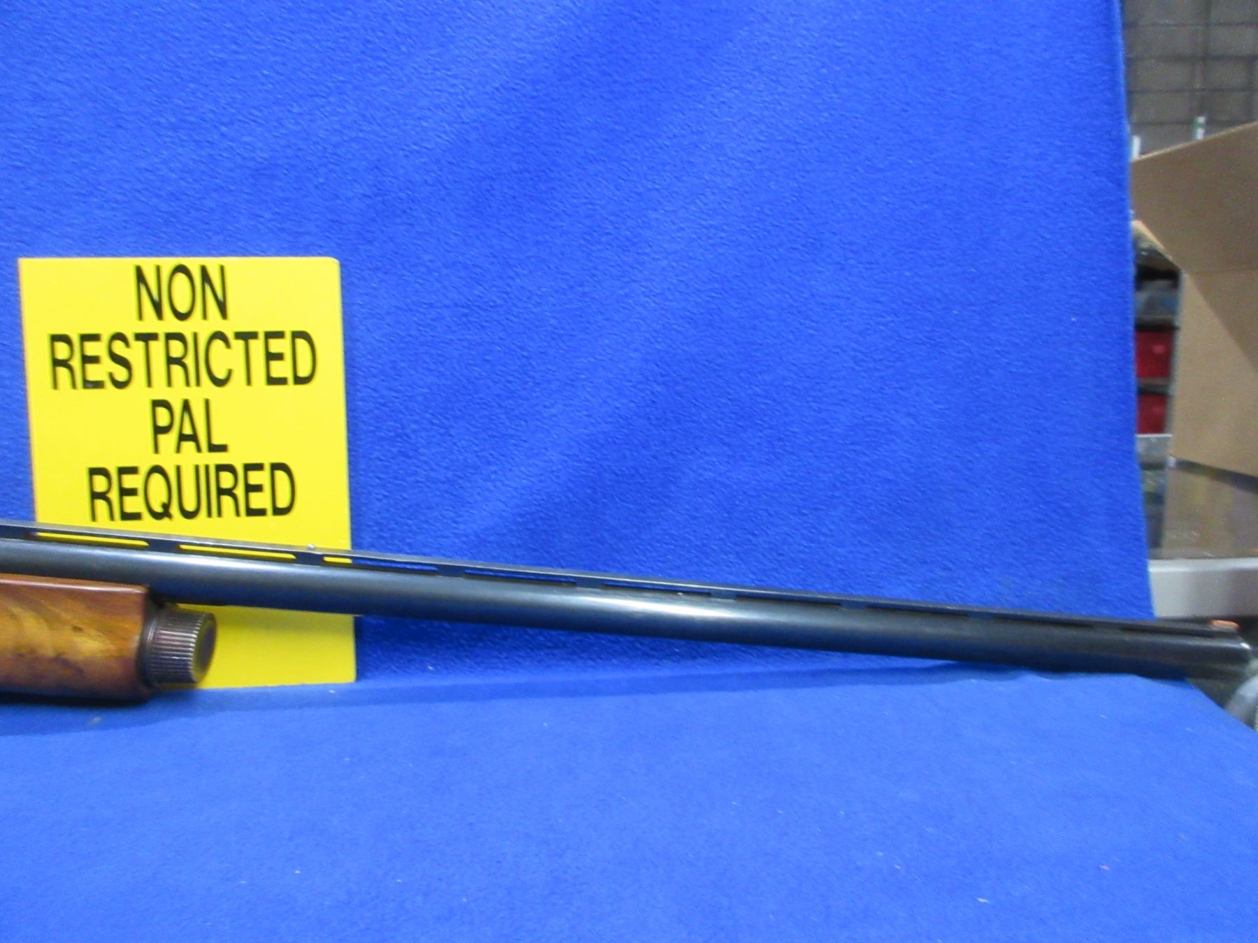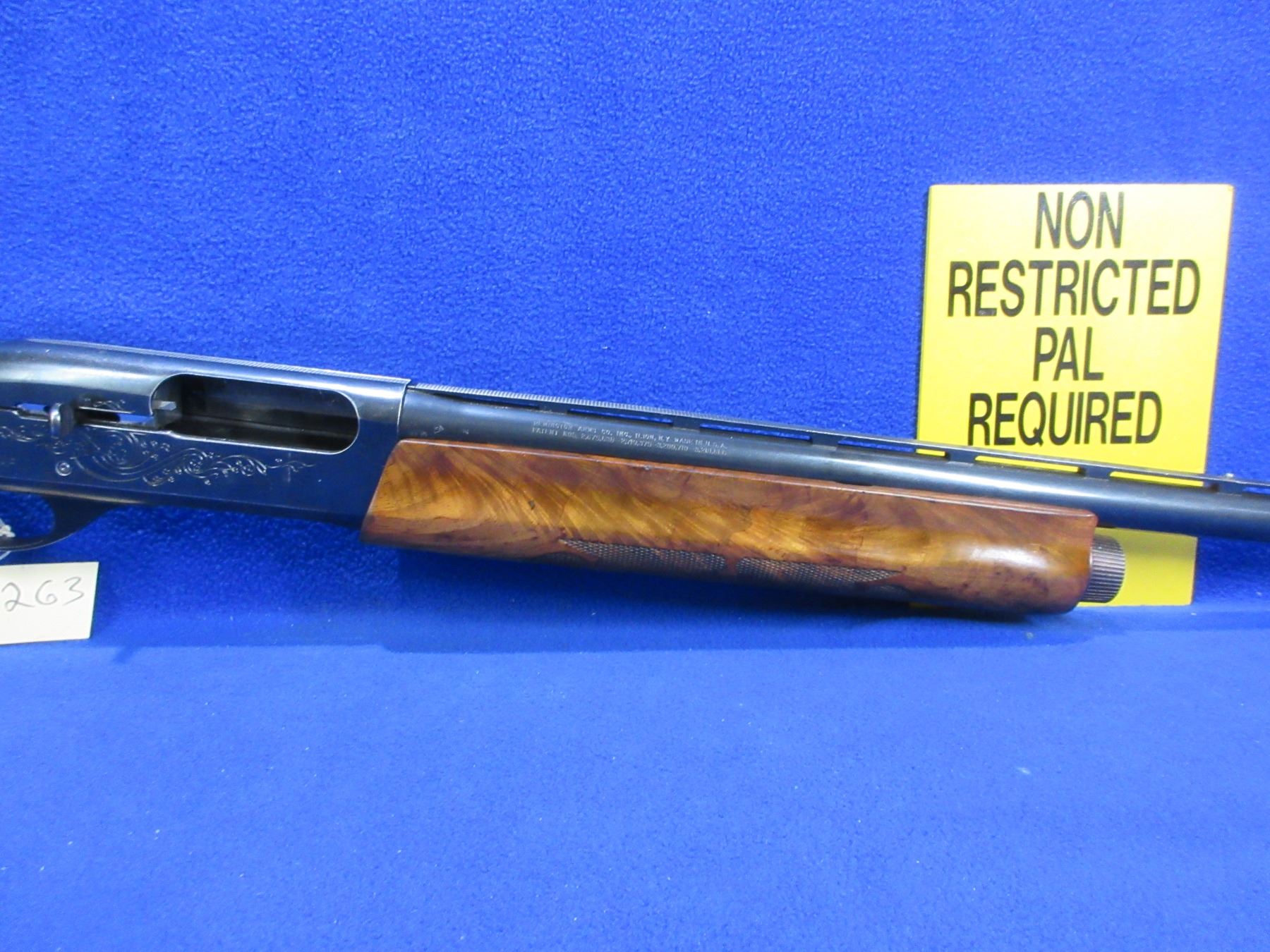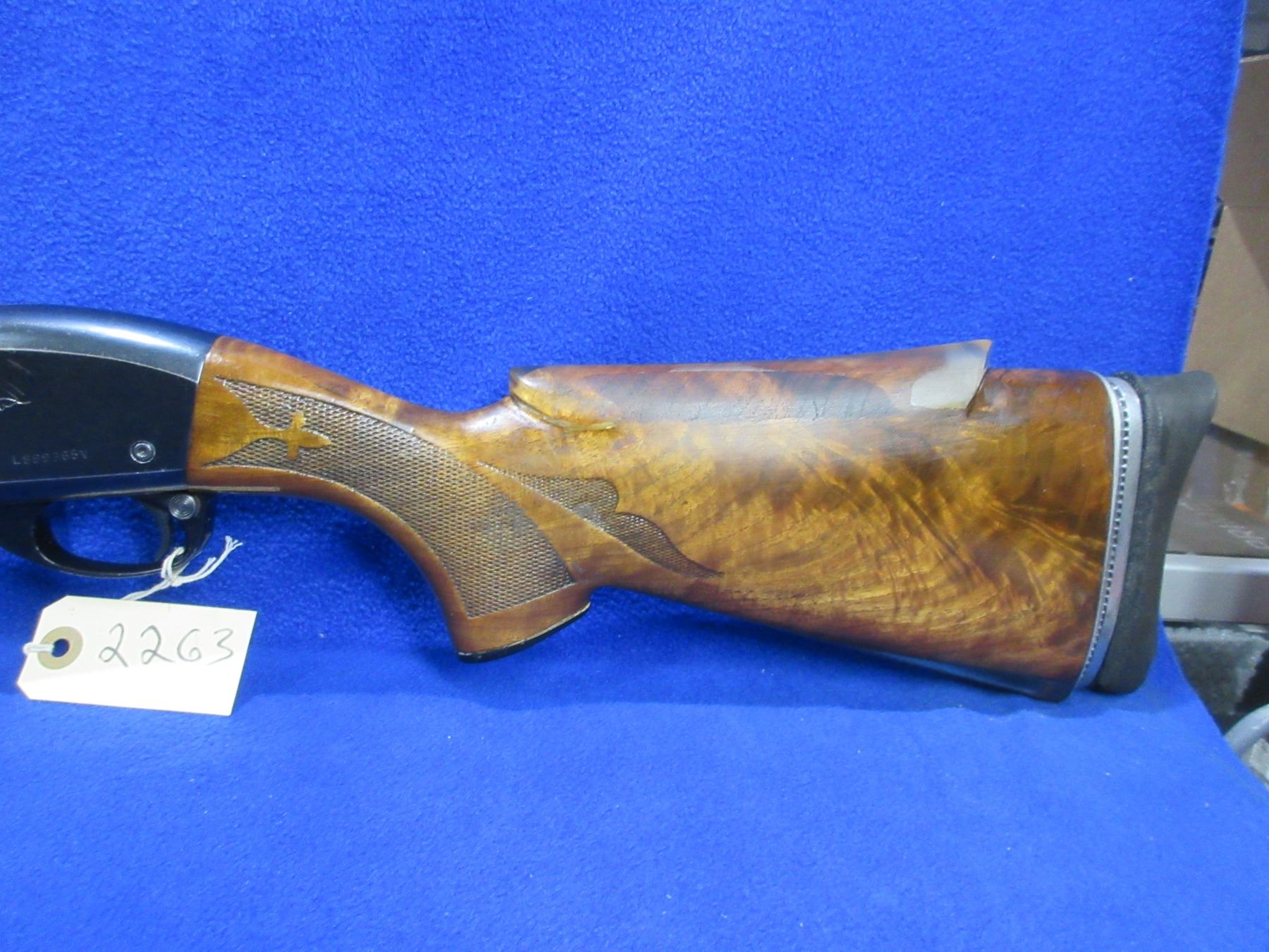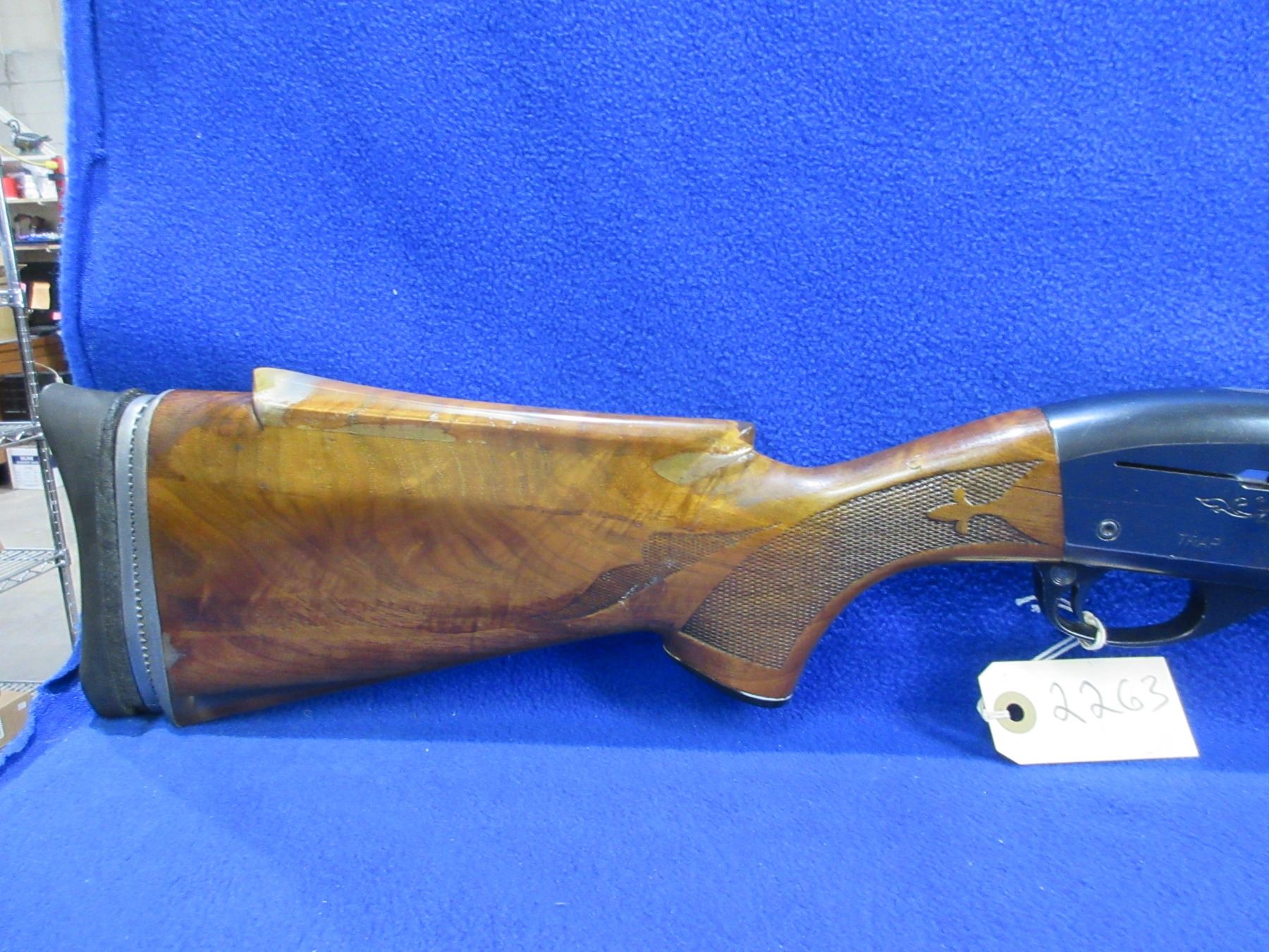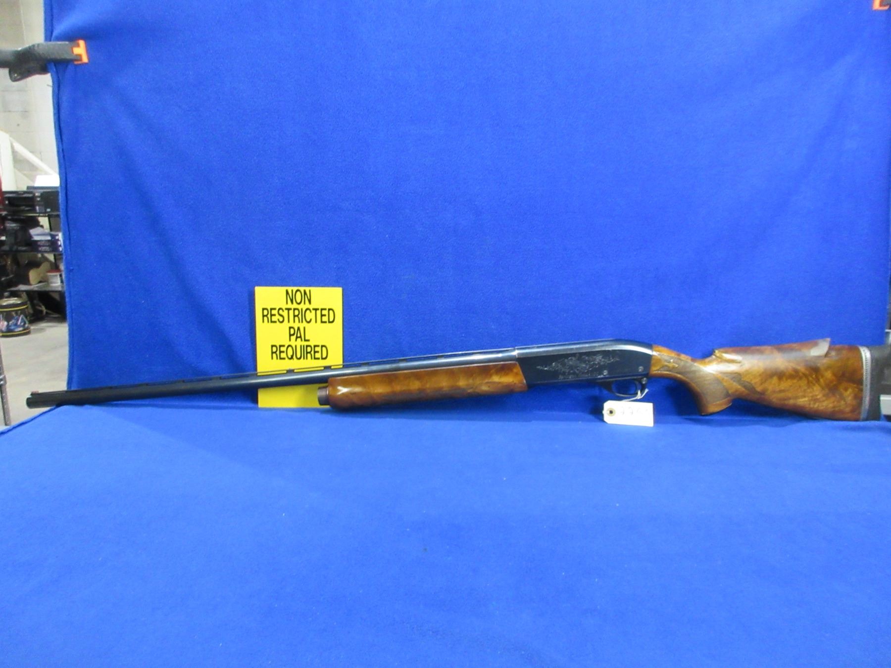 Non-Restricted - Remington Model 1100 Trap in 12 Ga. 2 3/4" Full - This is a semi-auto shotgun, action appears to be in good to very good working order. Vent rib barrel is 30", bore is good to very good, bluing is good to very good, has fiber optic front sight and mid bead sight, stock is good to very good with a beautiful grain but has an epoxy molded comb and toe area added and has a scratch on right side by action, forearm also has a beautiful grain and is good to very good, length of pull is 13 3/4", adjustable Trap style butt plate rubber is starting to come loose. Ser # L899365V