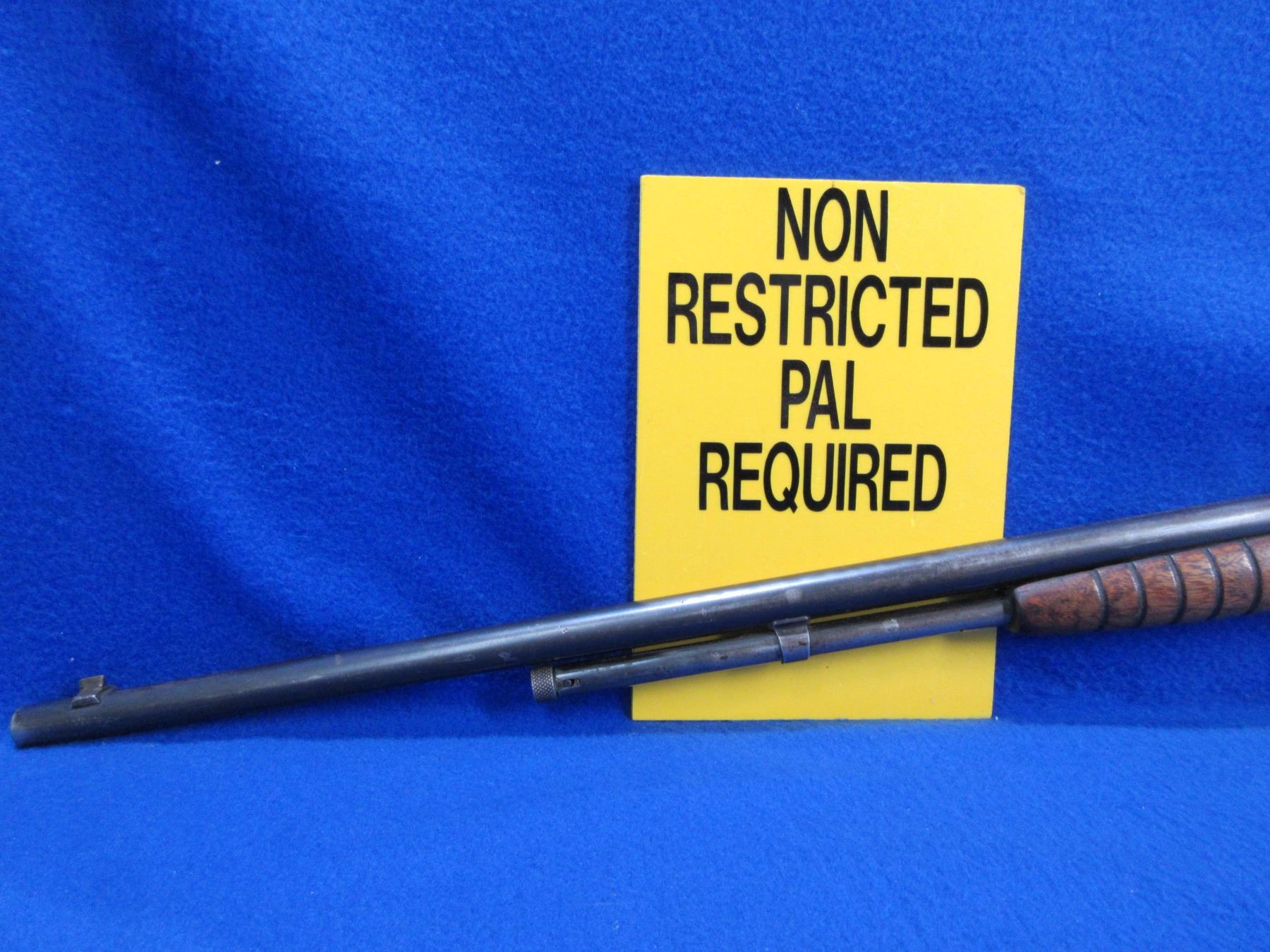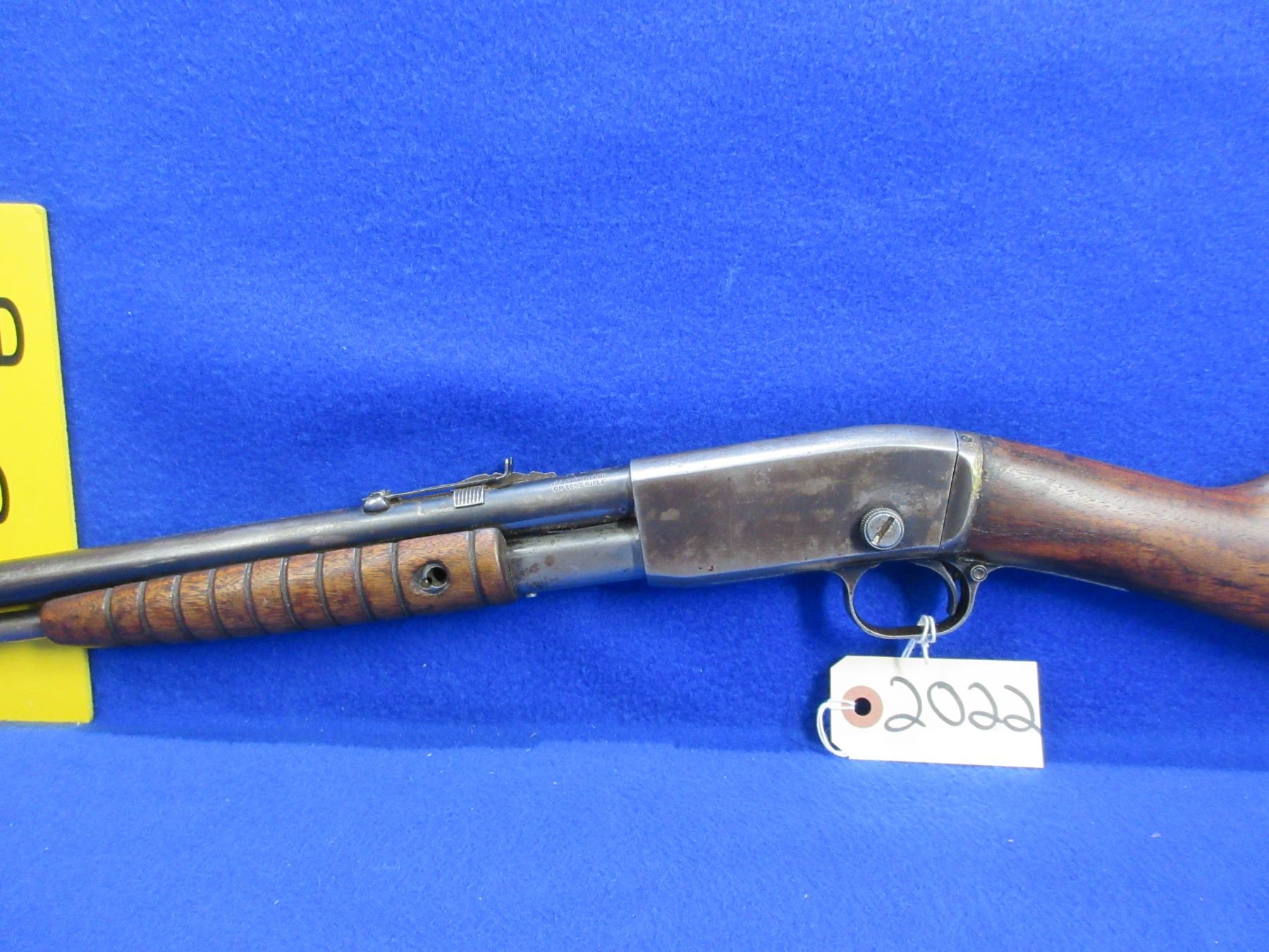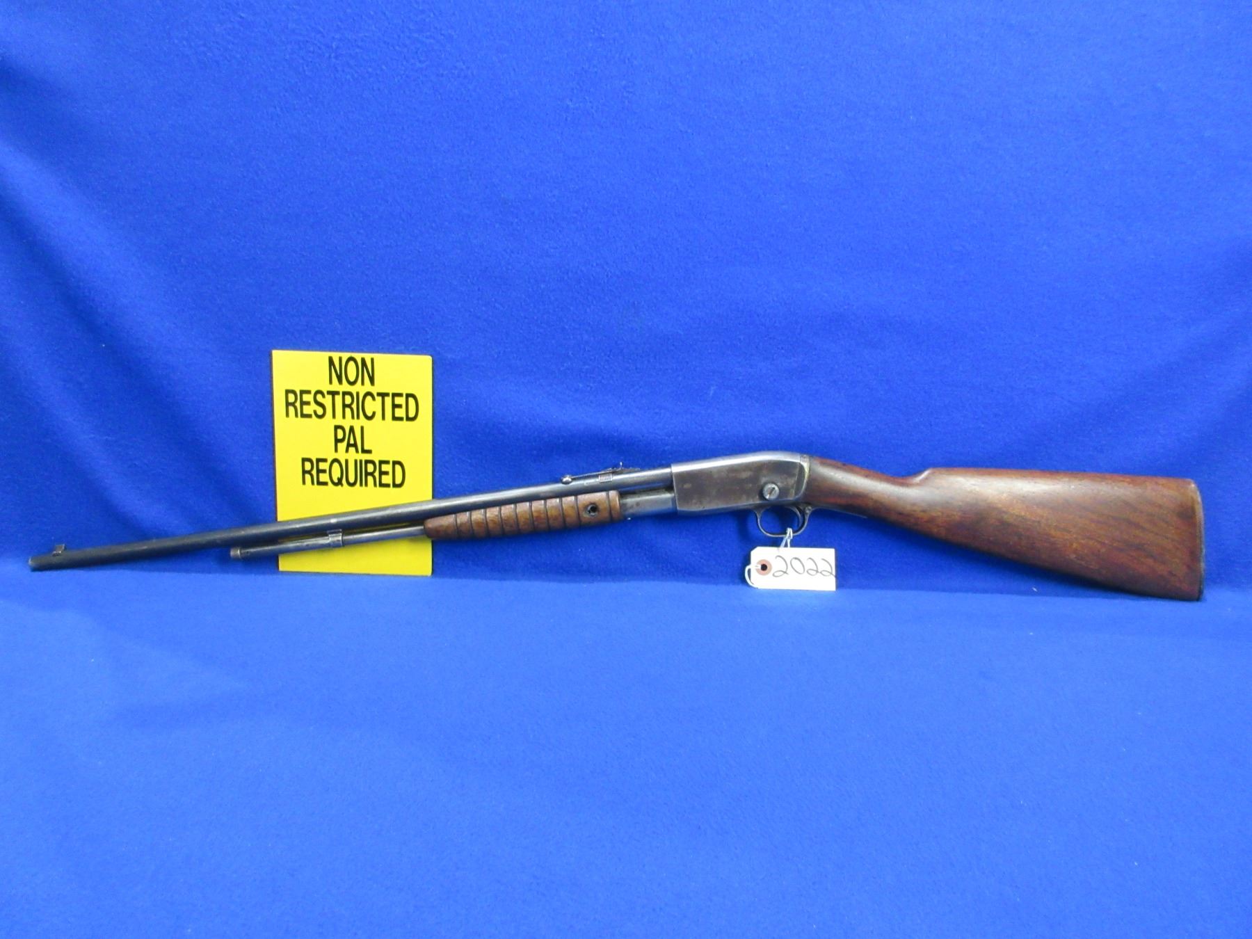 Non-Restricted - Remington Model 12-A in 22 S/L/LR - This pump action take down rifle with tube magazine appears to be in good to very good working order. Barrel is 22", rifling is good, bluing is fair to good, has both sights, stock has hairline cracks behind the bottom tang, forearm is good but missing screw on left side, leather butt plate coming off. Ser # 585912