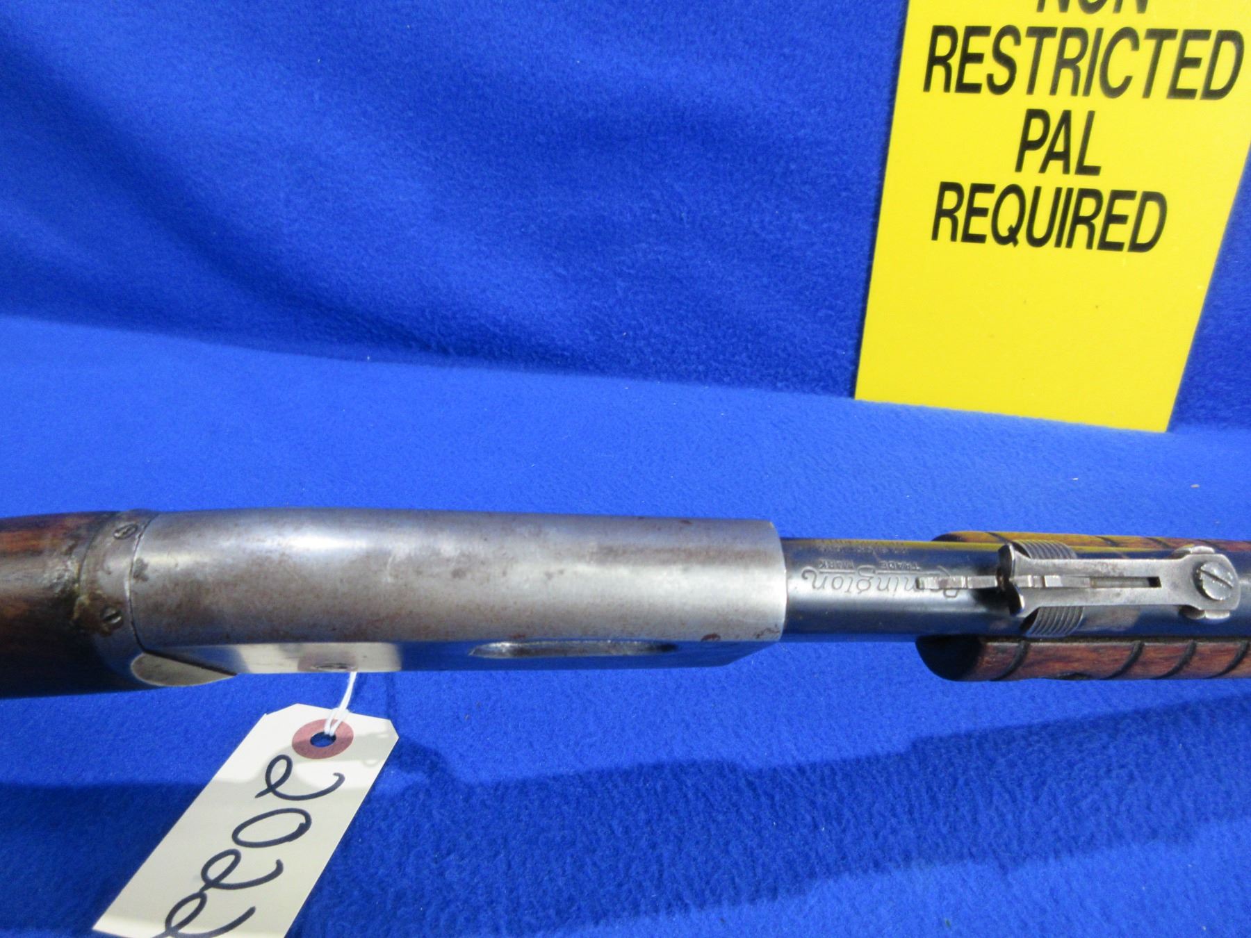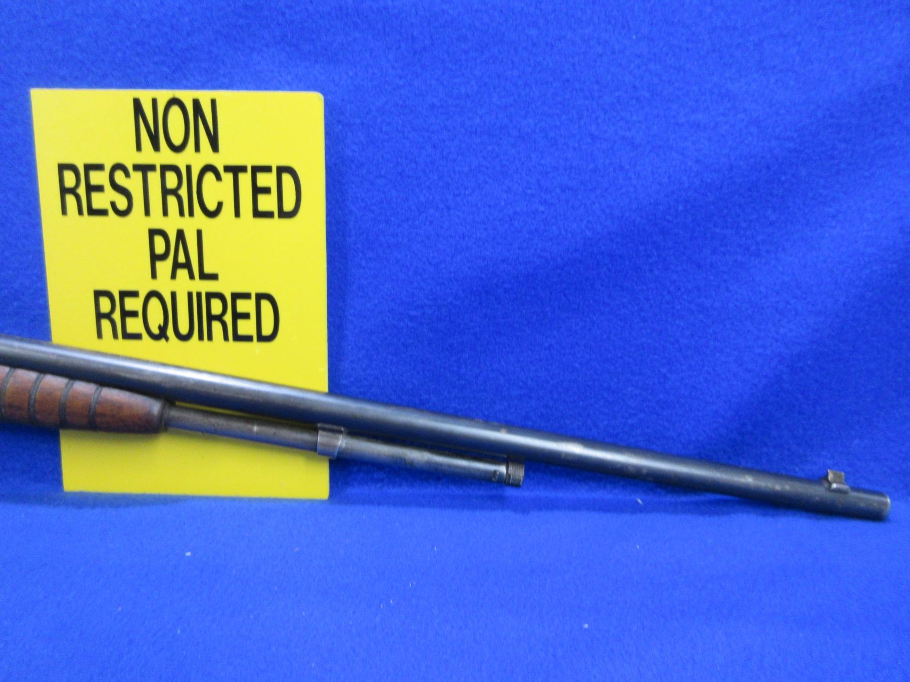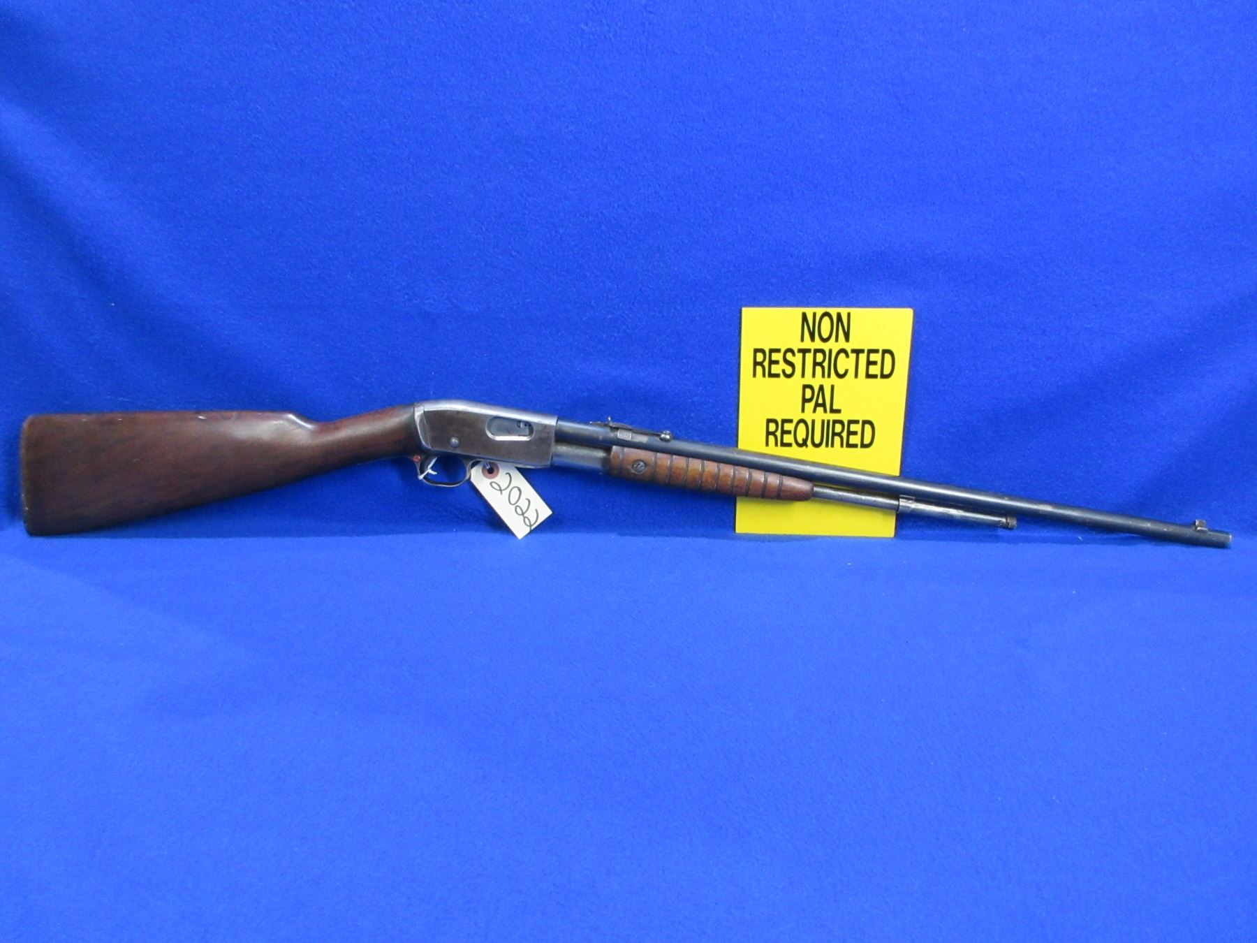 Non-Restricted - Remington Model 12-A in 22 S/L/LR - This pump action take down rifle with tube magazine appears to be in good to very good working order. Barrel is 22", rifling is good, bluing is fair to good, has both sights, stock has hairline cracks behind the bottom tang, forearm is good but missing screw on left side, leather butt plate coming off. Ser # 585912