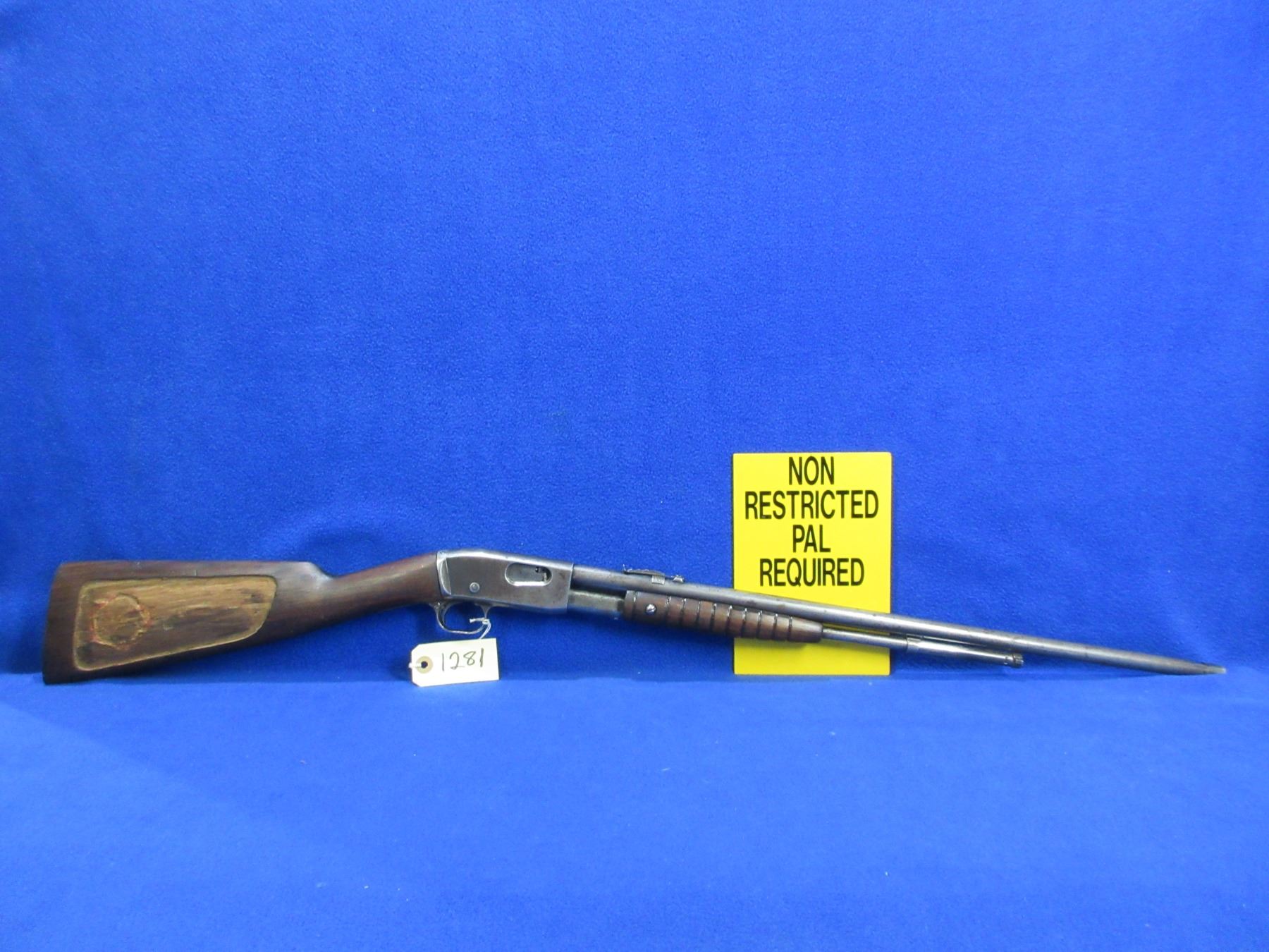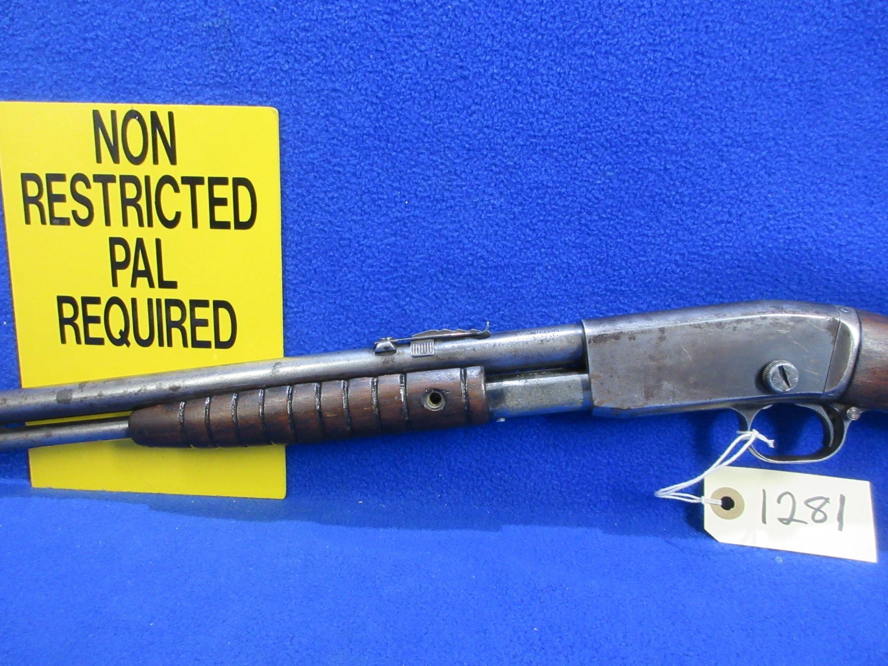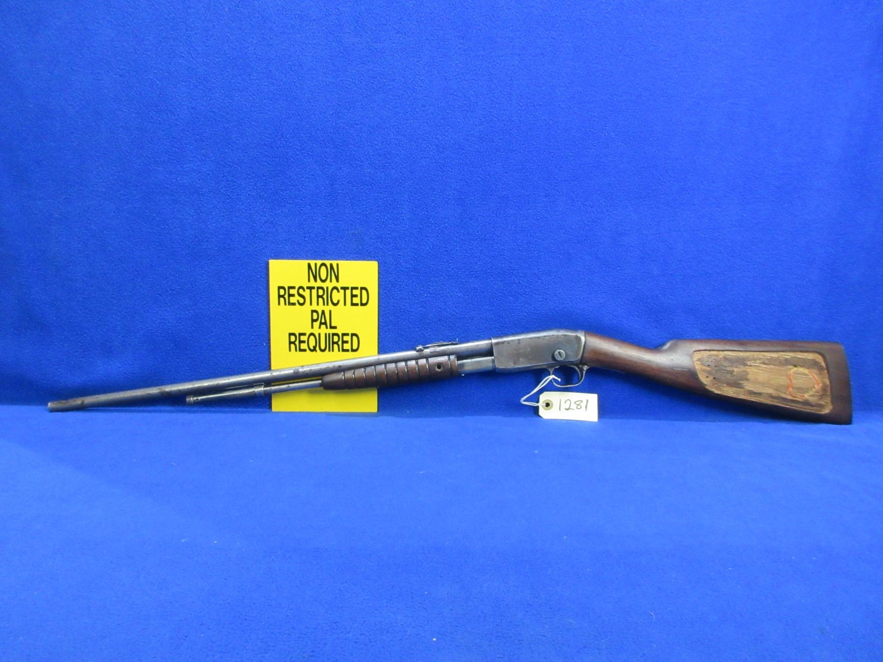 Non-Restricted - Remington Model 12 in 22 S/L/LR - This is a pump action takedown rifle with tube magazine, action appears to be in working order but it does not lock up. Barrel is 22", rifling is good, bluing is gone, has rear sight, front sight is missing, stock is good (no cracks) but both sides have a large section carved out about 1/8" deep, forearm is good but 1 screw is missing and the other is incorrect, length of pull is 13", butt plate missing. Ser # 325484