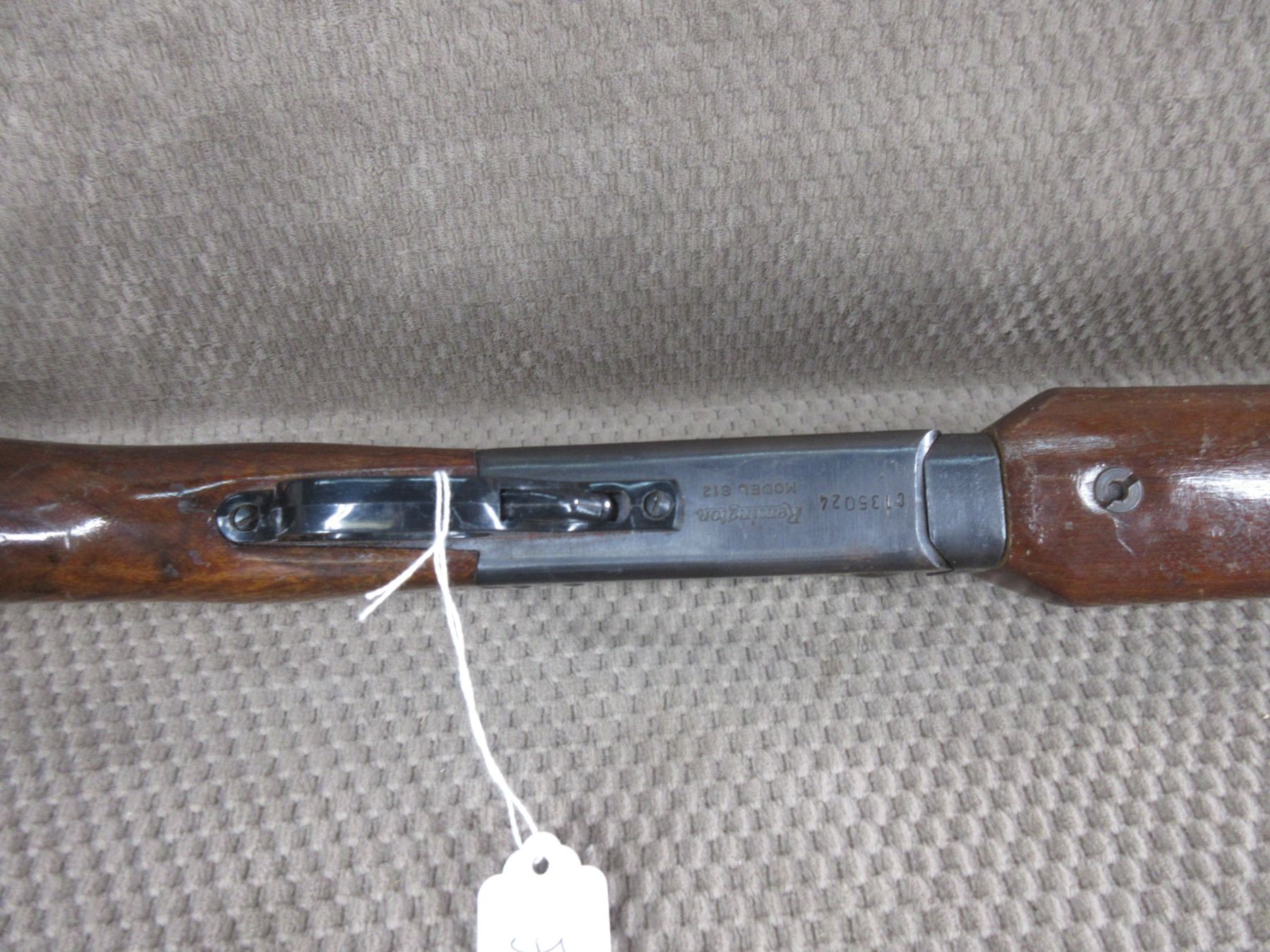 Non-Restricted - Remington Model 812 in 12 Ga 2 3/4" - This single shot tip action shotgon appears to be in good working order. Barrel is 30", bore is good to very good, bluing is good with some surface rust, has front bead, wood has various usage marks, stock has been shortened by 2 to 3 inches plus the rubber recoil pad and has a repaired chip on toe.