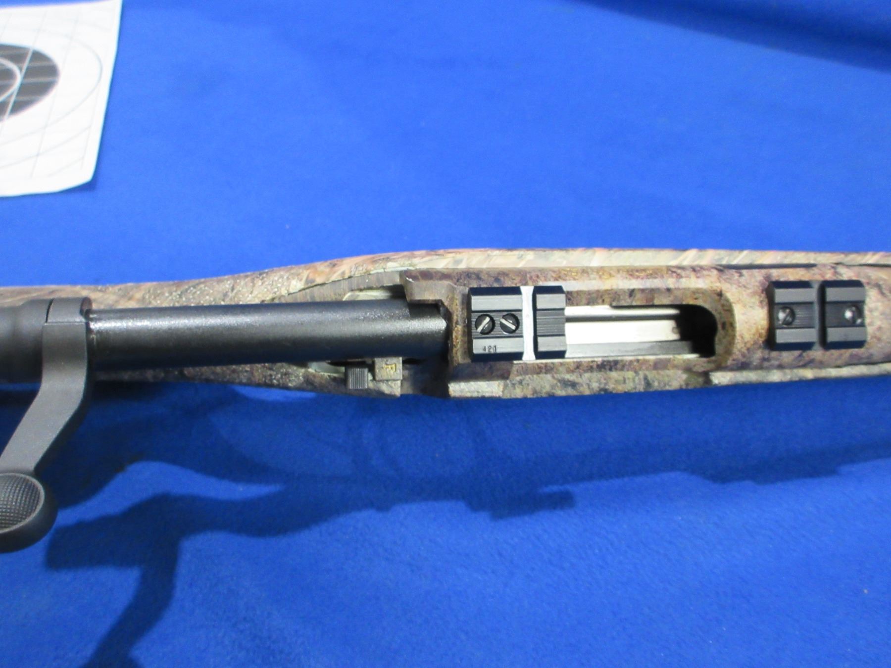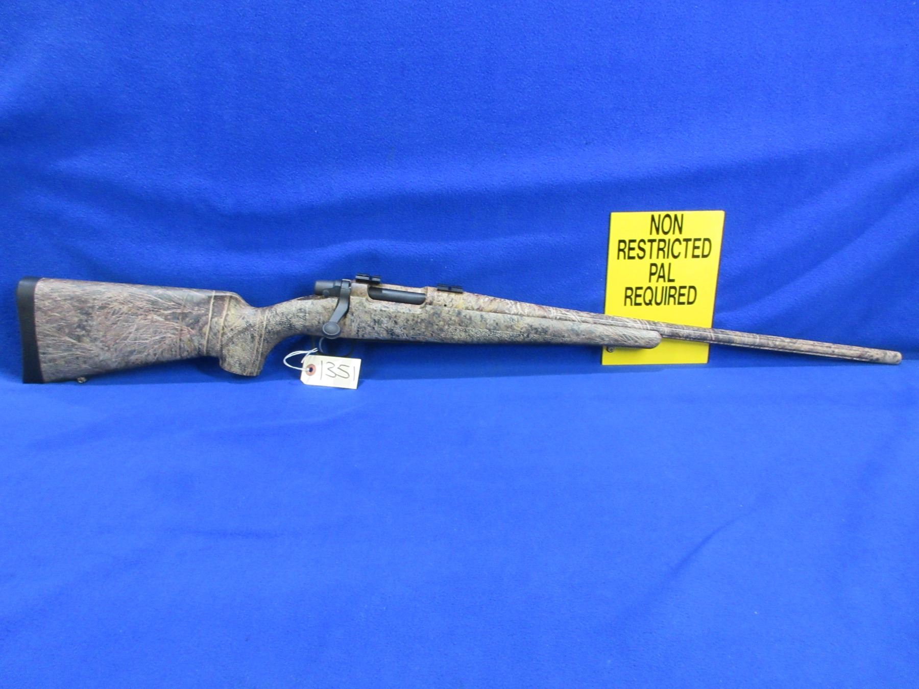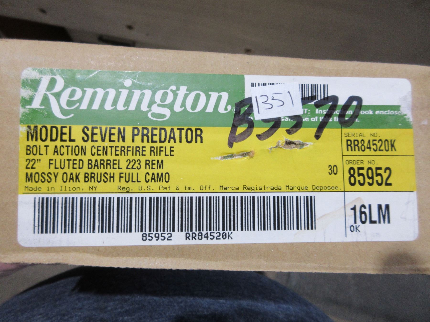 Non-Restricted - Remington Model Seven in 223 Rem - This bolt action rifle with floorplate magazine appears to be in like-new condition. Camo fluted barrel is 22", rifling is very good, Mossy Oak Brush full camo finish very good, has no sights but has Weaver style bases, stock is very good, rubber recoil pad very good, comes with swivel studs, original box and owners manual. Ser #RR84520K