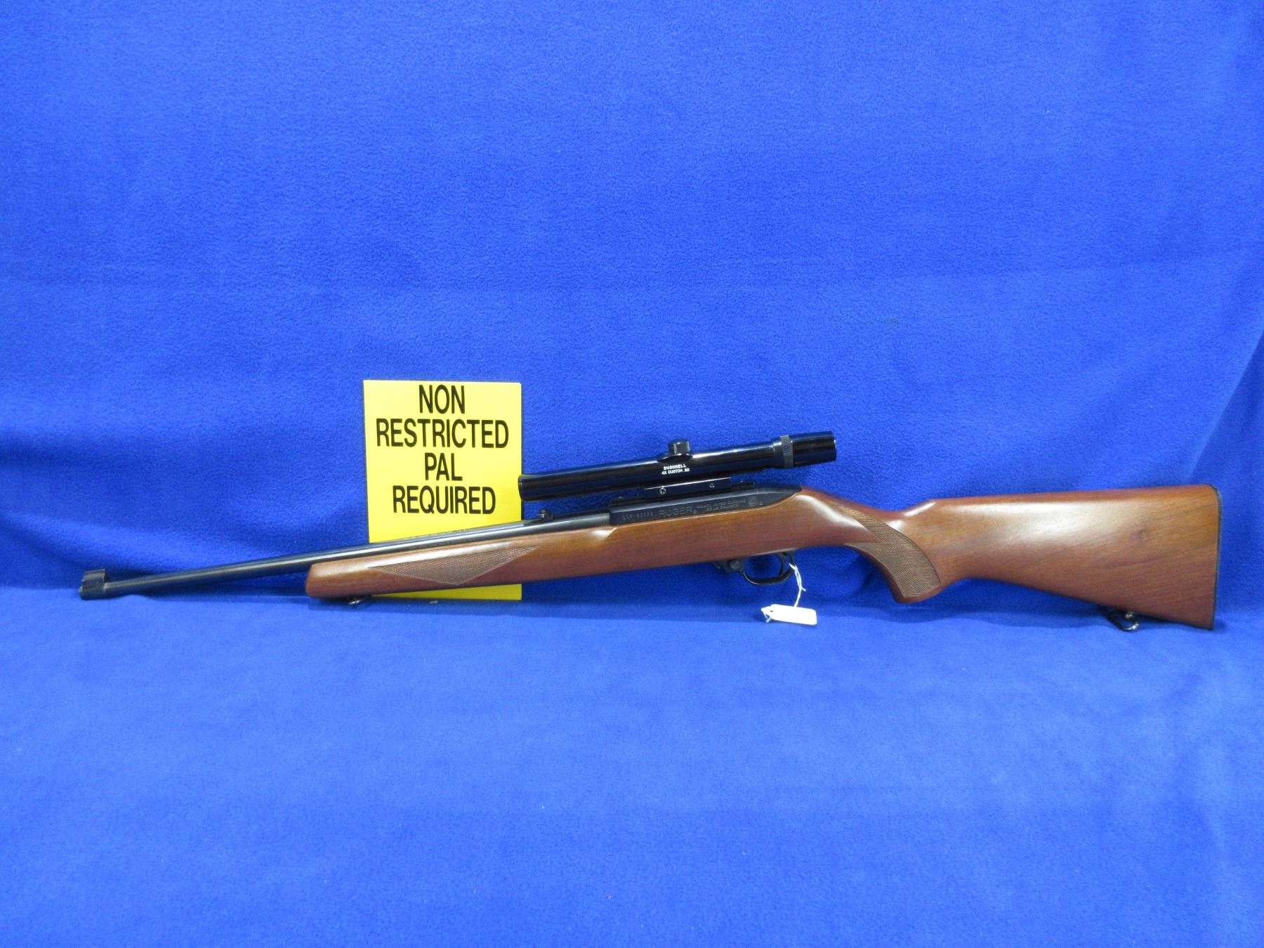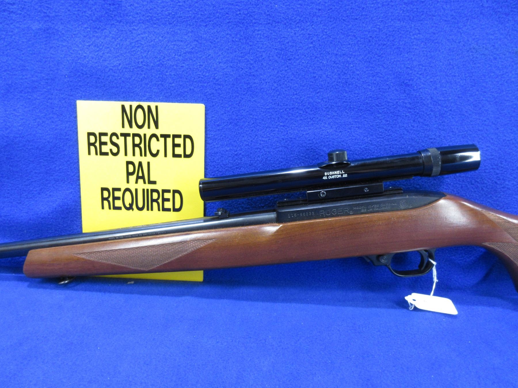 Non-Restricted - Ruger Model 10/22 Carbine in 22 LR - This semi-auto rifle with magazine appears to be in good to very good working order. Barrel is 18 1/2", rifling is very good, bluing is very good, has both sights and Bushnell 4X custom 22 scope - fine crosshair - appears clear, stock good to very good, butt plate very good, comes with swivels. Ser # 115-96232